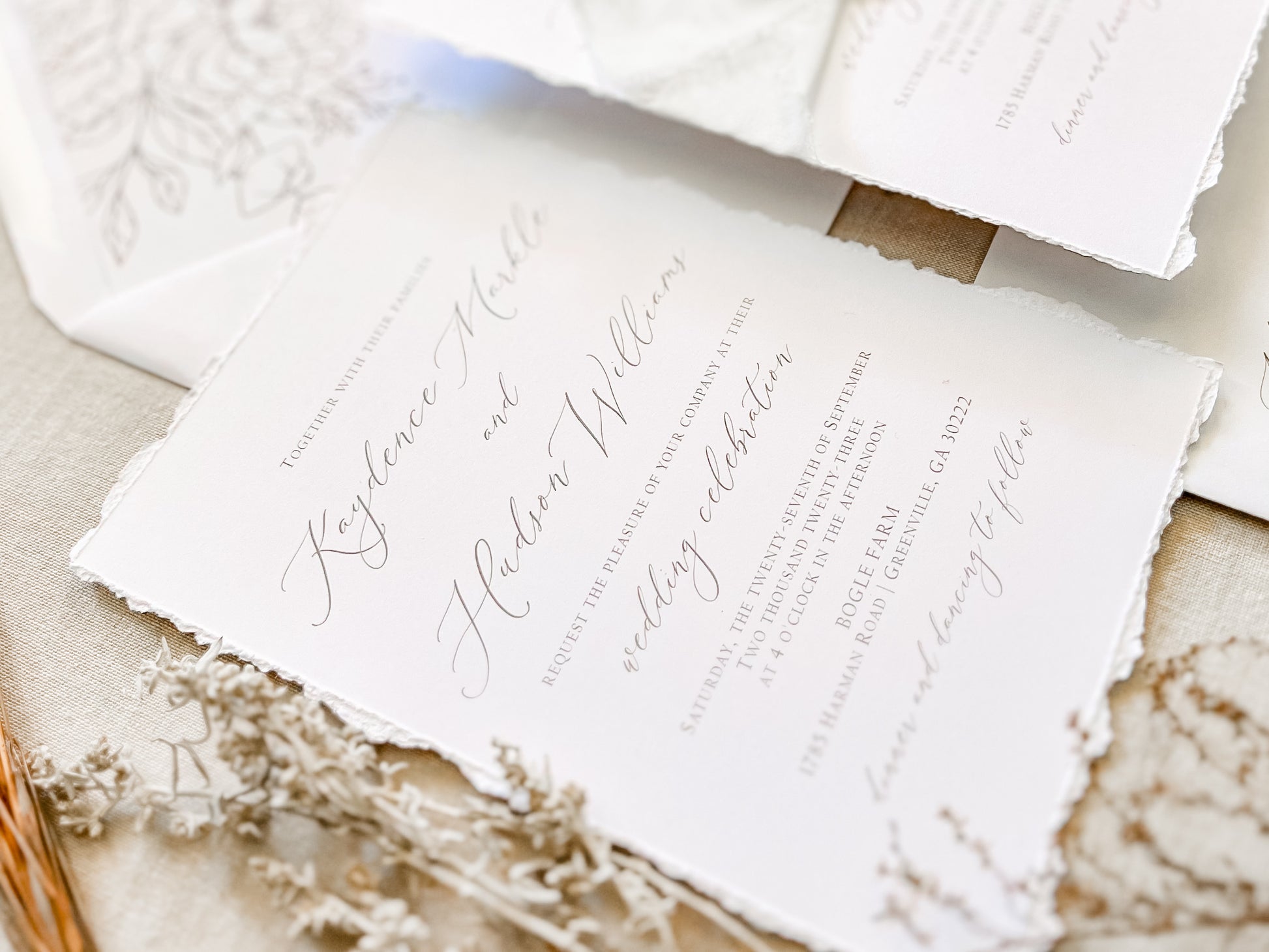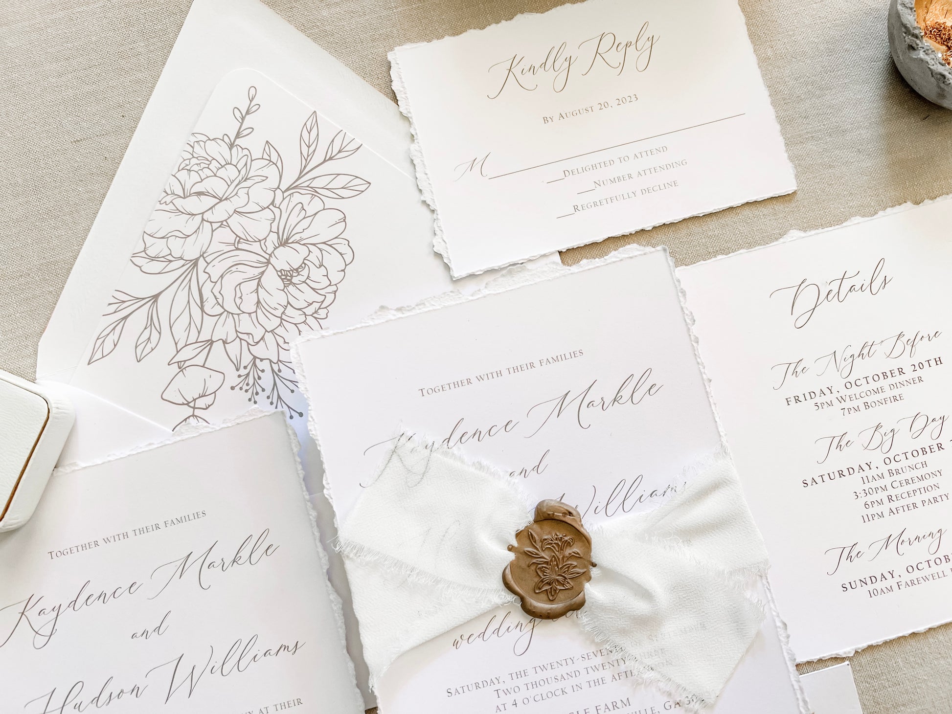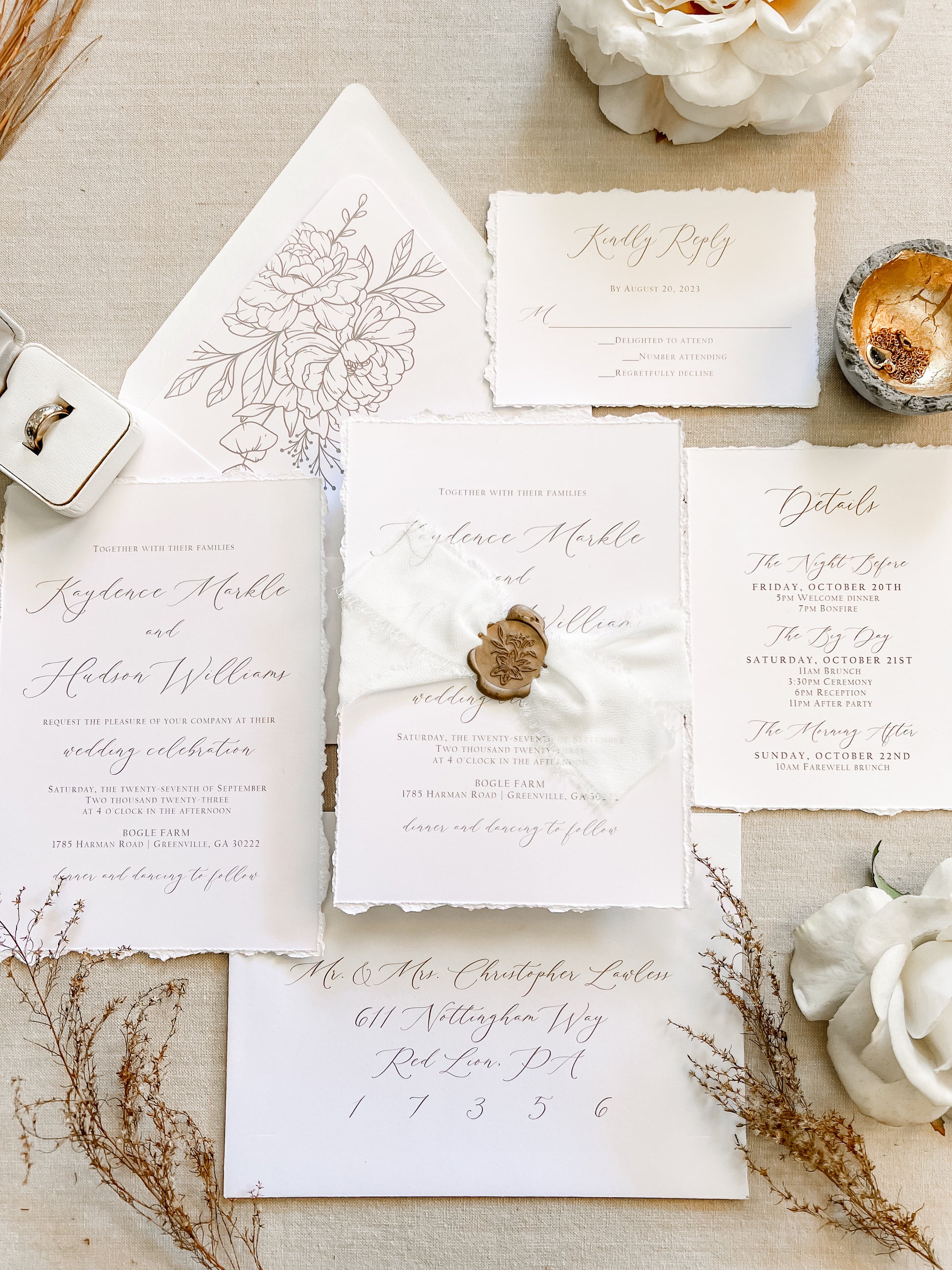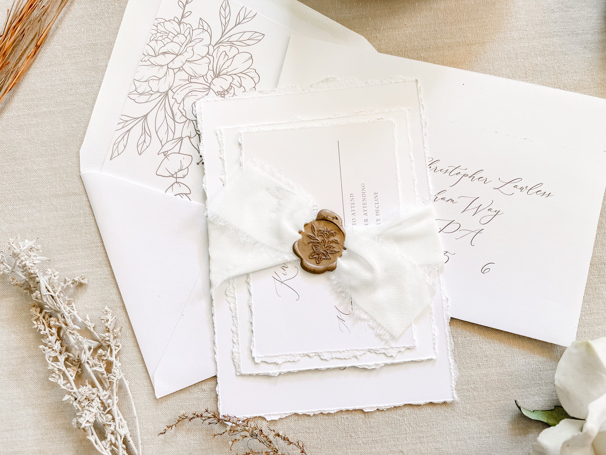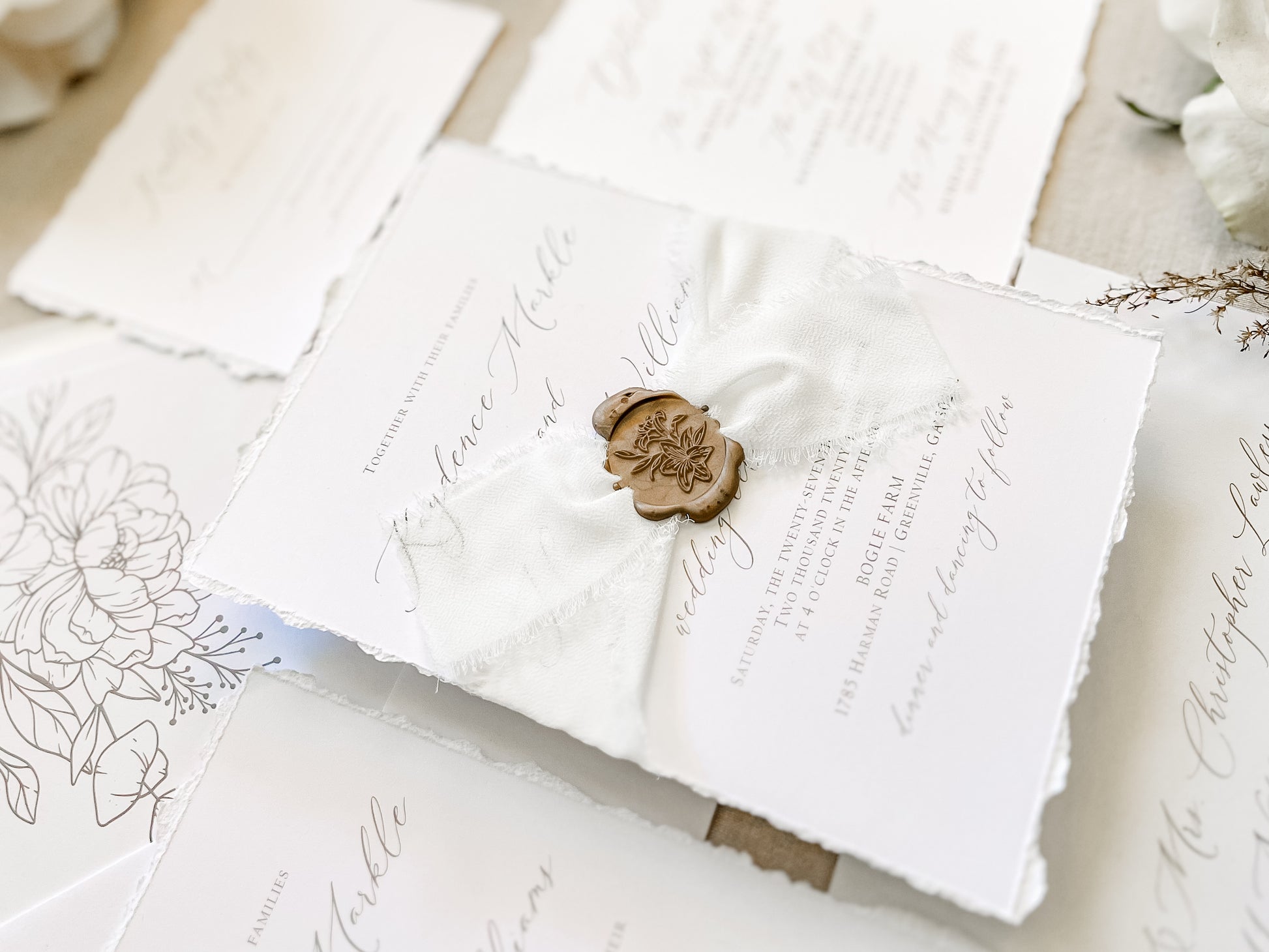 Classic Elegant Wedding Invitation with Deckled Edging, White Chiffon Ribbon & Wax Seal