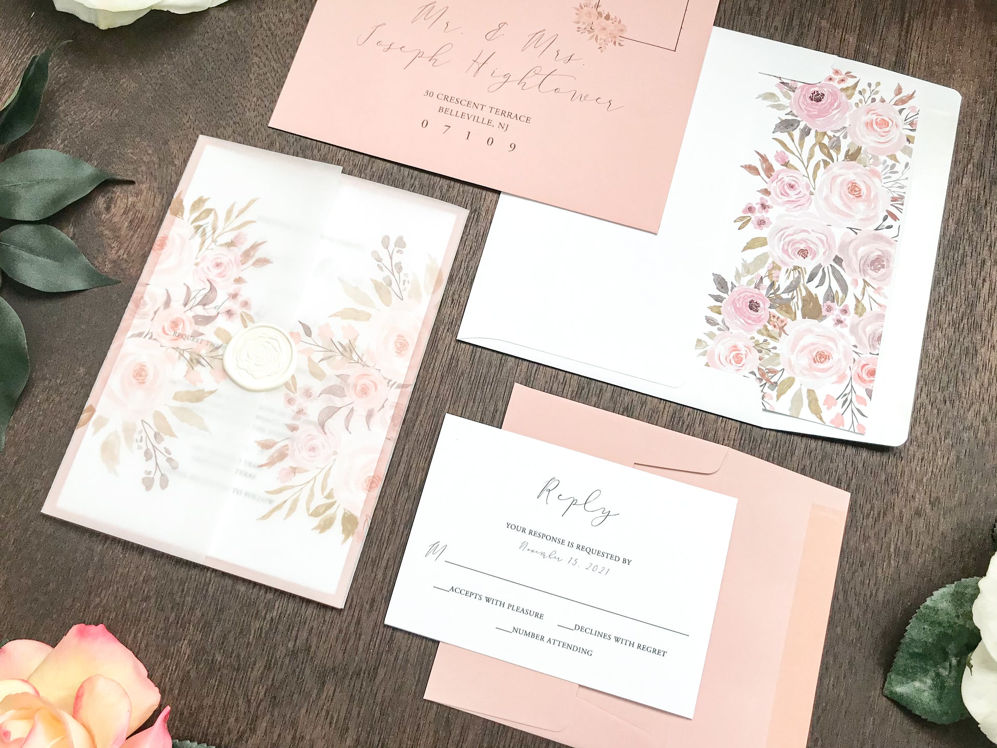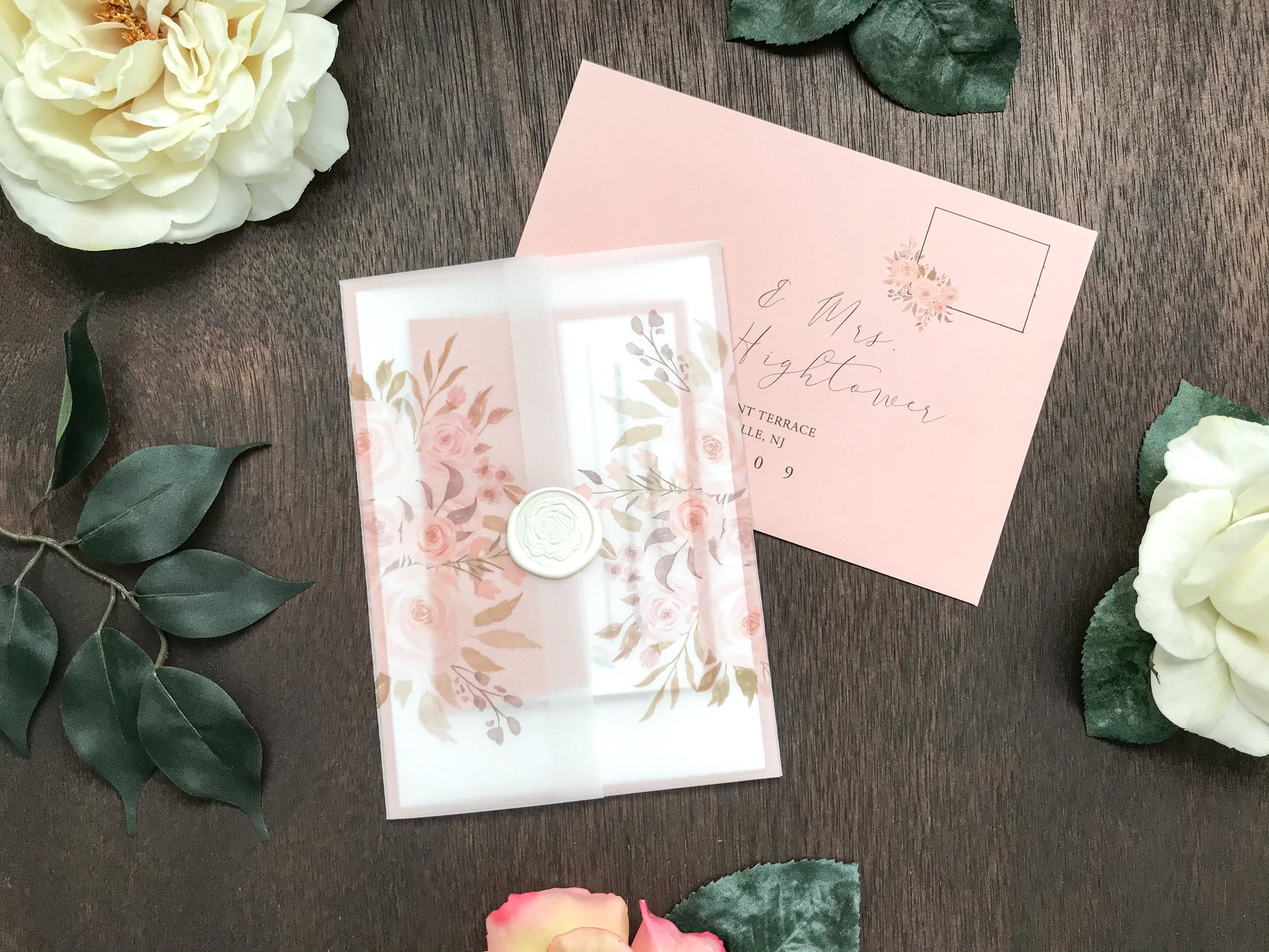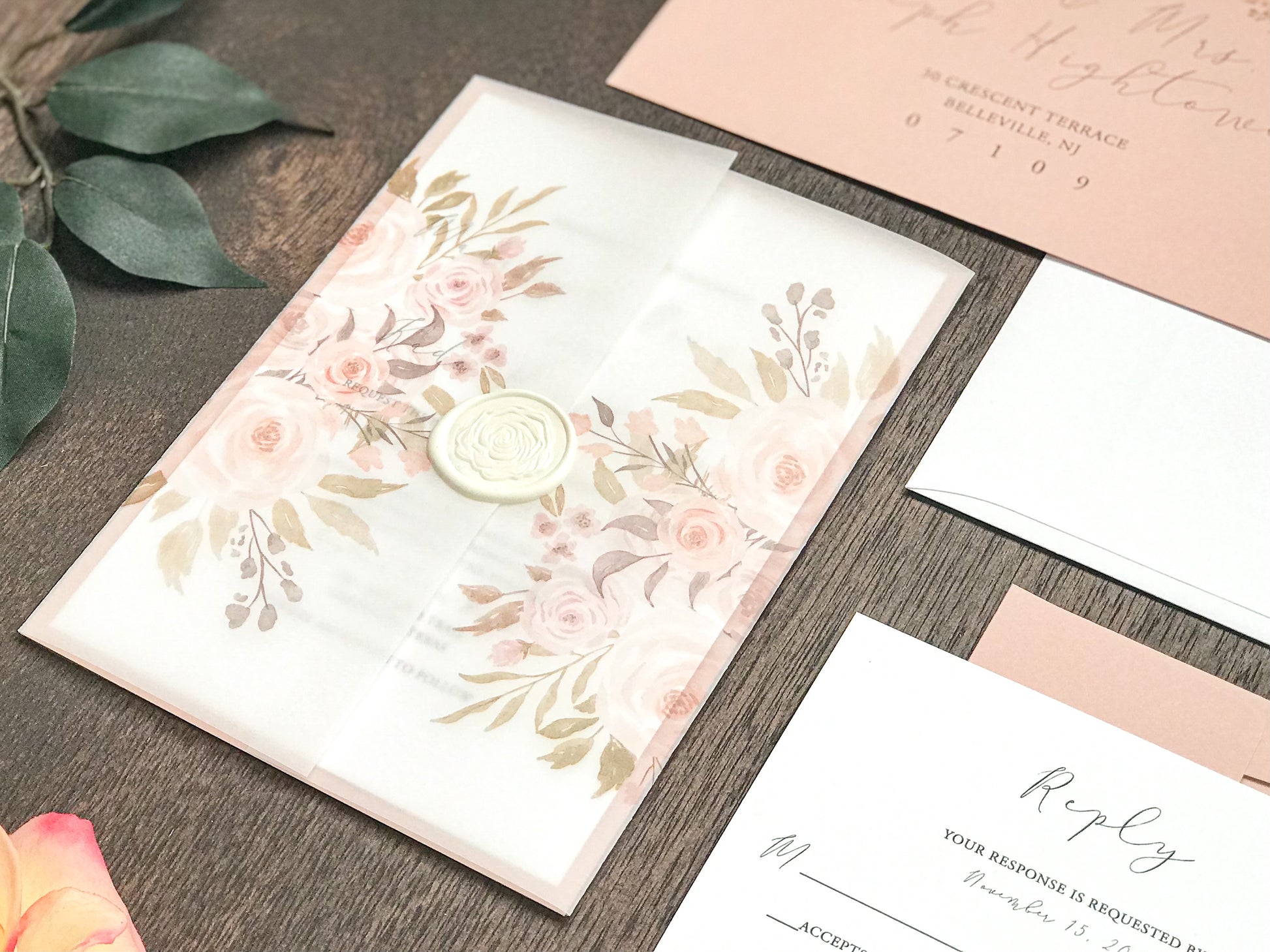 Blush Pink Floral Wedding Invitation with Vellum and Wax Seal
