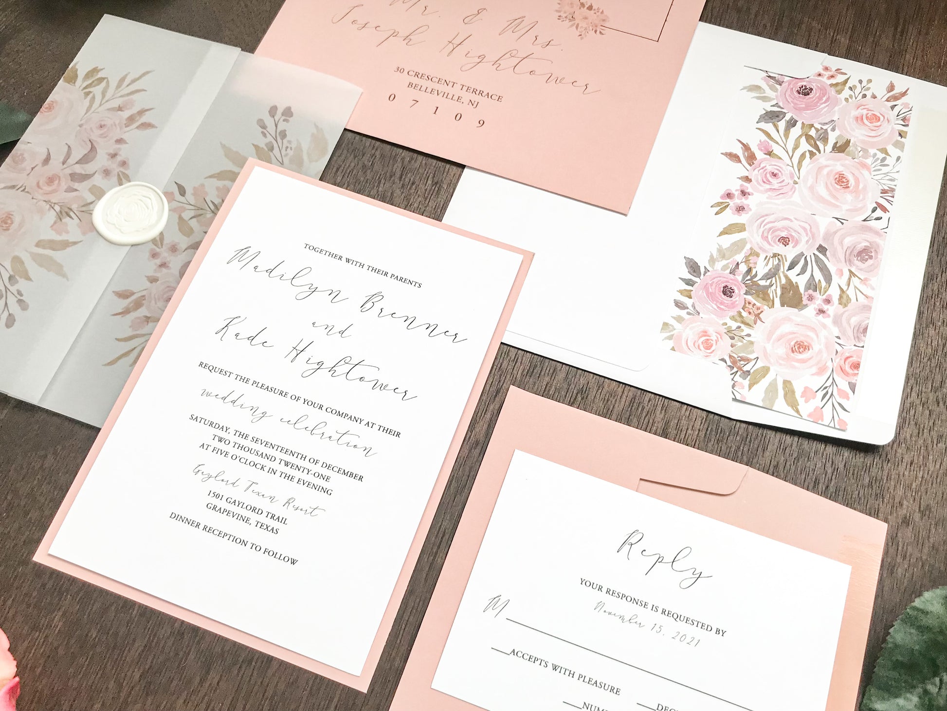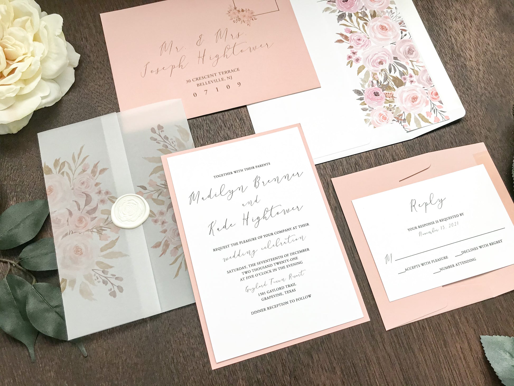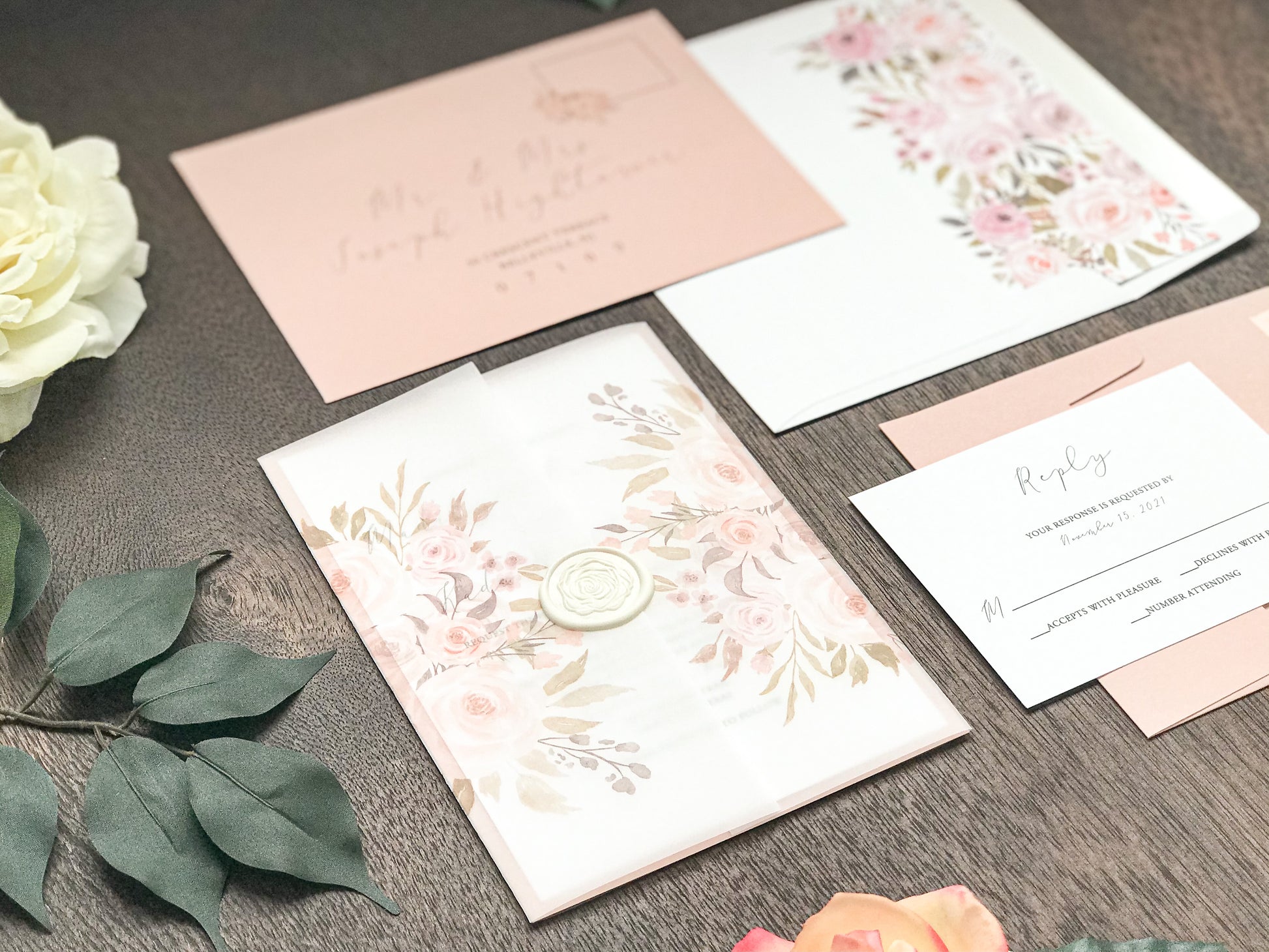 Blush Pink Floral Wedding Invitation with Vellum and Wax Seal