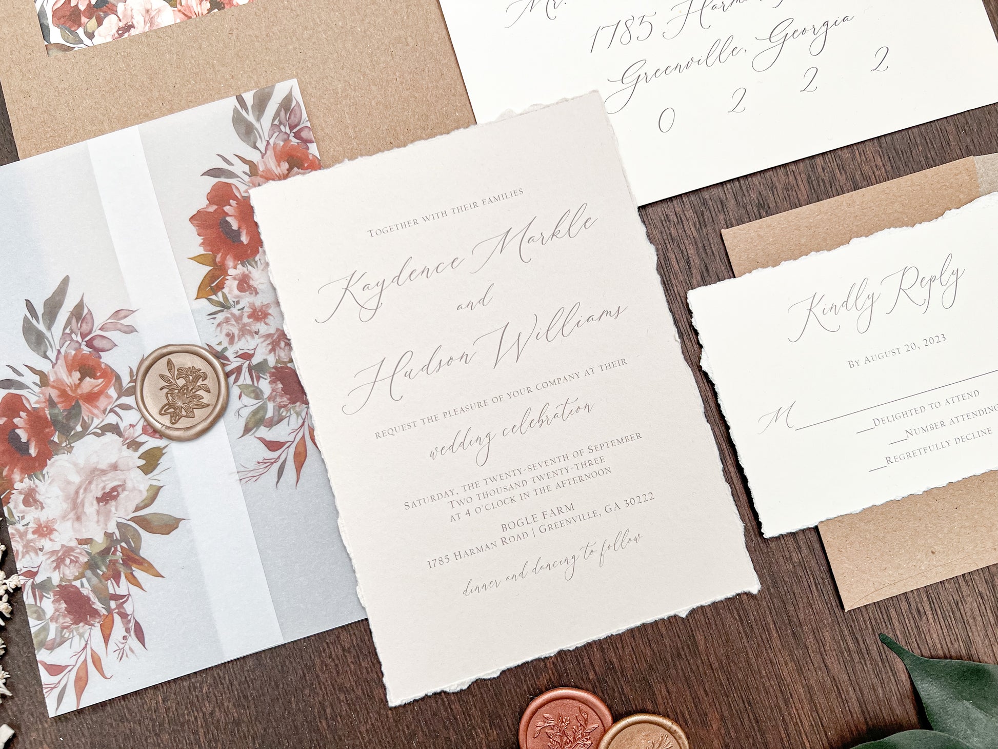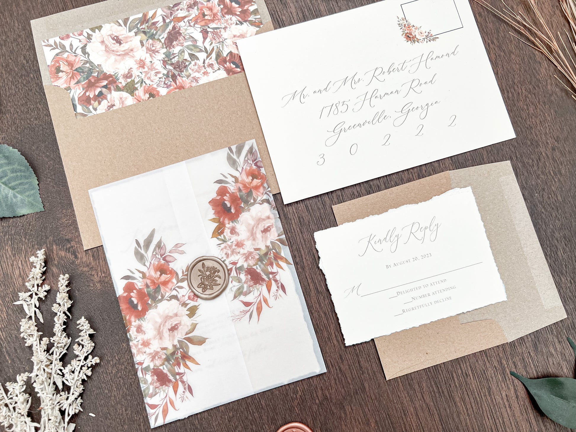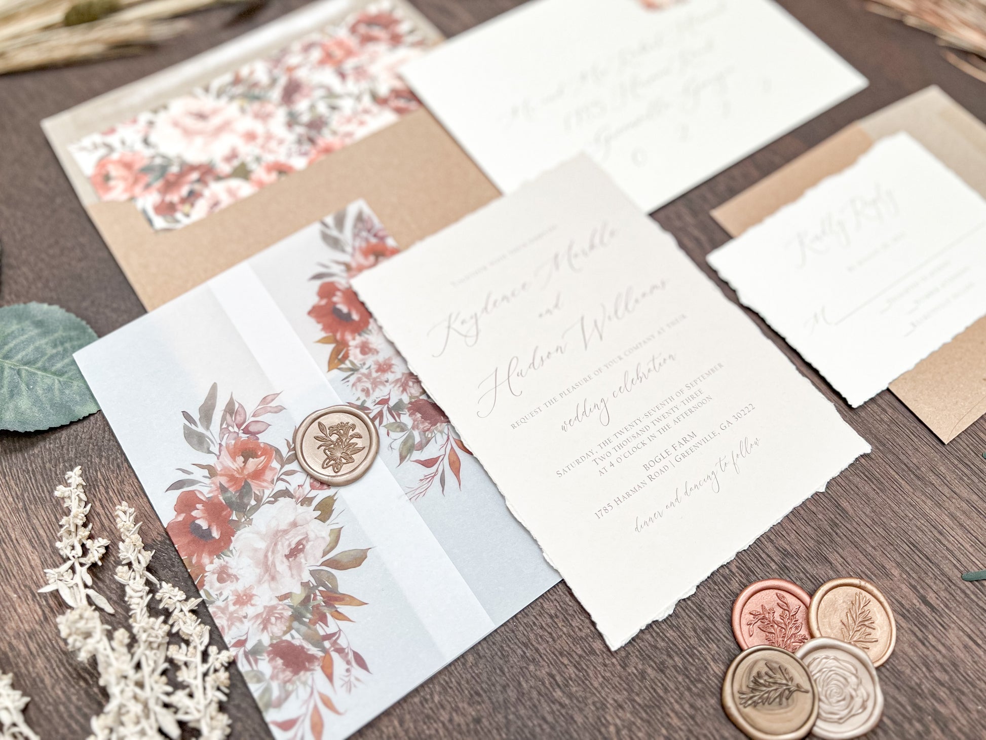 Boho Fall Floral Wedding Invitation with Deckled Edging, Vellum & Wax Seal