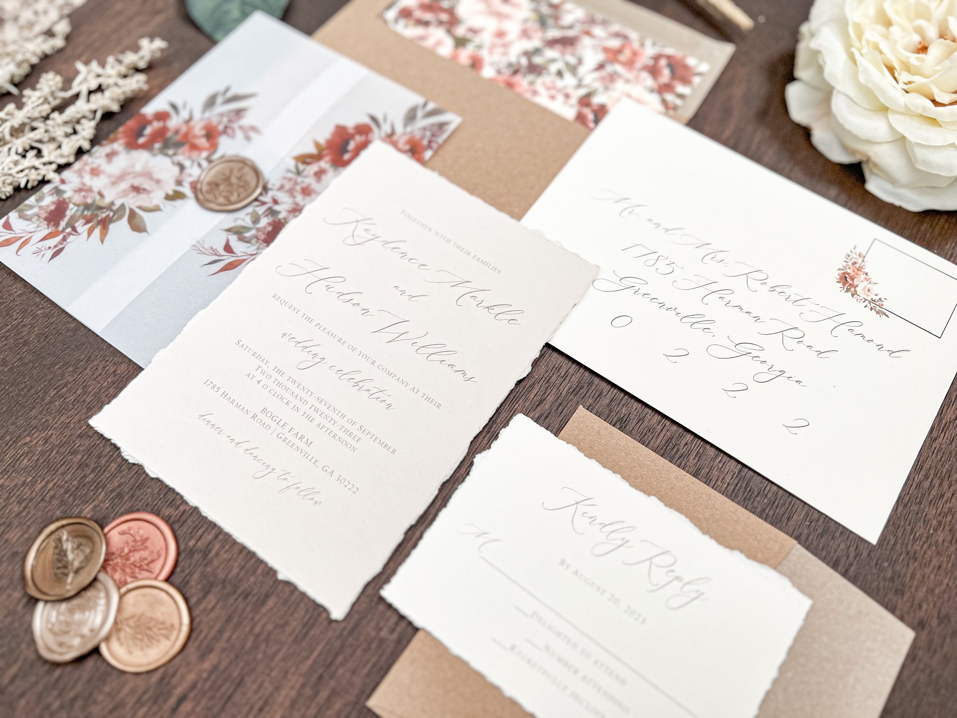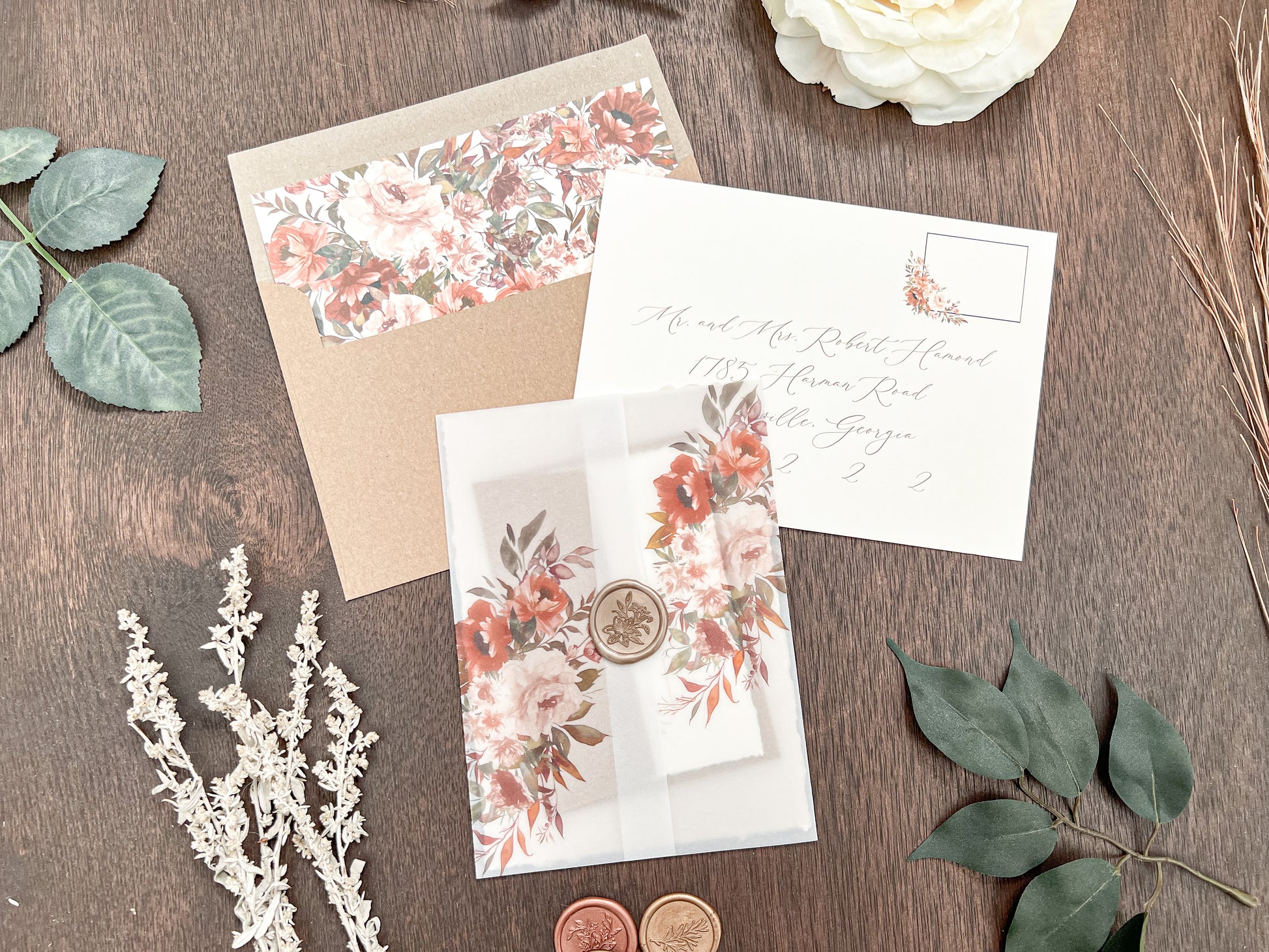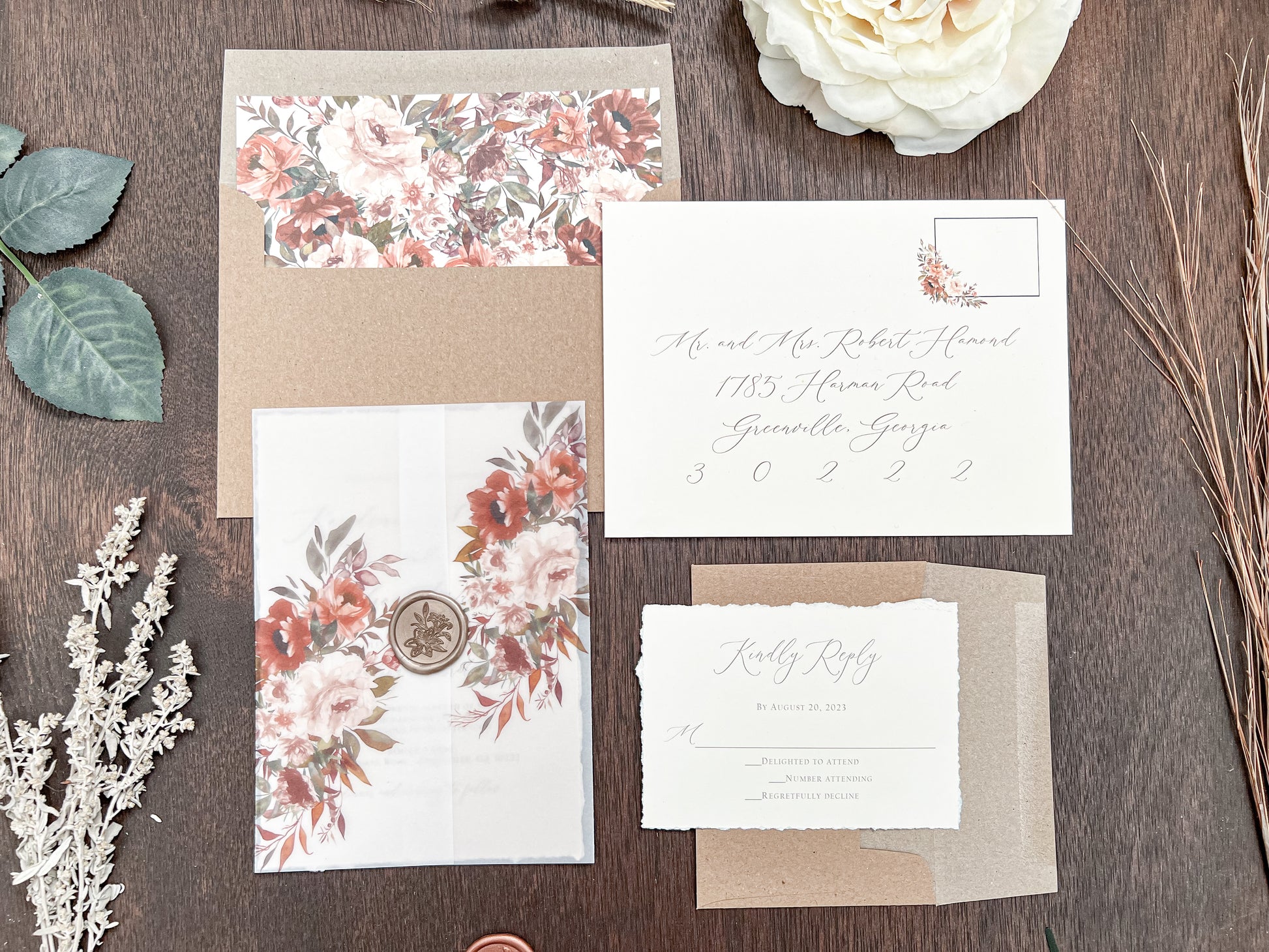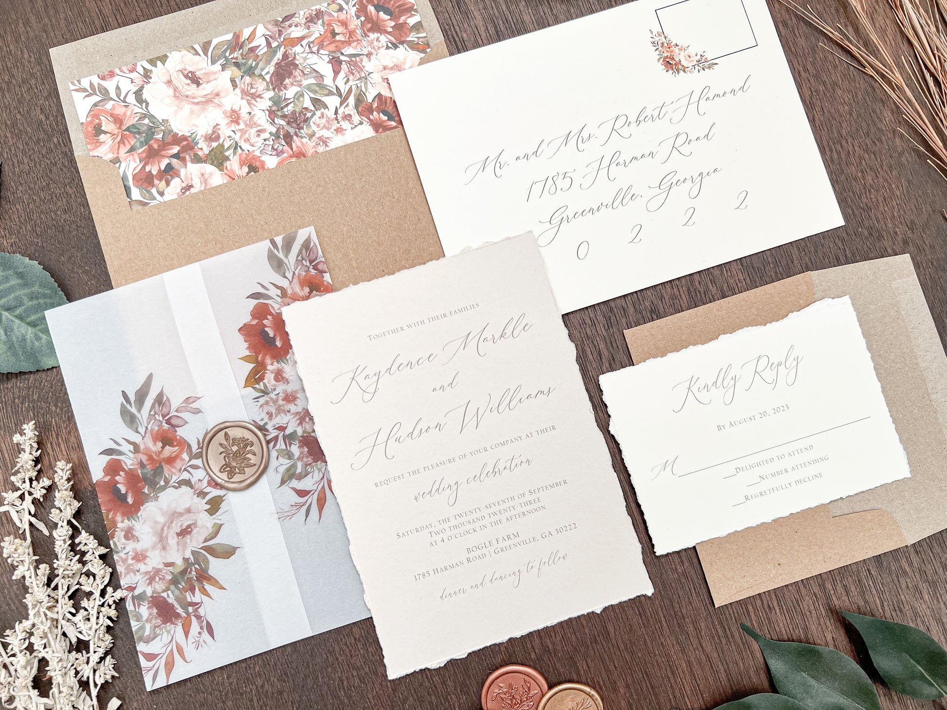 Boho Fall Floral Wedding Invitation with Deckled Edging, Vellum & Wax Seal