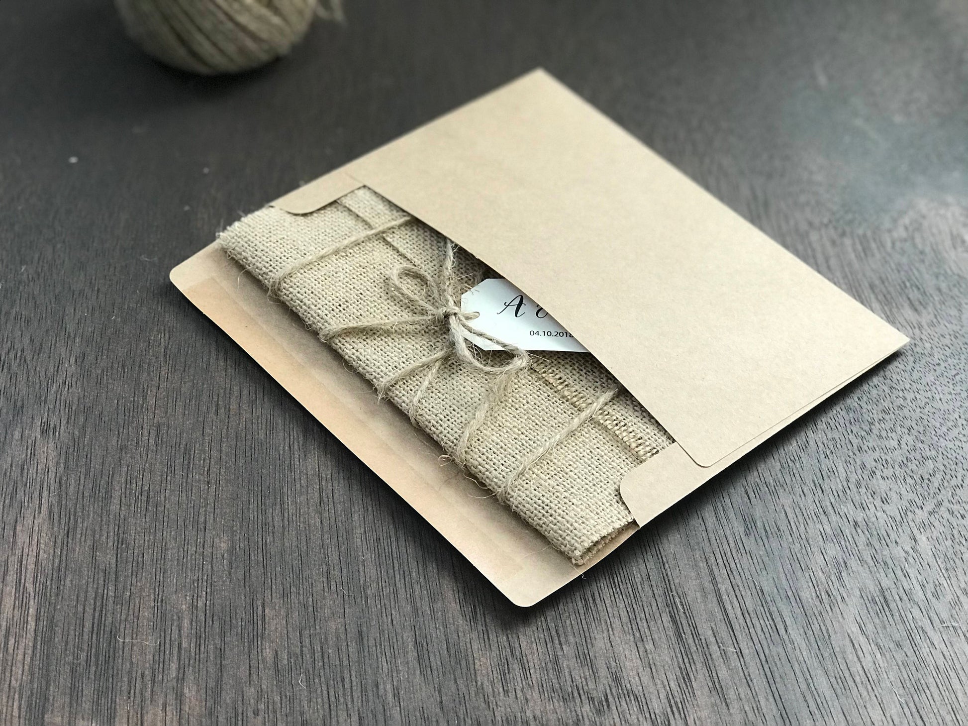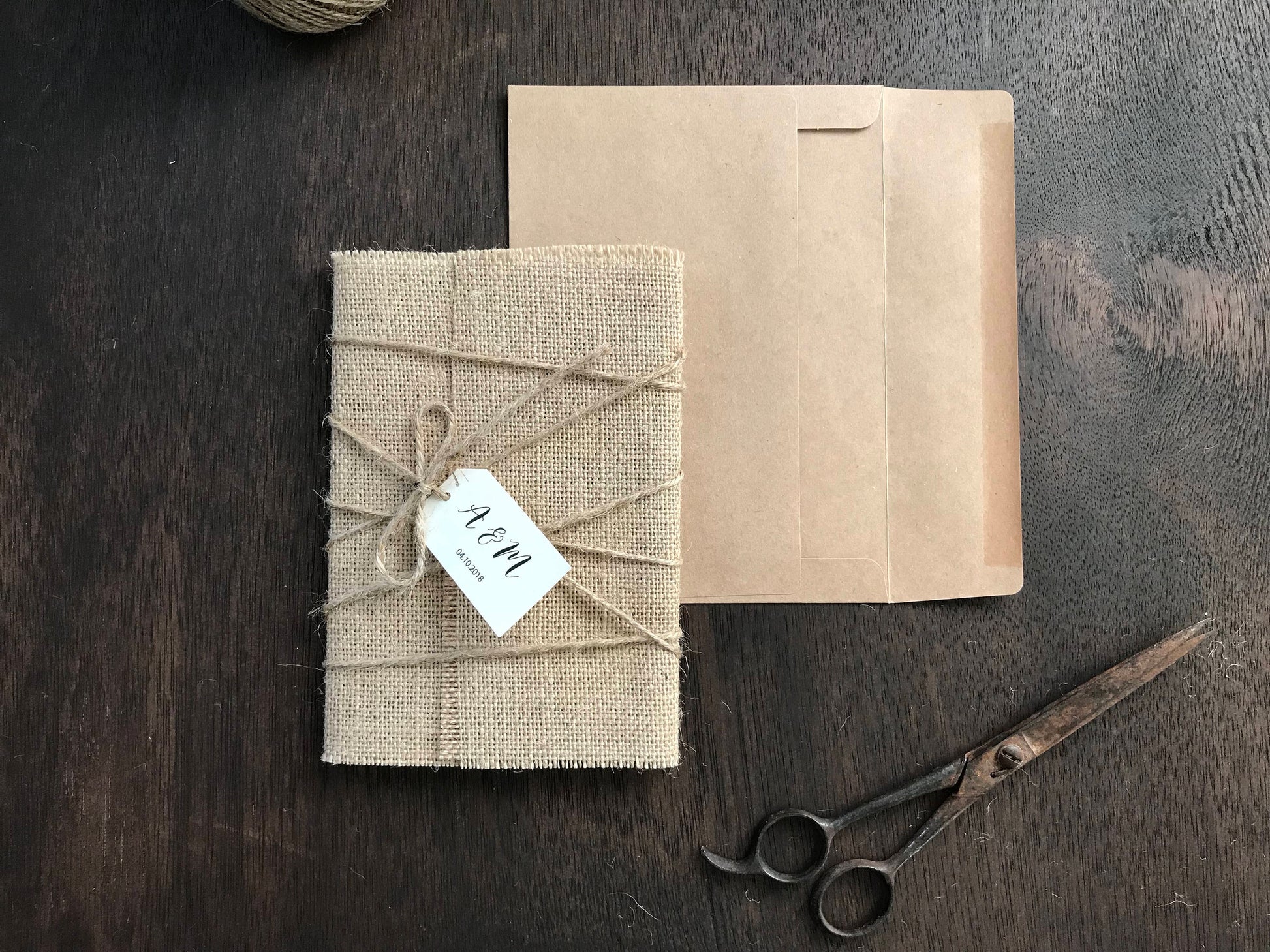This rustic wedding invitation is wrapped in natural burlap and tied with twine, creating a grounded and cozy look for country or barn-style weddings. Simple, tactile, and full of charm! This 5 x 7 invitation is printed on ivory cover stock and pasted to a kraft backer. Please remember that burlap is an imperfect and crooked material. There will be frayed edges at times – this is one reason burlap gives such a unique and rustic look!