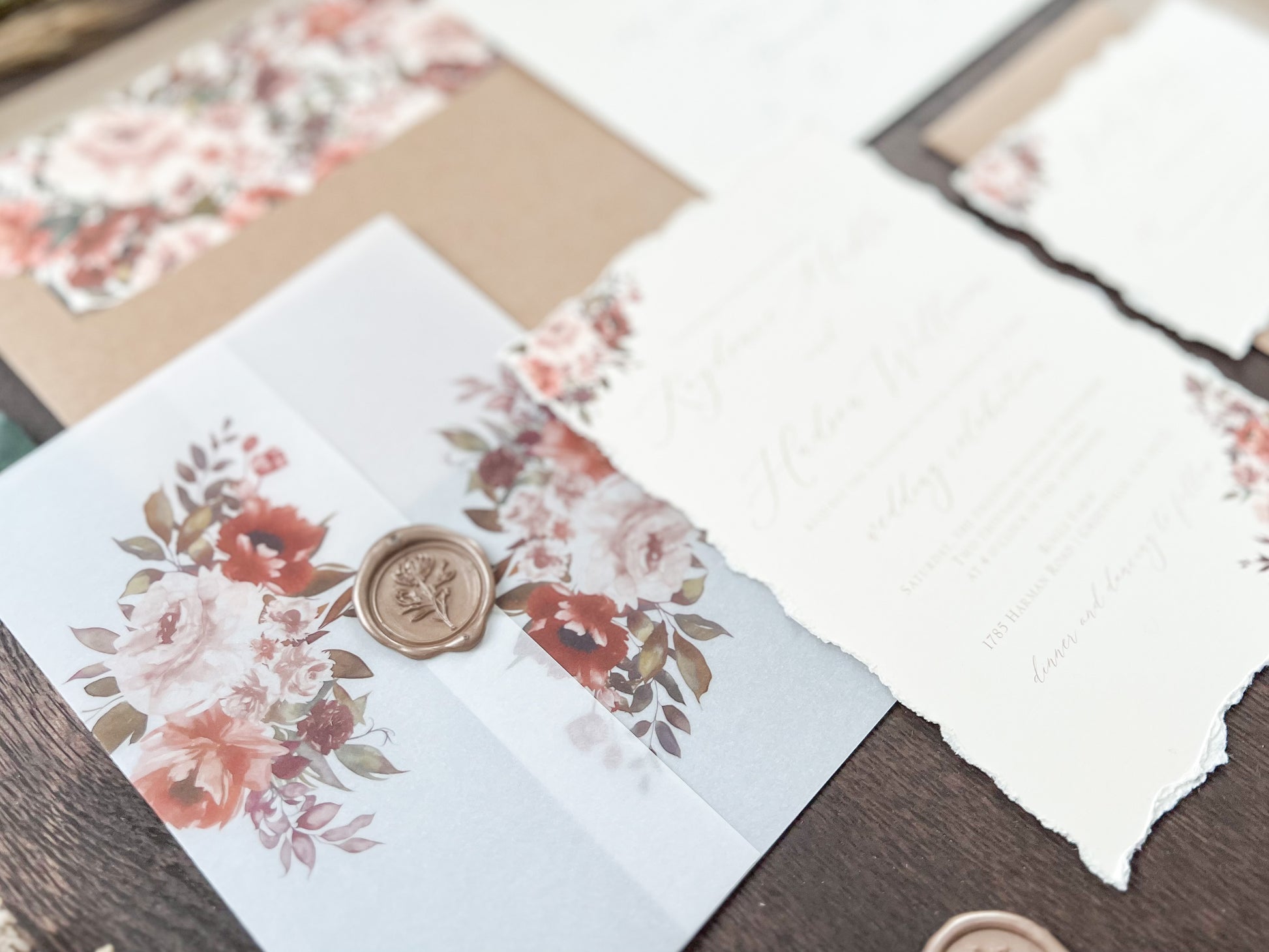 Copper & Rust Foliage Boho Wedding Invitation with Deckled Edging, Vellum & Wax Seal