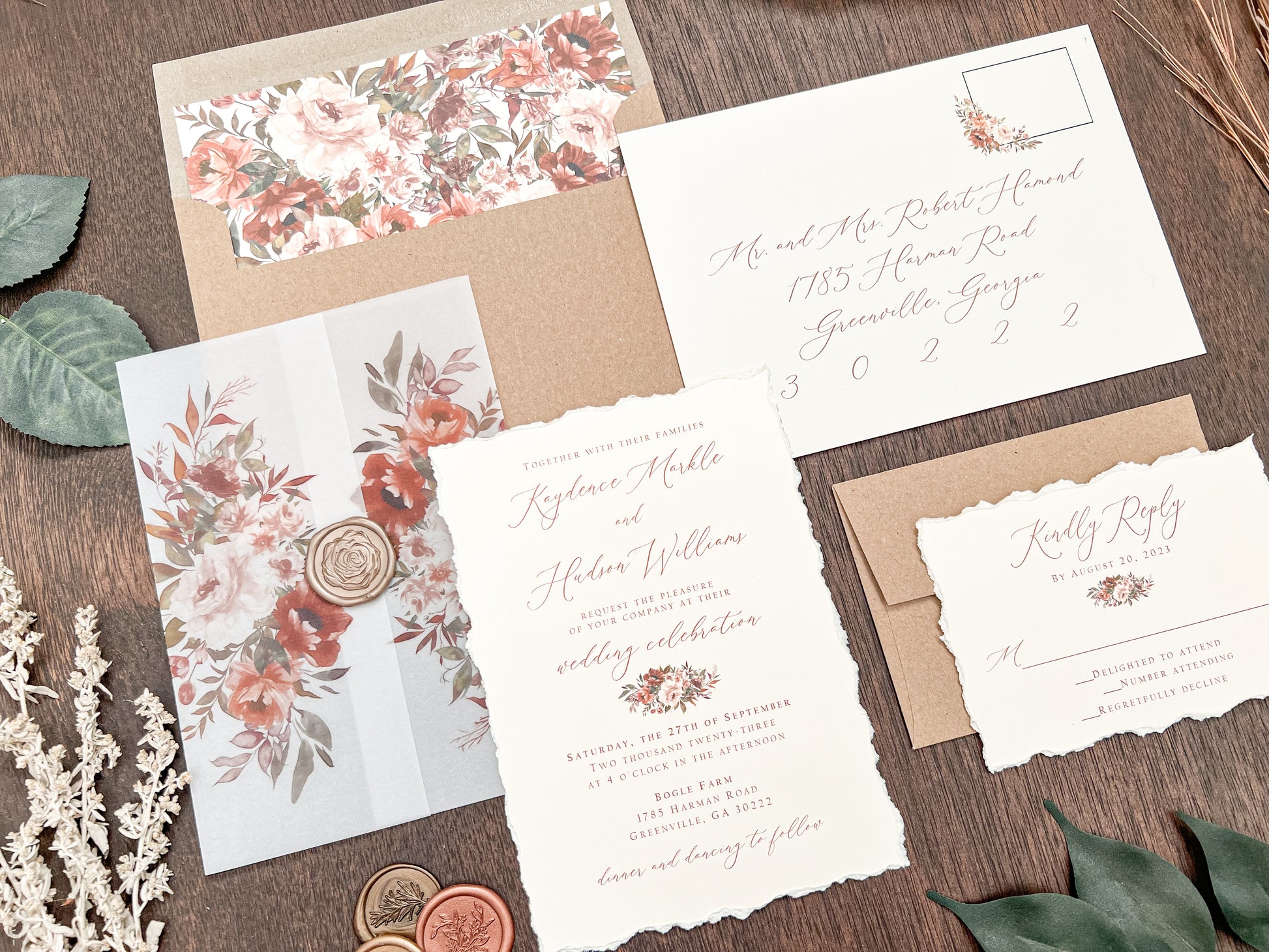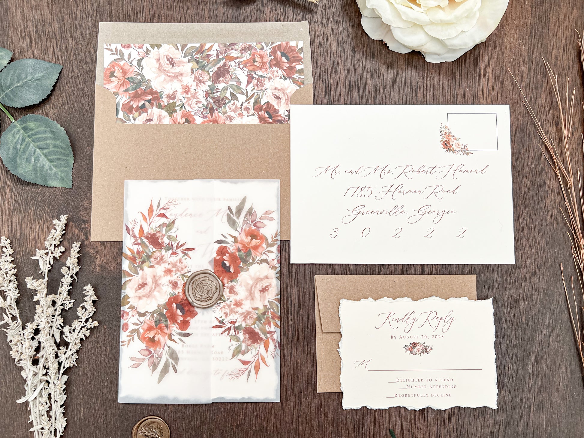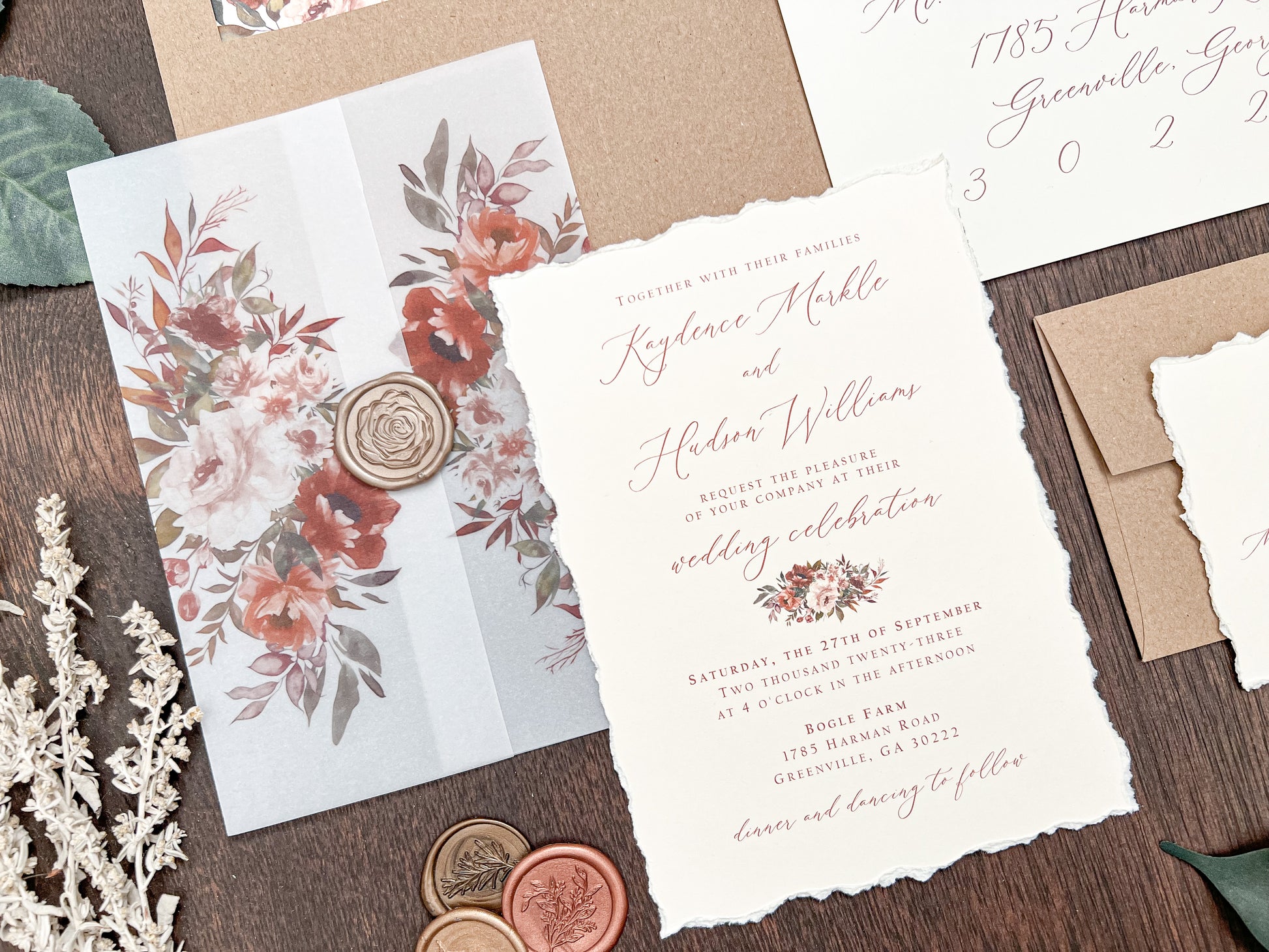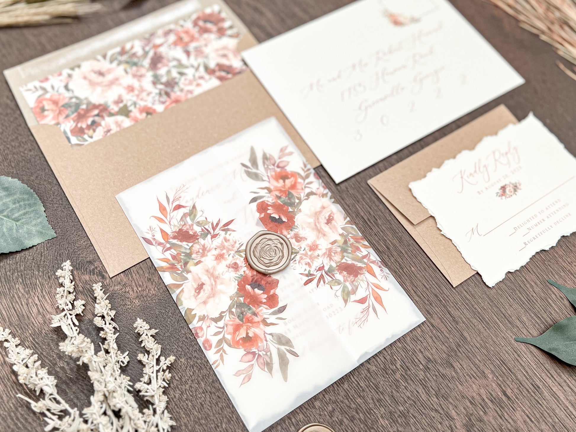 Boho Wedding Invitation with Copper, Rust Burnt Orange Flowers, Deckled Edging, Vellum & Wax Seal