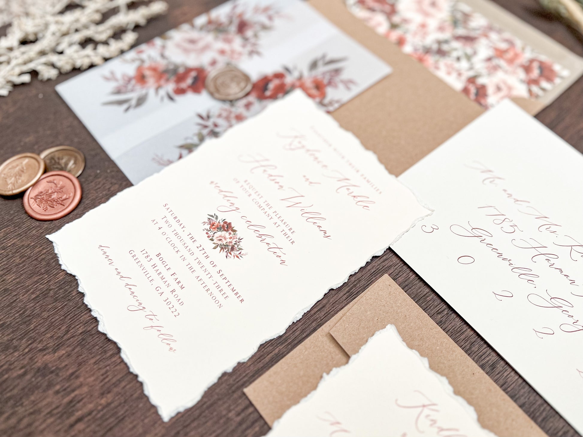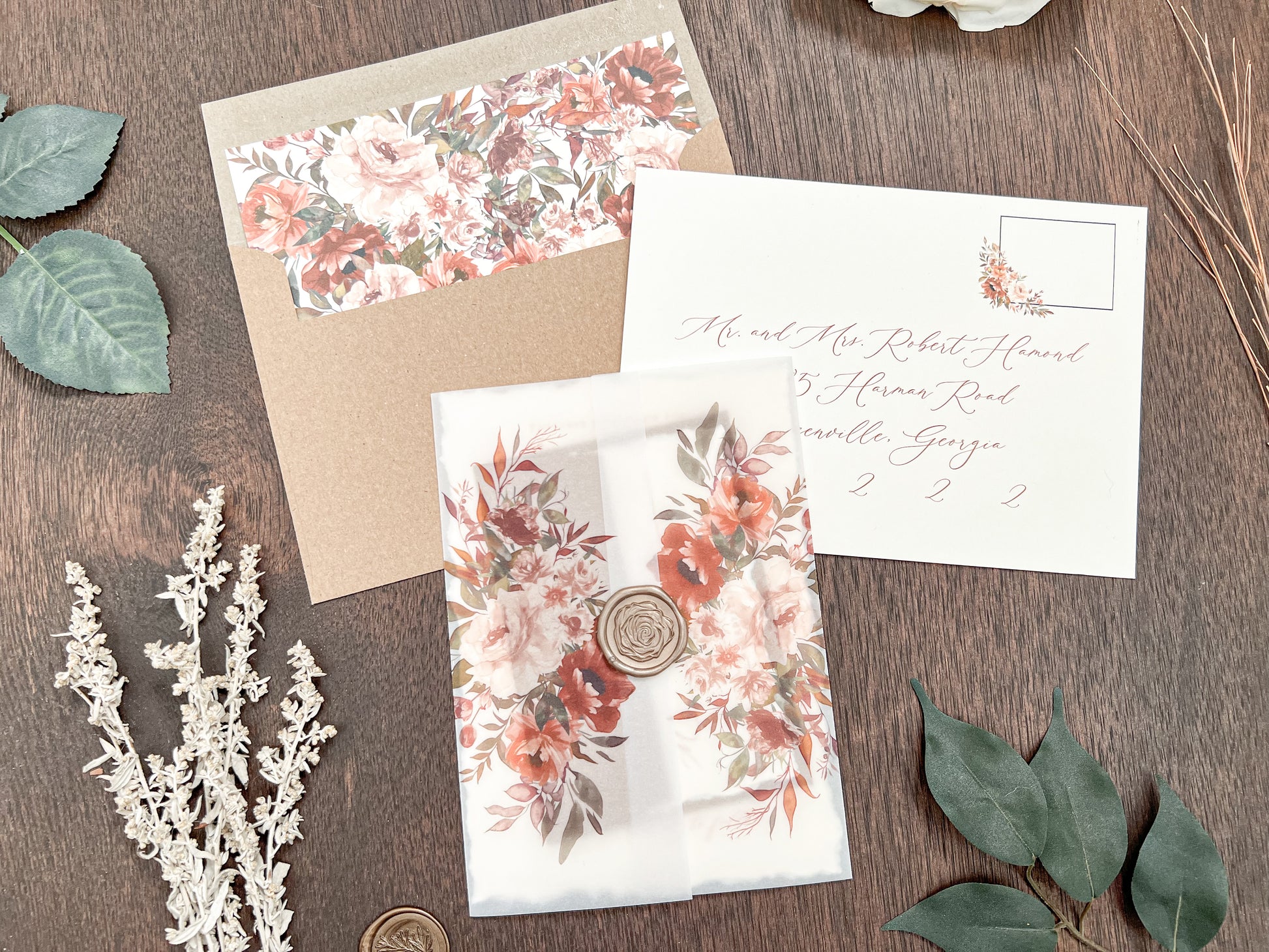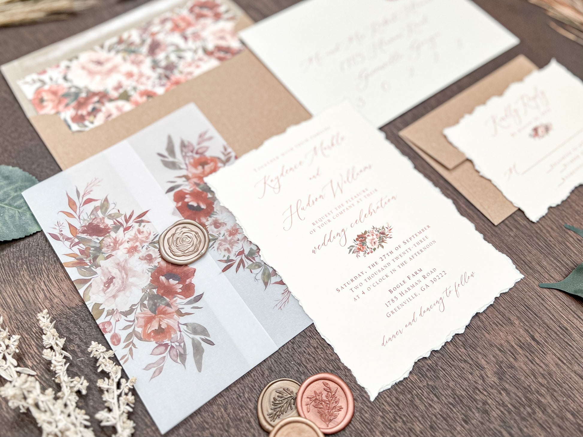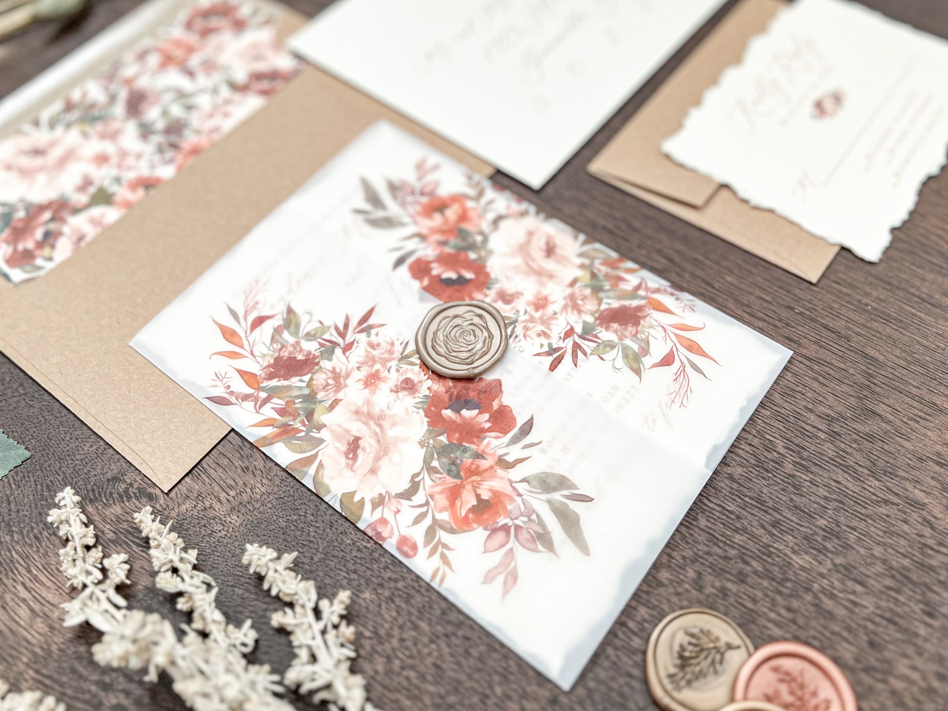 Boho Wedding Invitation with Copper, Rust Burnt Orange Flowers, Deckled Edging, Vellum & Wax Seal