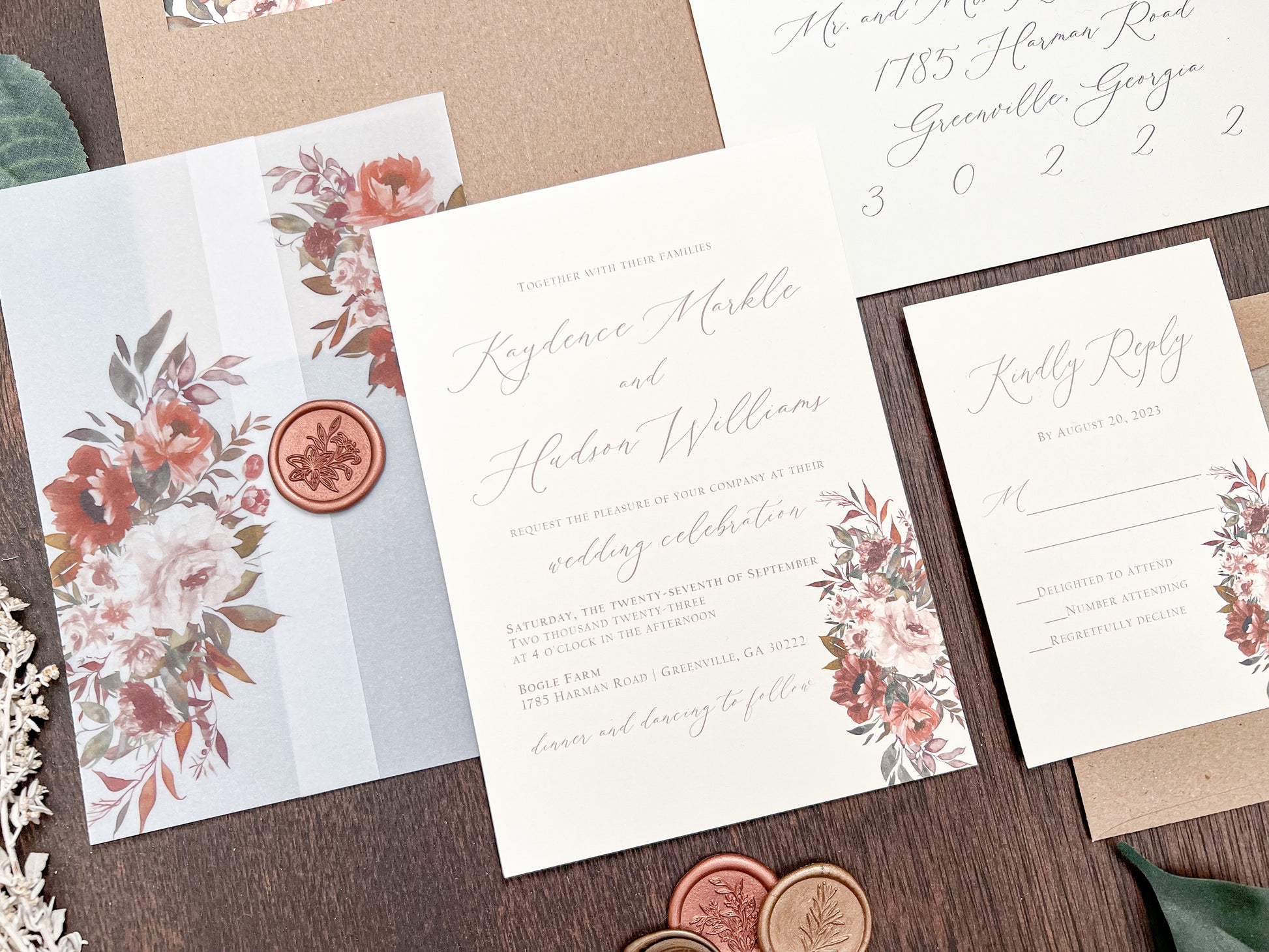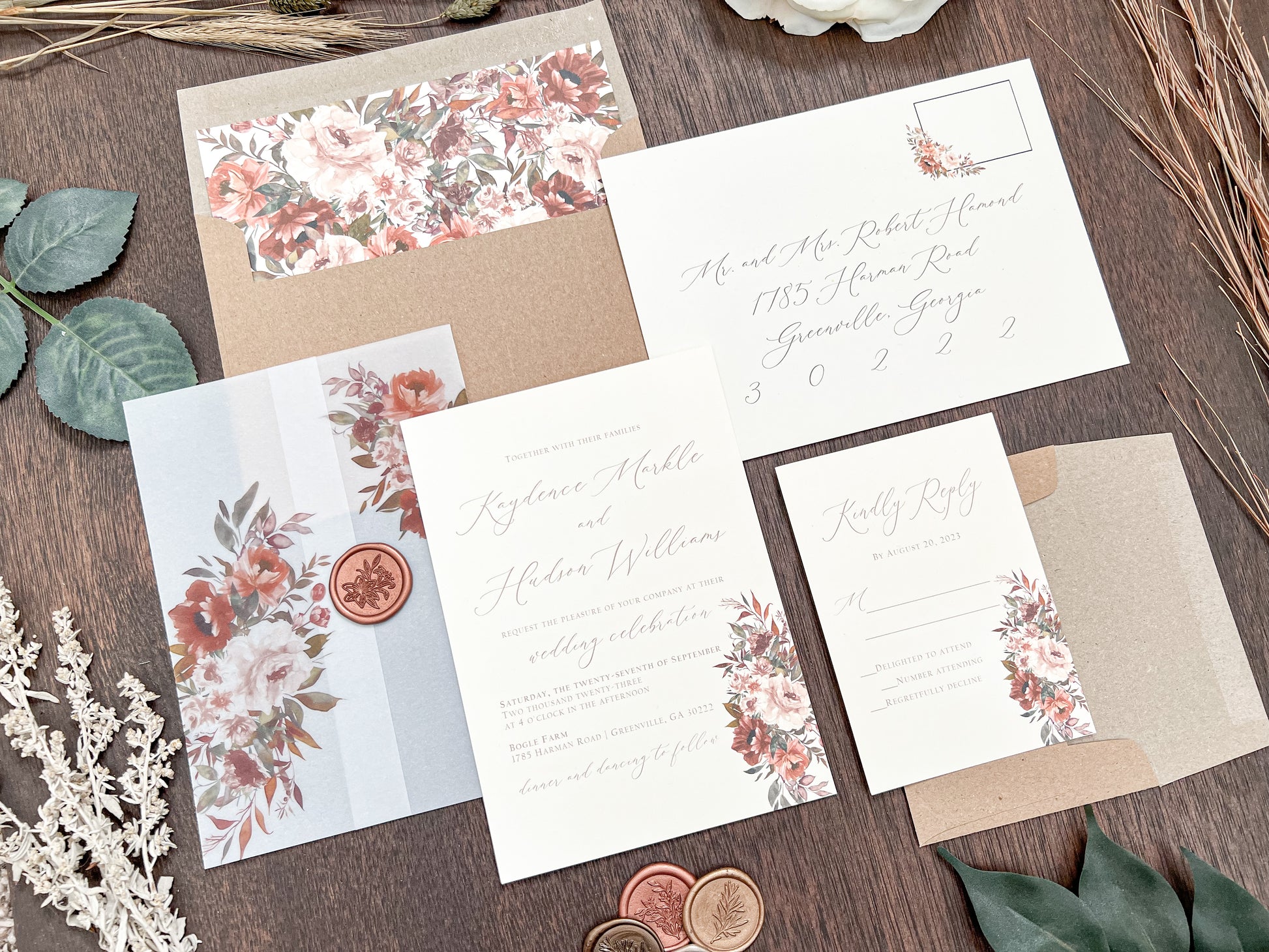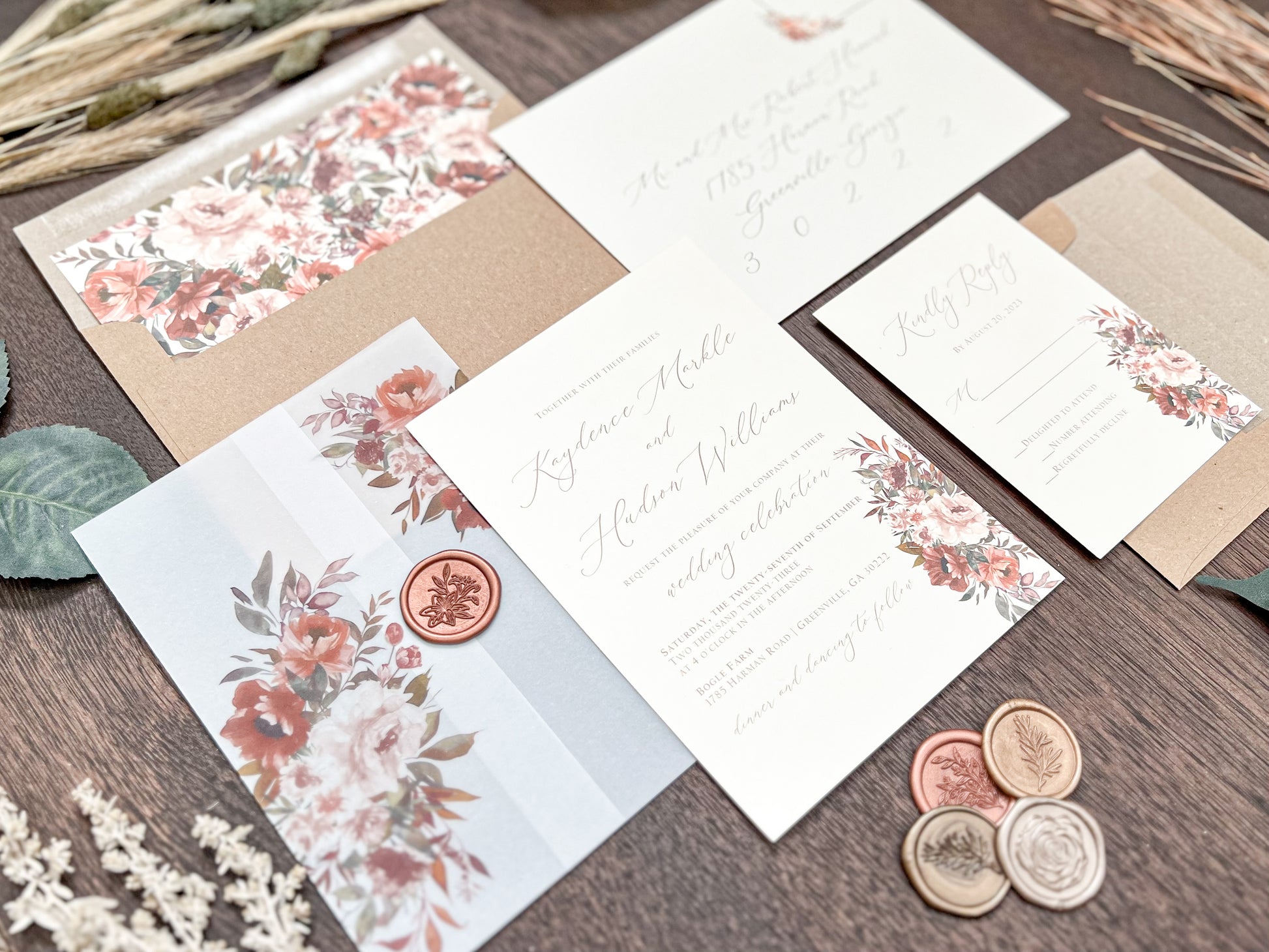This elegant rustic boho style wedding invitation is printed on smooth 100 lb ivory cover stock and wrapped in vellum with copper/rust/burnt orange colored flowers & foliage, then held together using a botanical copper wax seal. Other wax colors available. Please inquire for your color of choice.