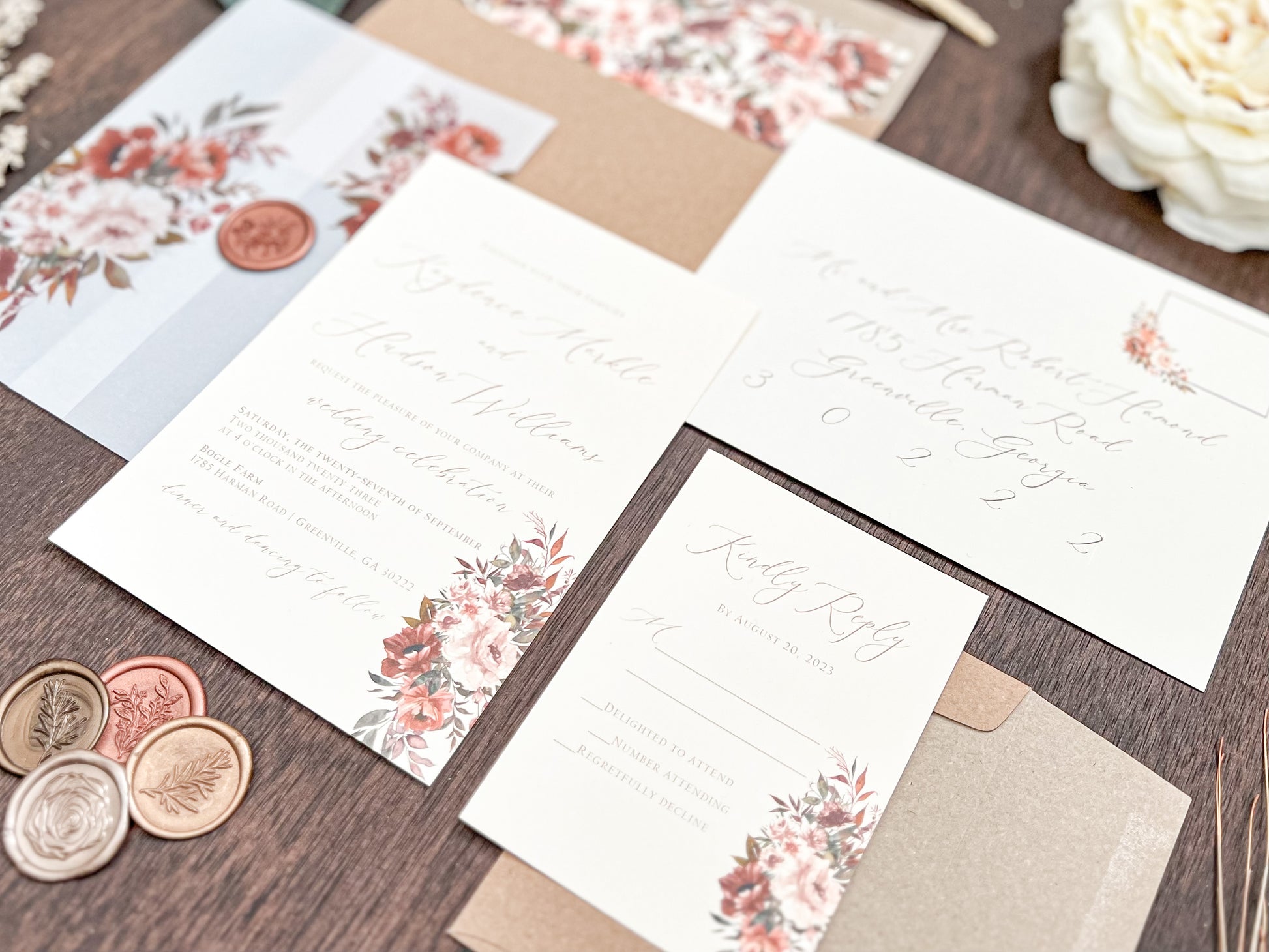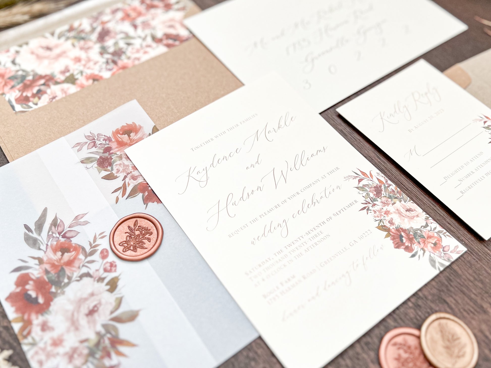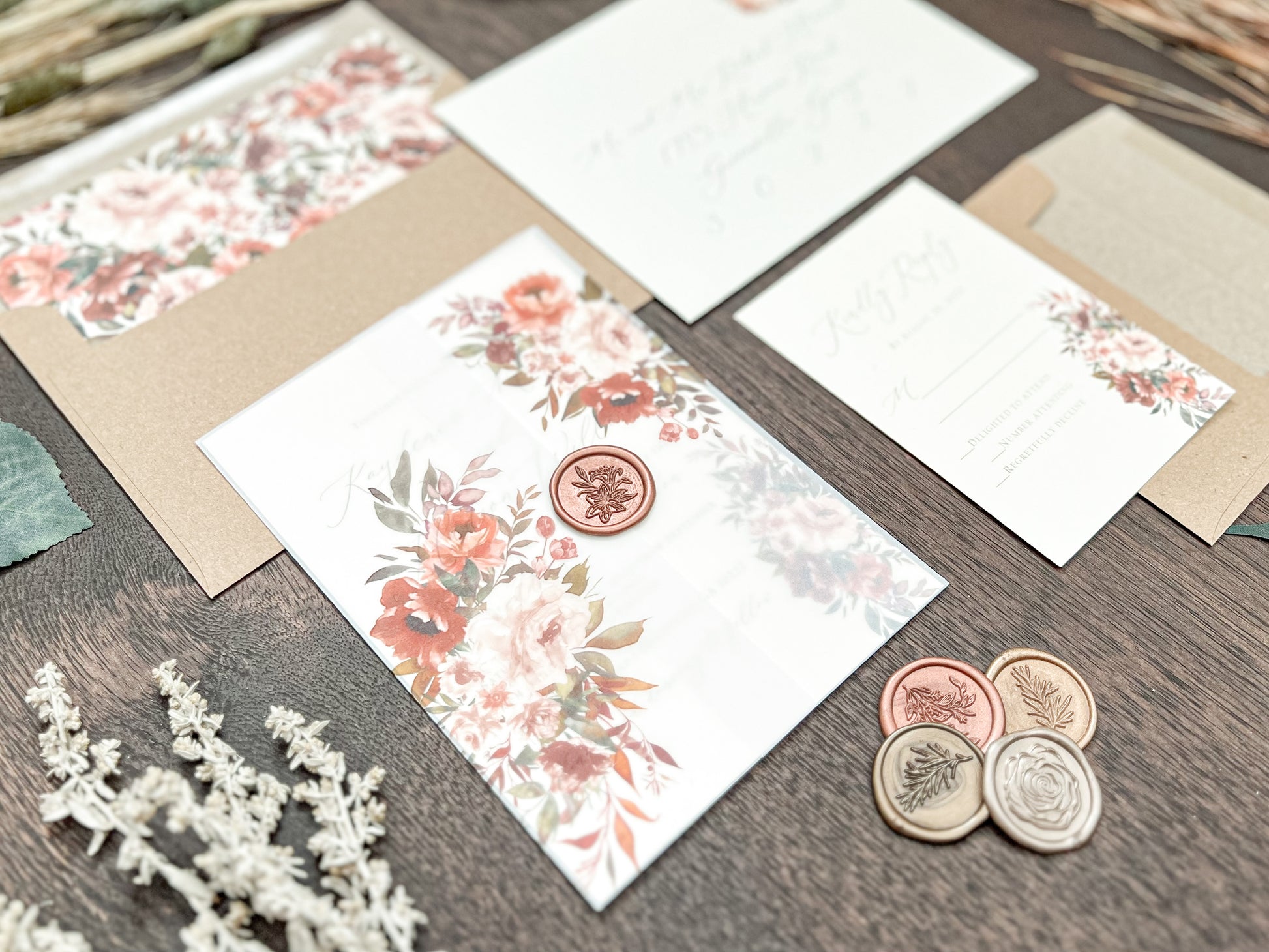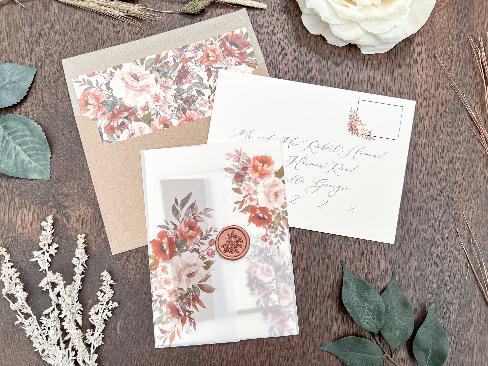 Copper Boho Wedding Invitation with Burnt Orange, Terracotta & Blush Flowers, wrapped in Vellum & Wax Seal