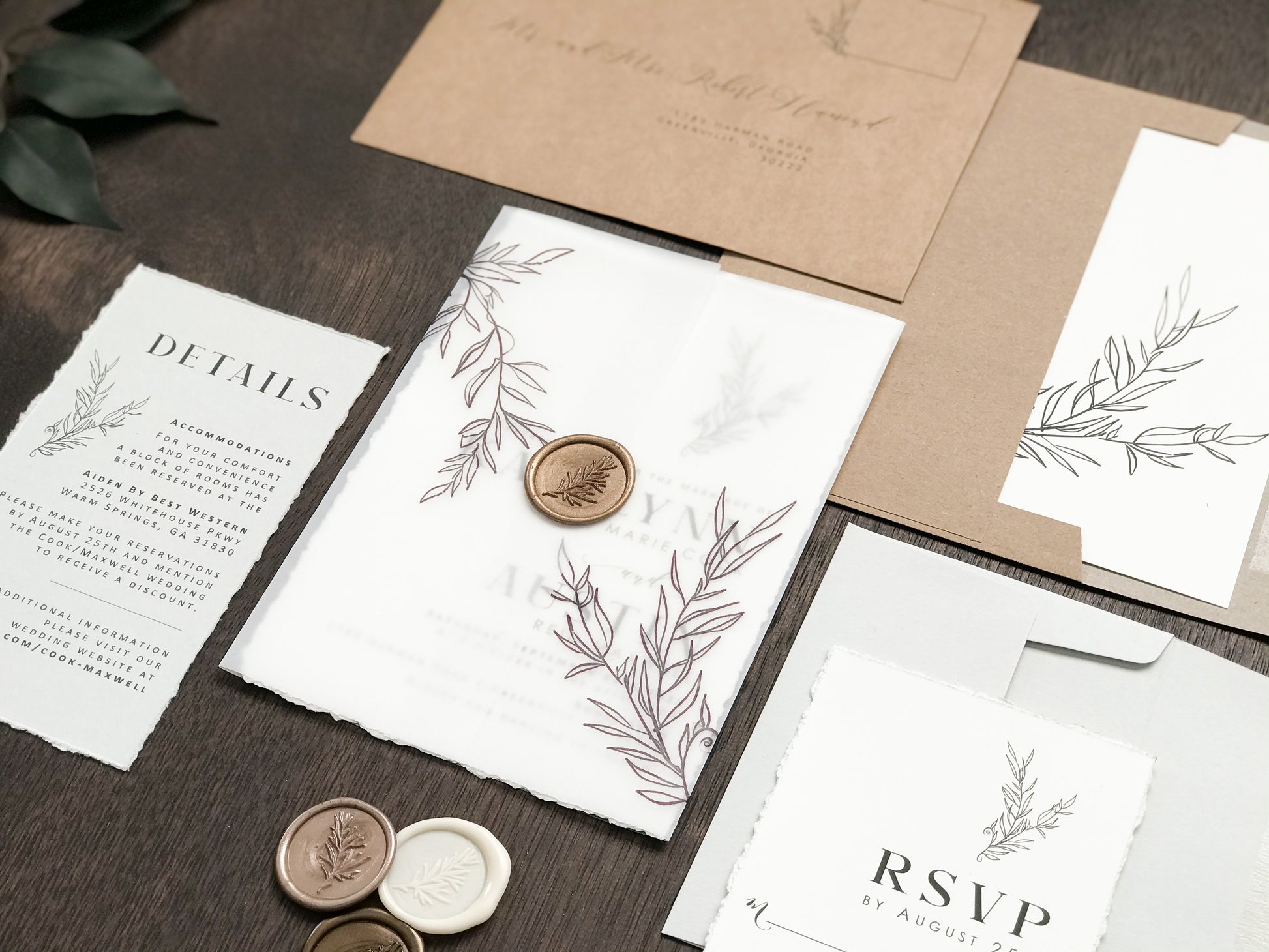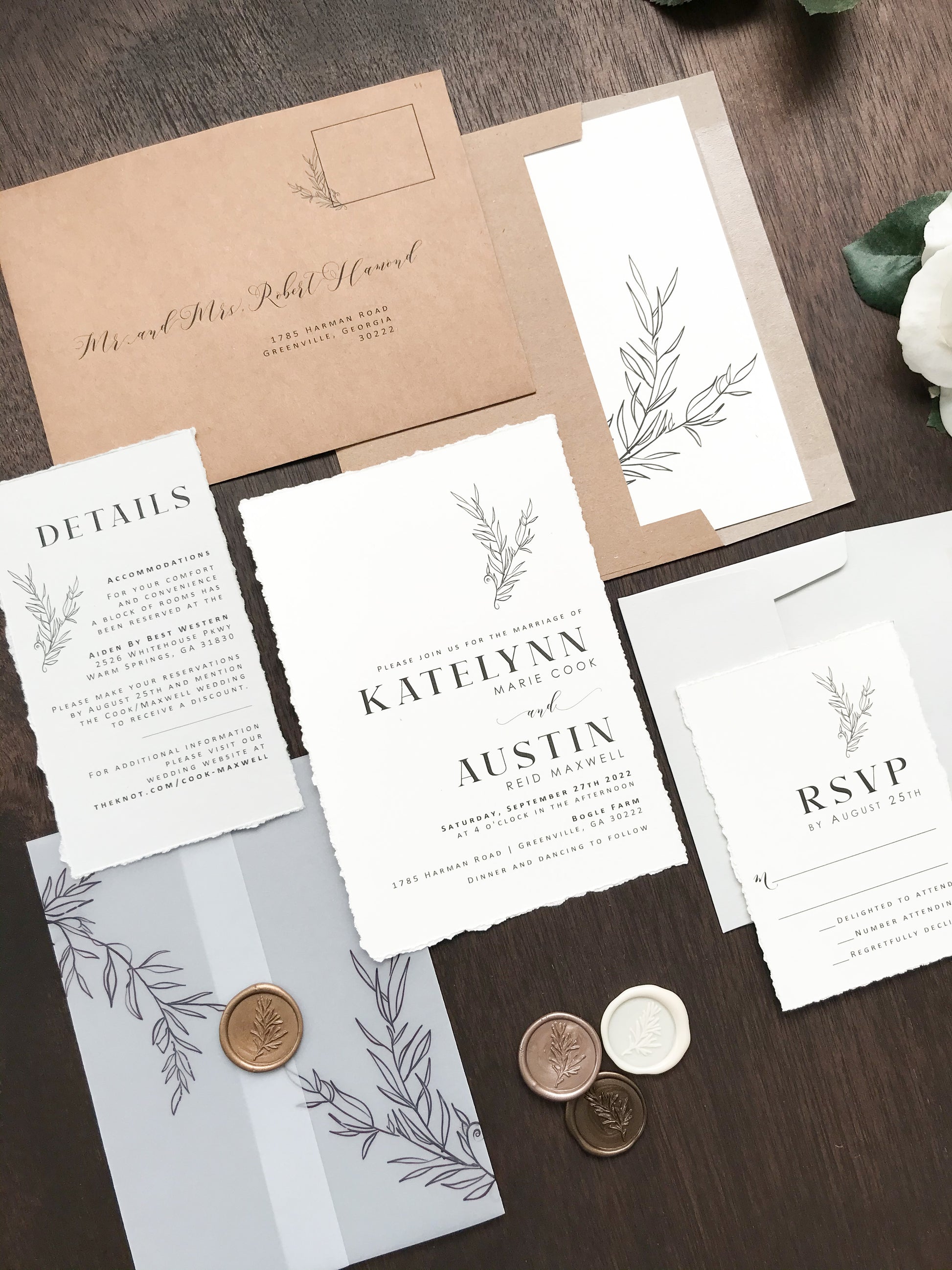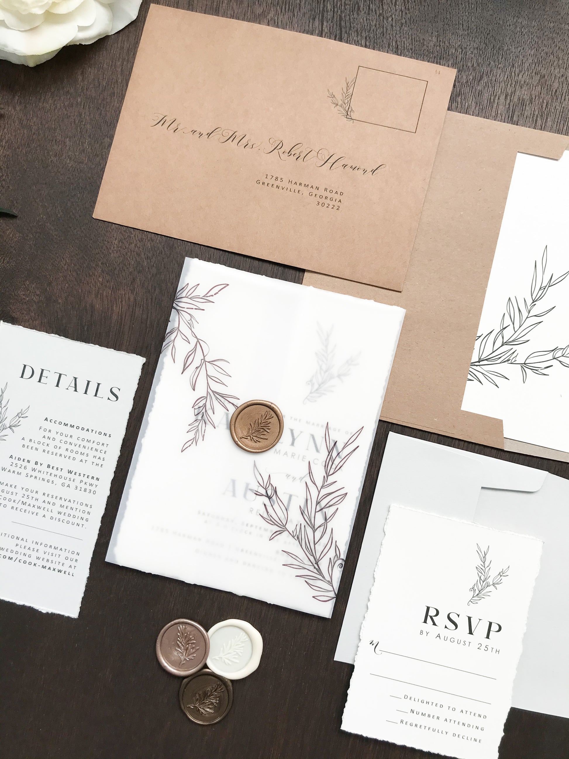 This elegant boho style wedding invitation gives such a modern, industrial feel. It’s printed on 100 lb ivory cover stock with deckled (hand torn) edging. Invitation is wrapped in vellum with outline greenery with a botanical antique gold wax seal. Other wax colors available. Please inquire for your color of choice. Can also be printed on white stock as well. Just add the color change in the notes at checkout. If ordered, RSVPs are also printed on ivory and insert cards are printed on a pale gray stock, unless specified otherwise in the notes and checkout.