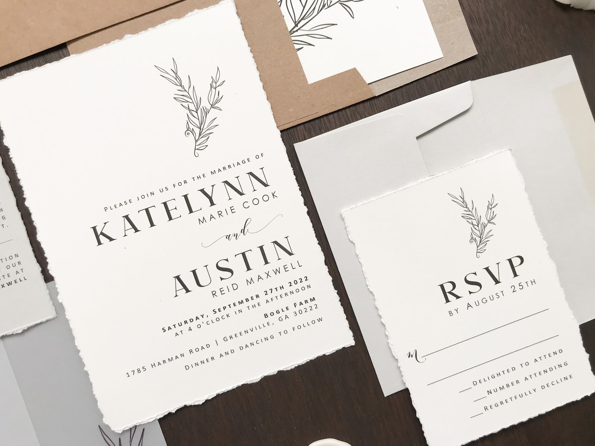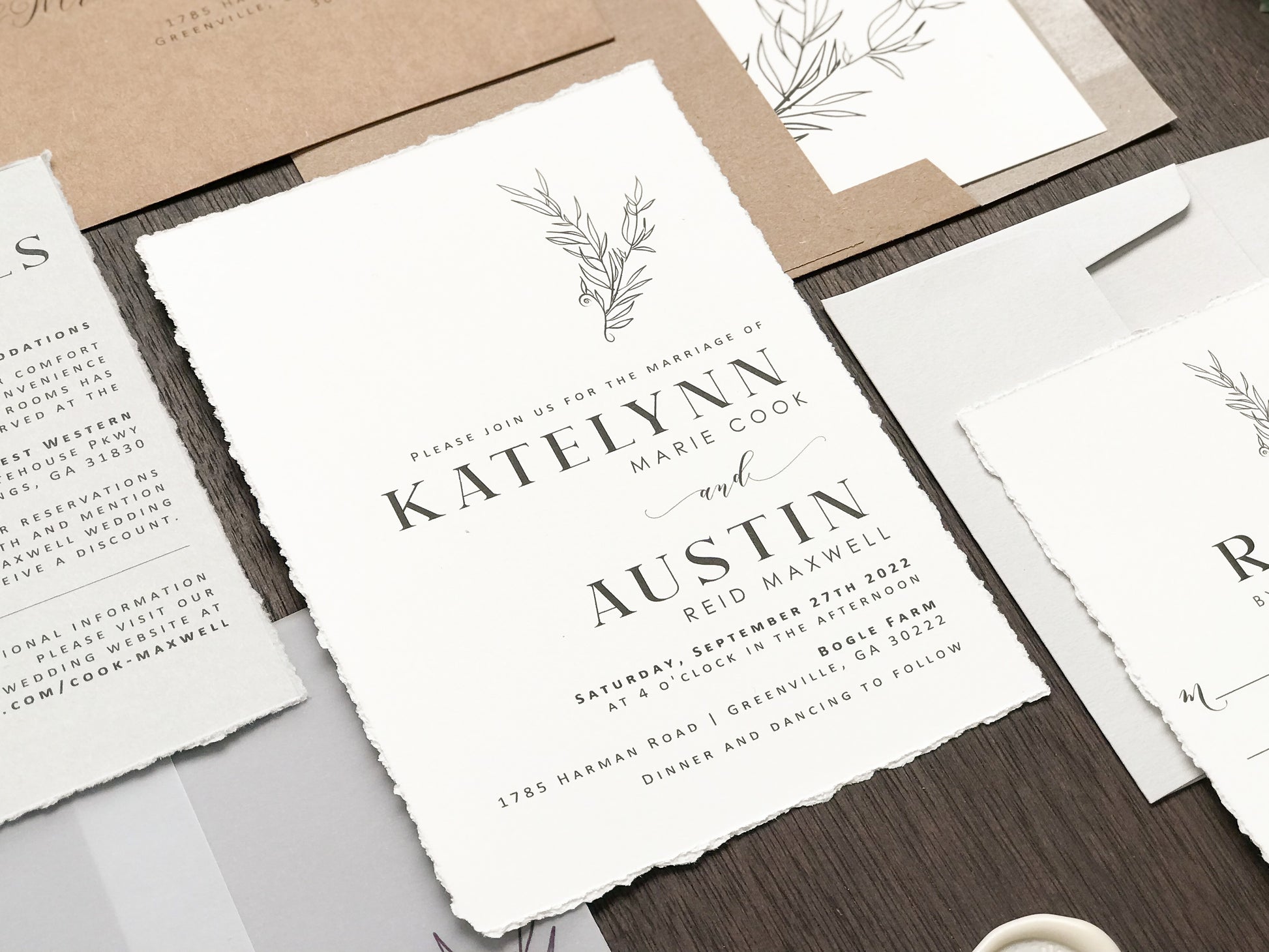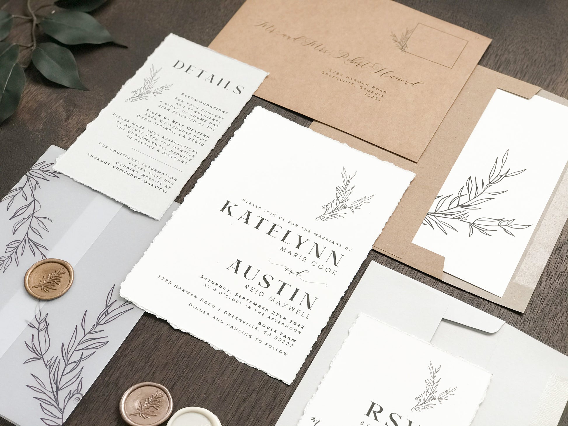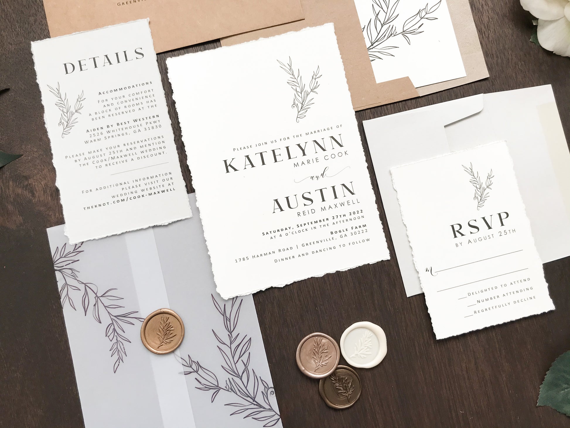 This elegant boho style wedding invitation gives such a modern, industrial feel. It’s printed on 100 lb ivory cover stock with deckled (hand torn) edging. Invitation is wrapped in vellum with outline greenery with a botanical antique gold wax seal. Other wax colors available. Please inquire for your color of choice. Can also be printed on white stock as well. Just add the color change in the notes at checkout. If ordered, RSVPs are also printed on ivory and insert cards are printed on a pale gray stock, unless specified otherwise in the notes and checkout.