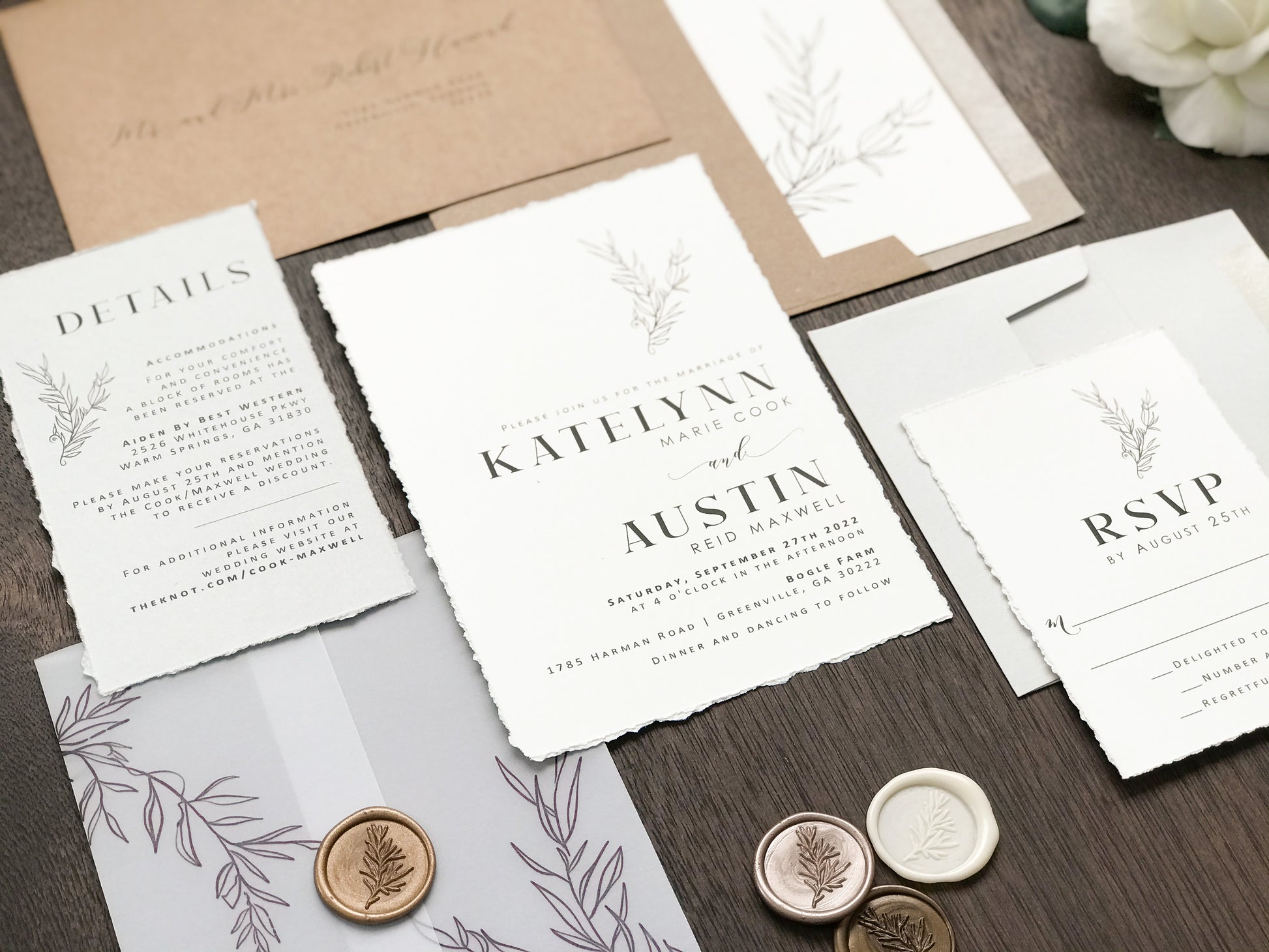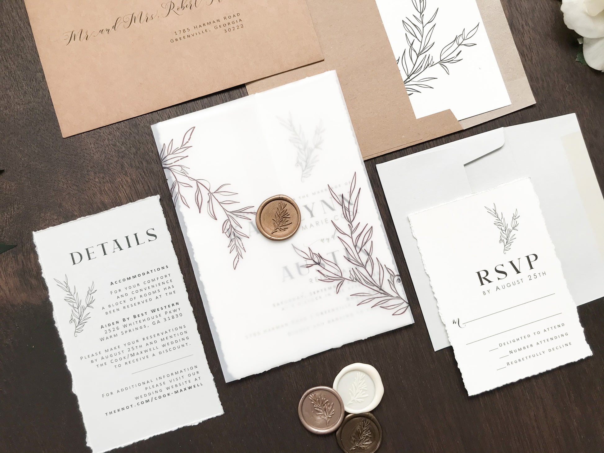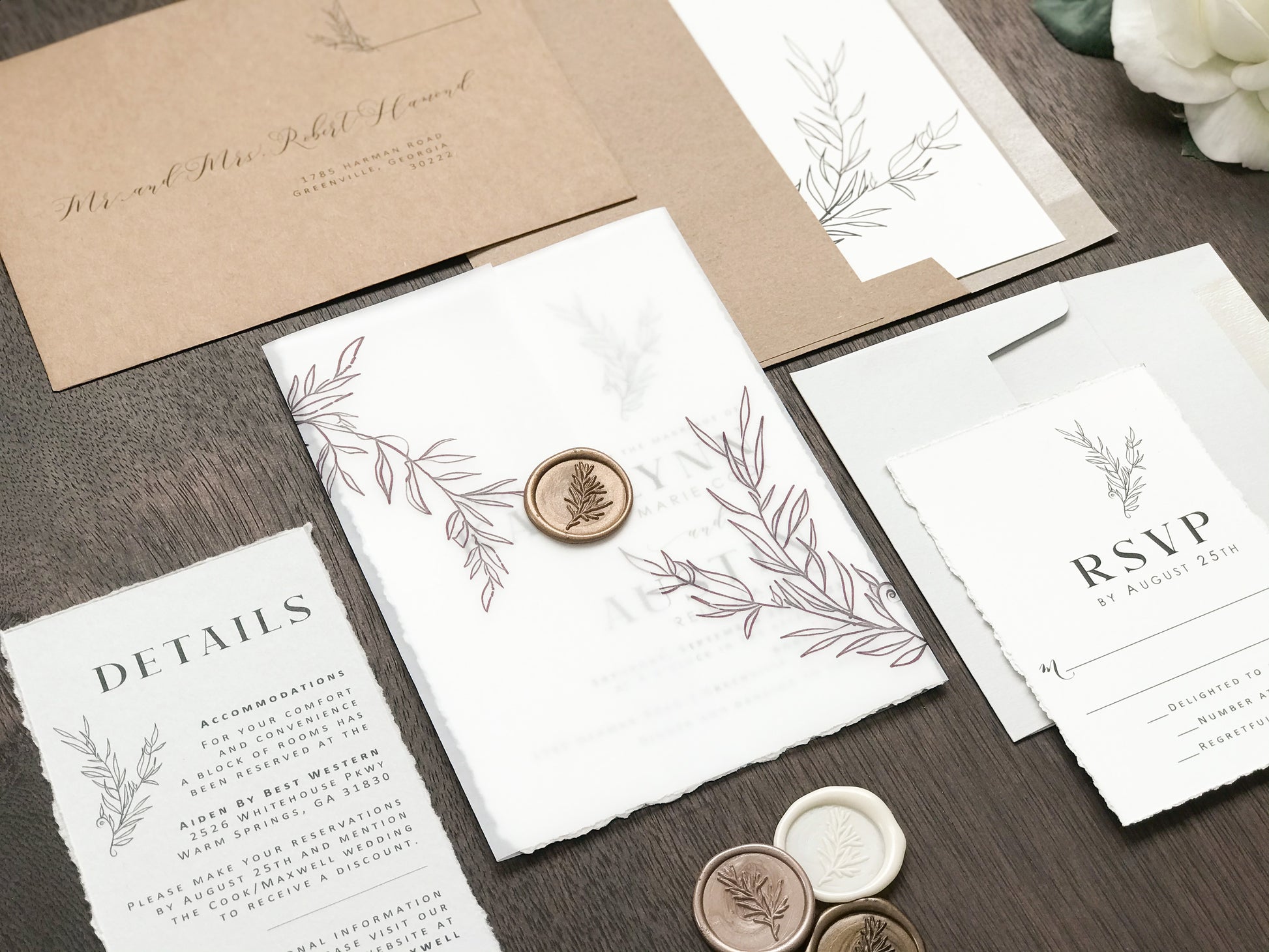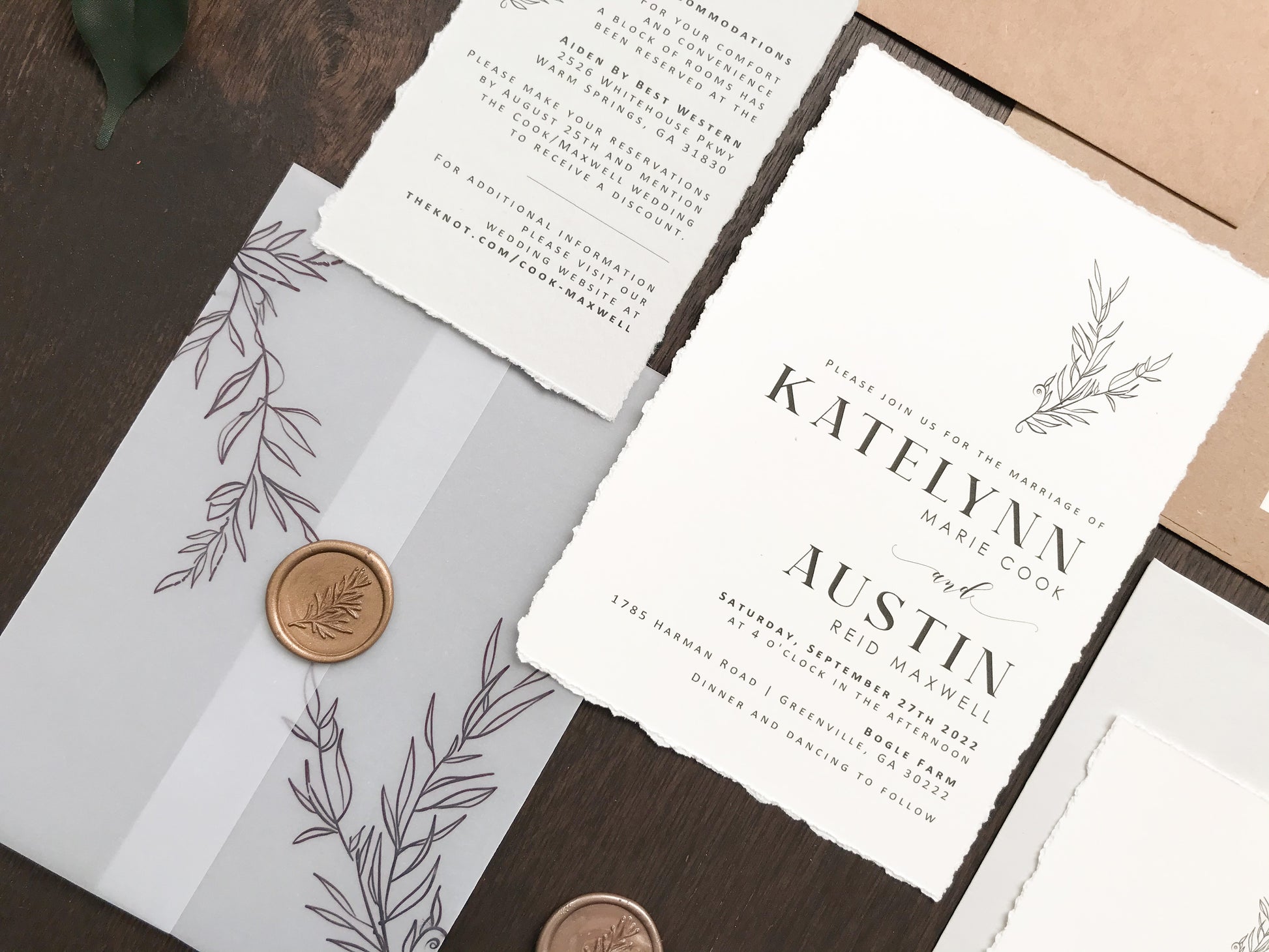 Contemporary Modern Boho Wedding Invitation with Deckled Edging, Vellum and Antique Gold Wax Seal