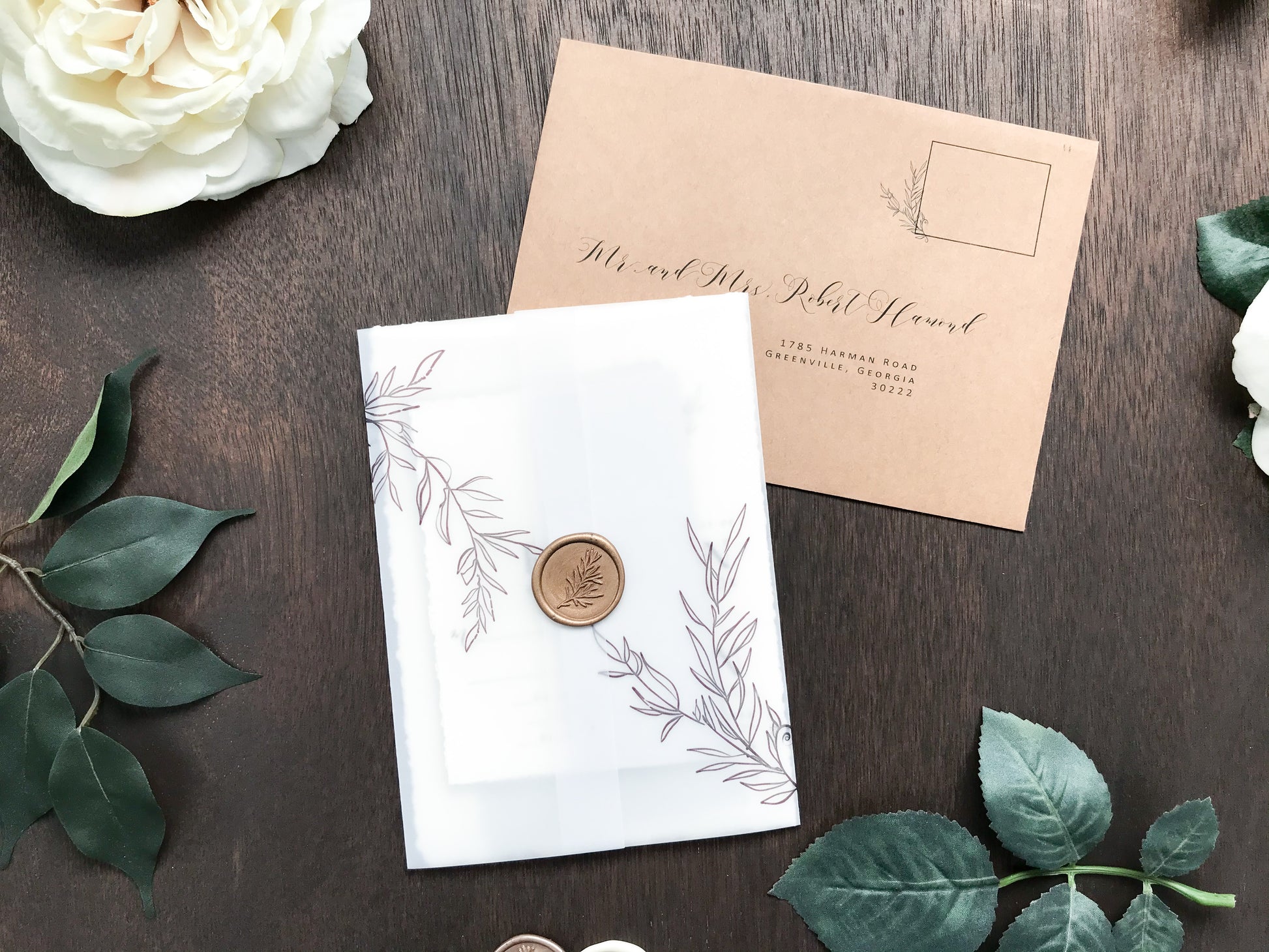 - 5 x 7 invitation wrapped in vellum with wax seal