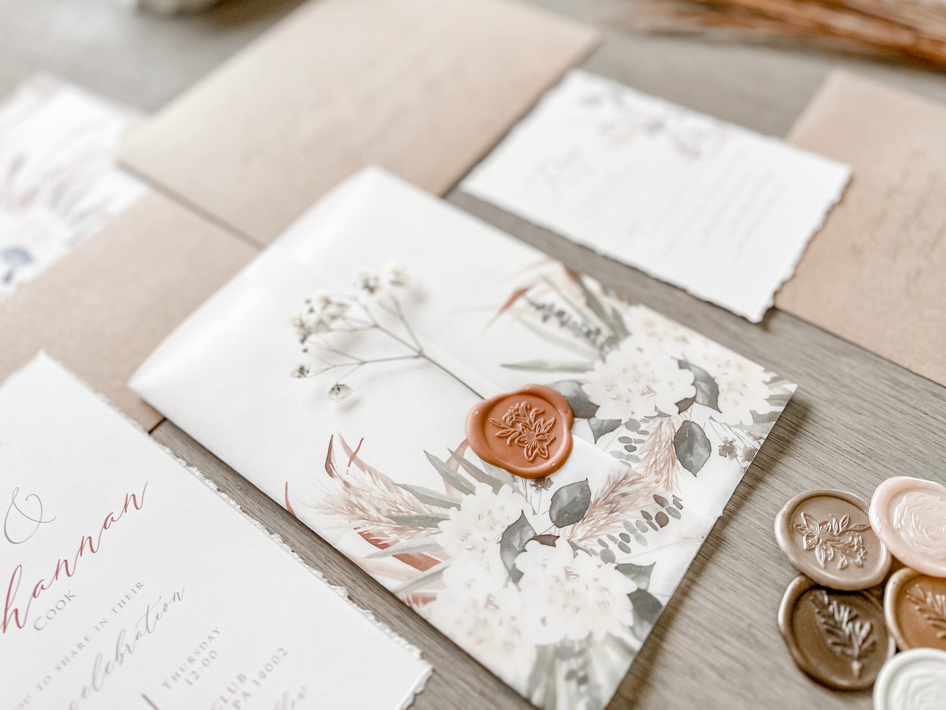 This elegant boho style wedding invitation is printed on smooth 100 lb ivory cover stock with deckled (hand torn) edging. Invitation is wrapped in pampas grass floral vellum and held together using a botanical copper wax seal, featuring a sprig of dried/pressed baby’s breath. Other wax colors available. Please inquire for your color of choice.