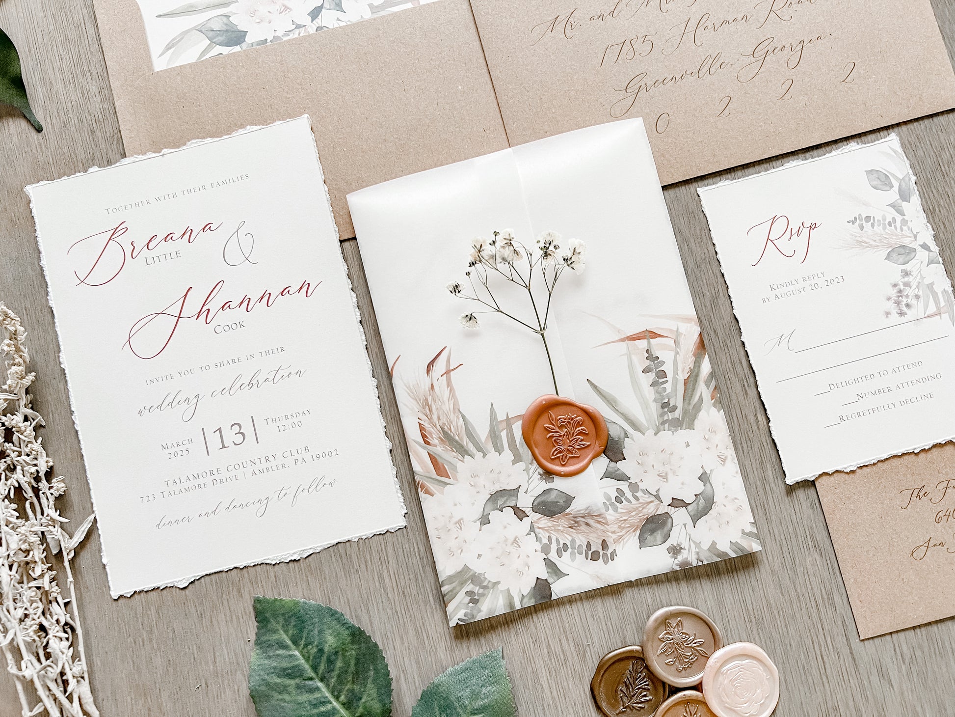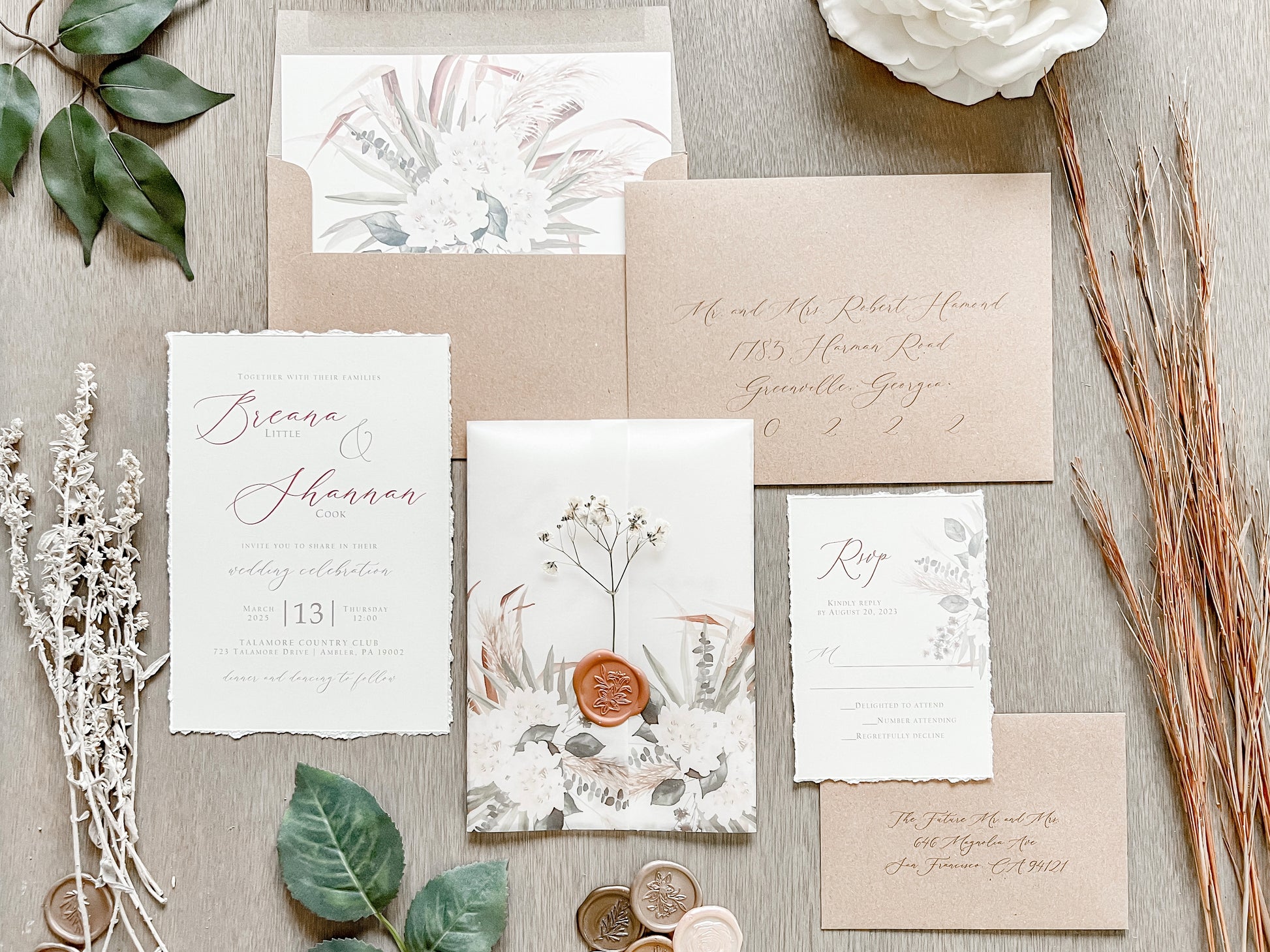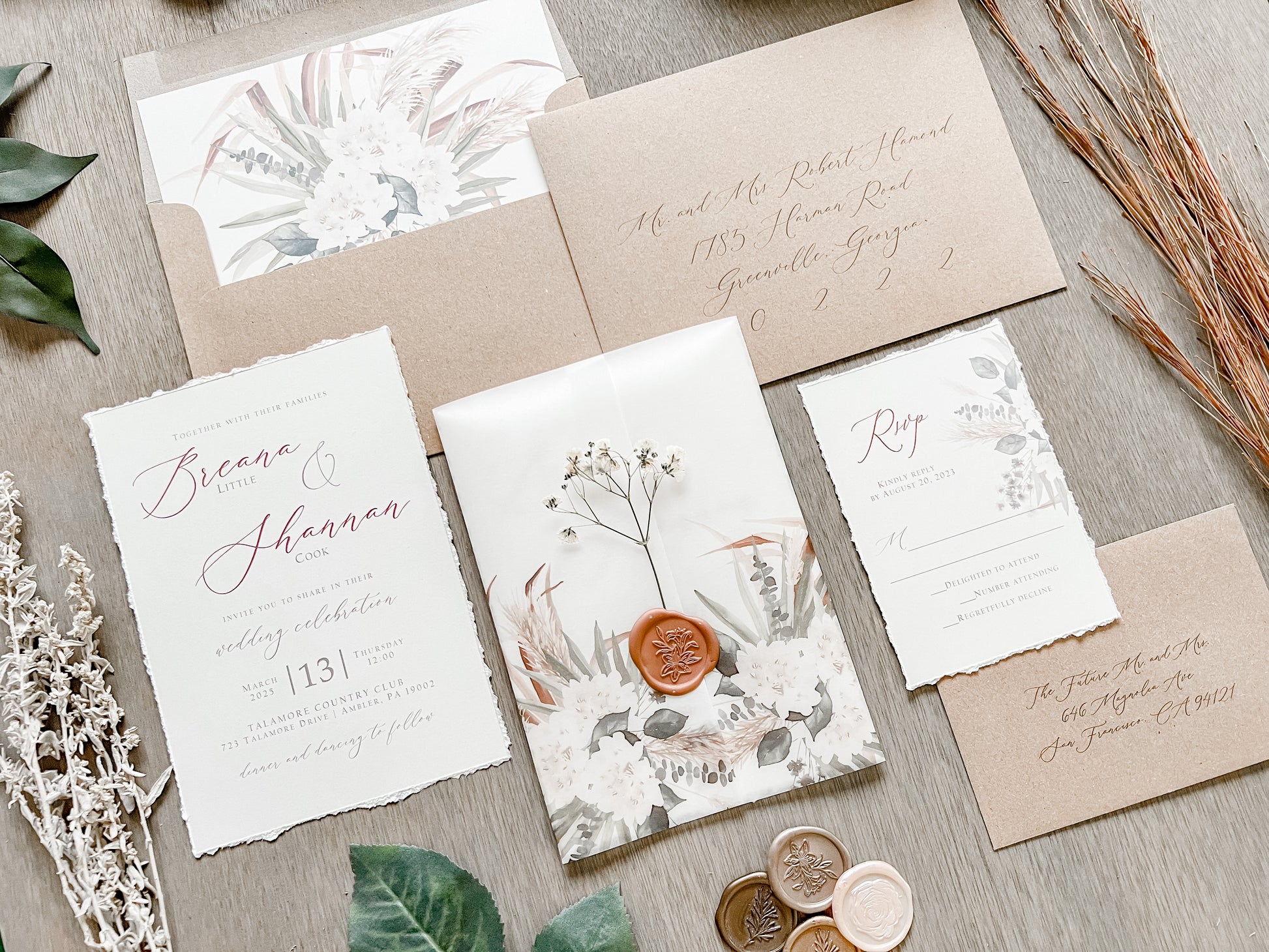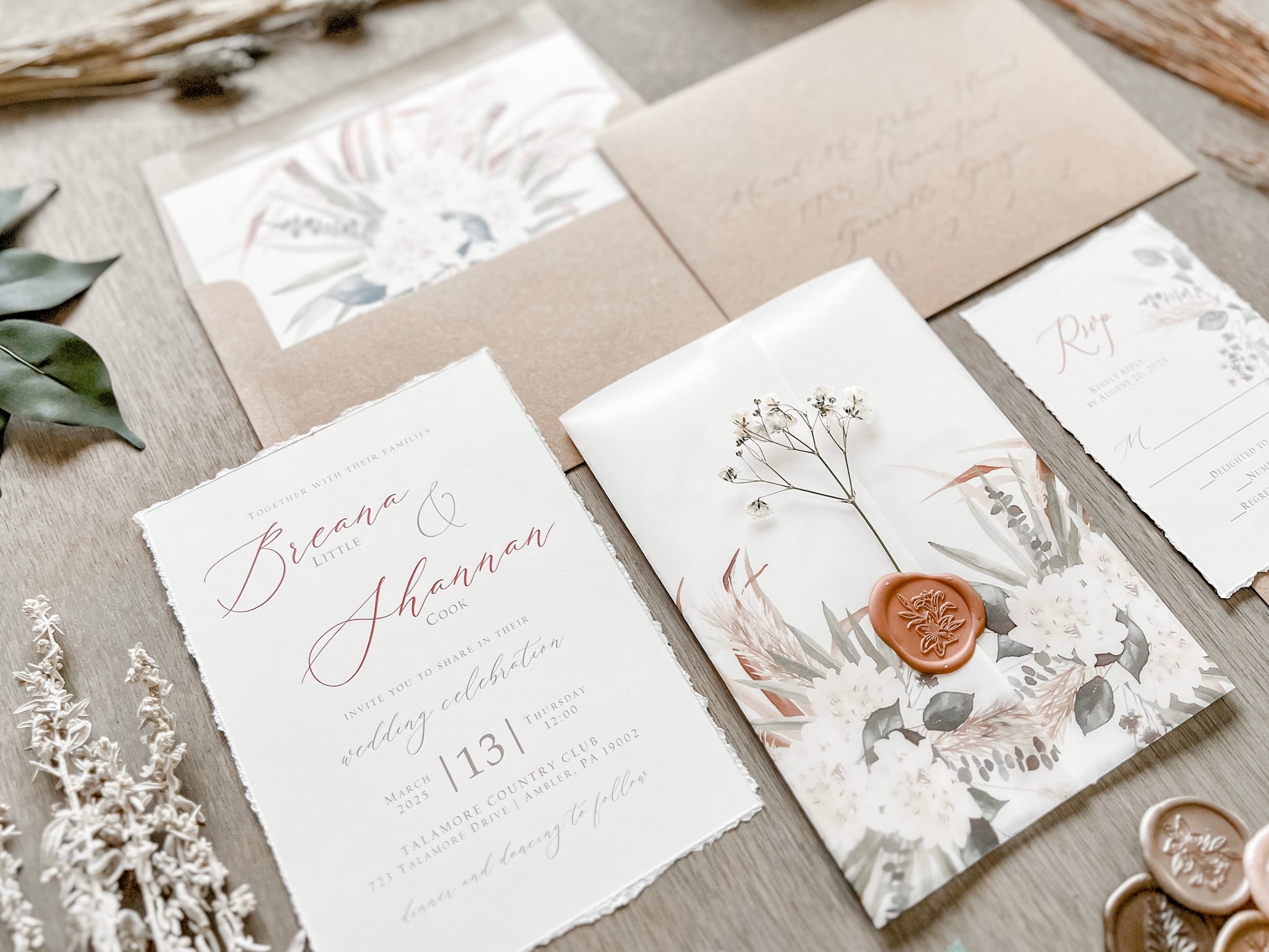 Pampas Grass and White Floral Wedding Invitation with Baby’s Breath, Deckled Edge and Boho Vellum with Wax Seal