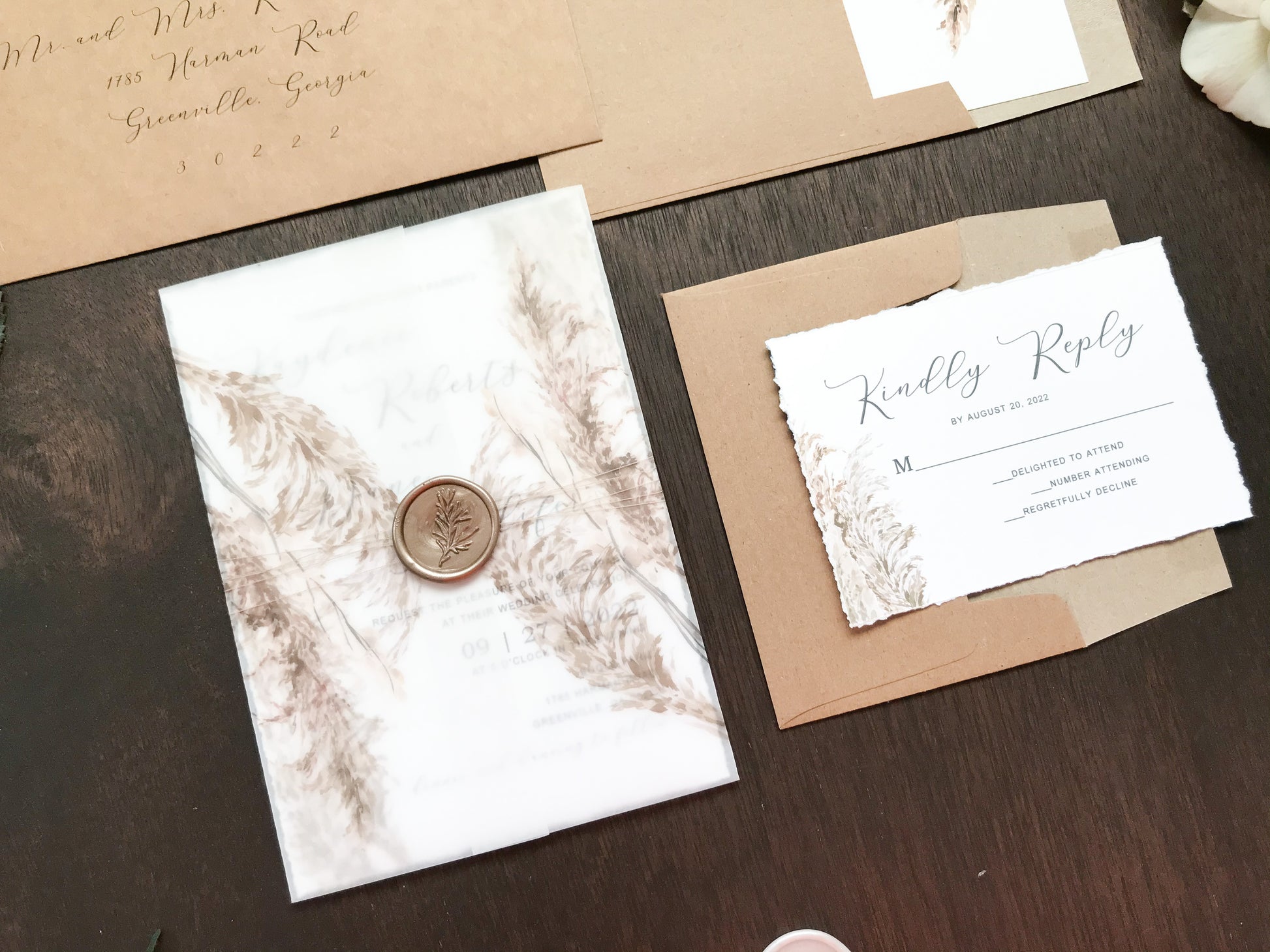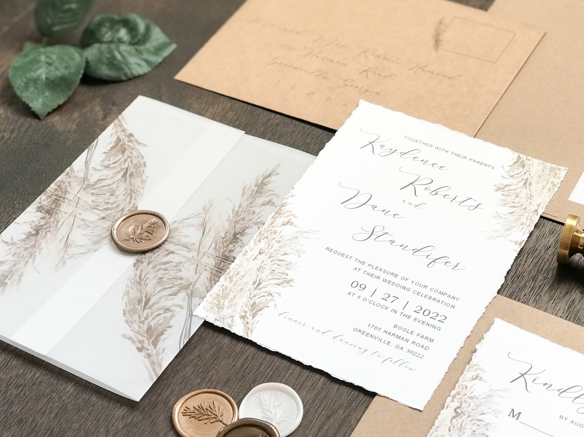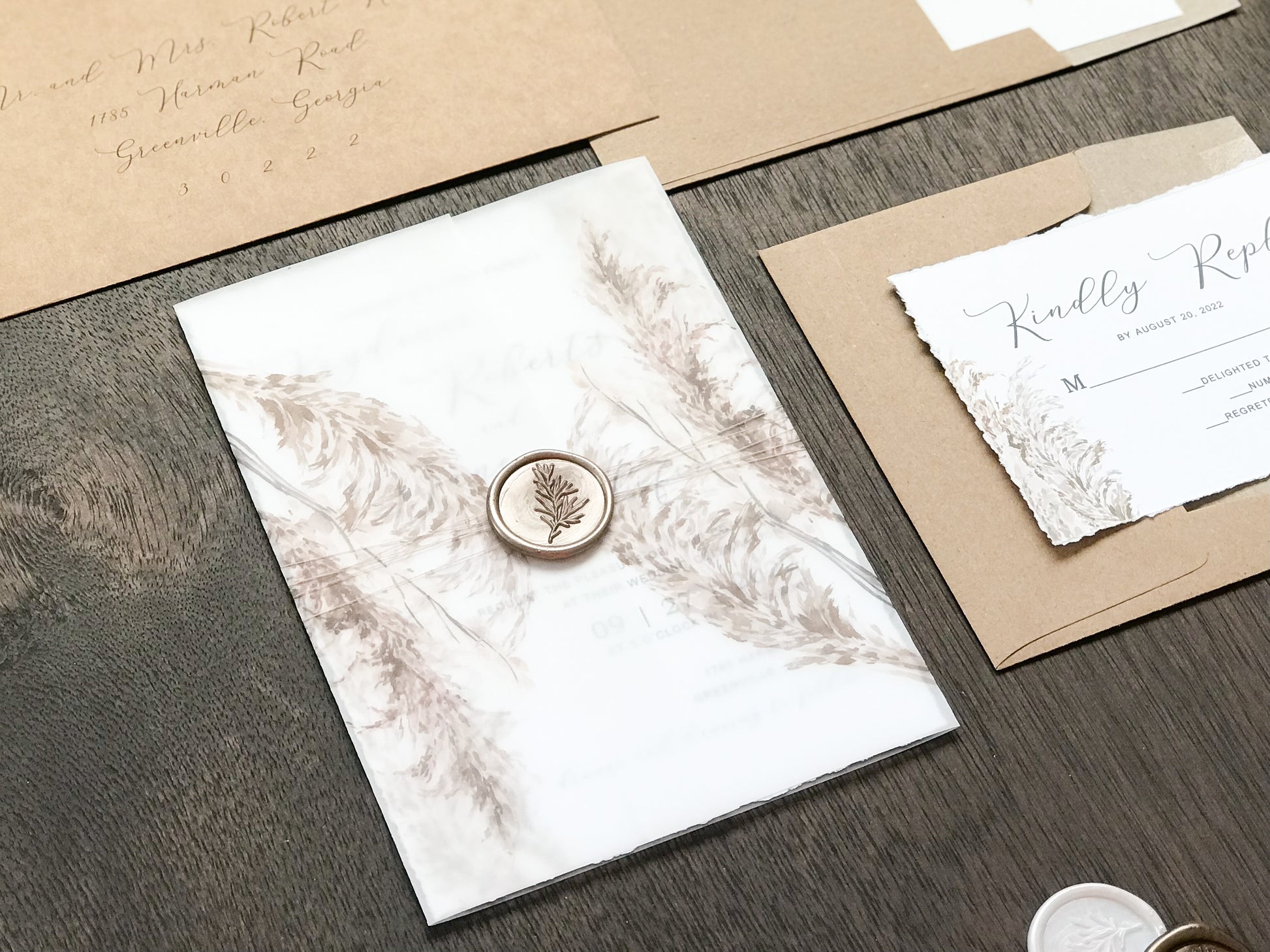 Deckled Edge Boho Vellum Wedding Invitation with Wax Seal and Pampas Grass