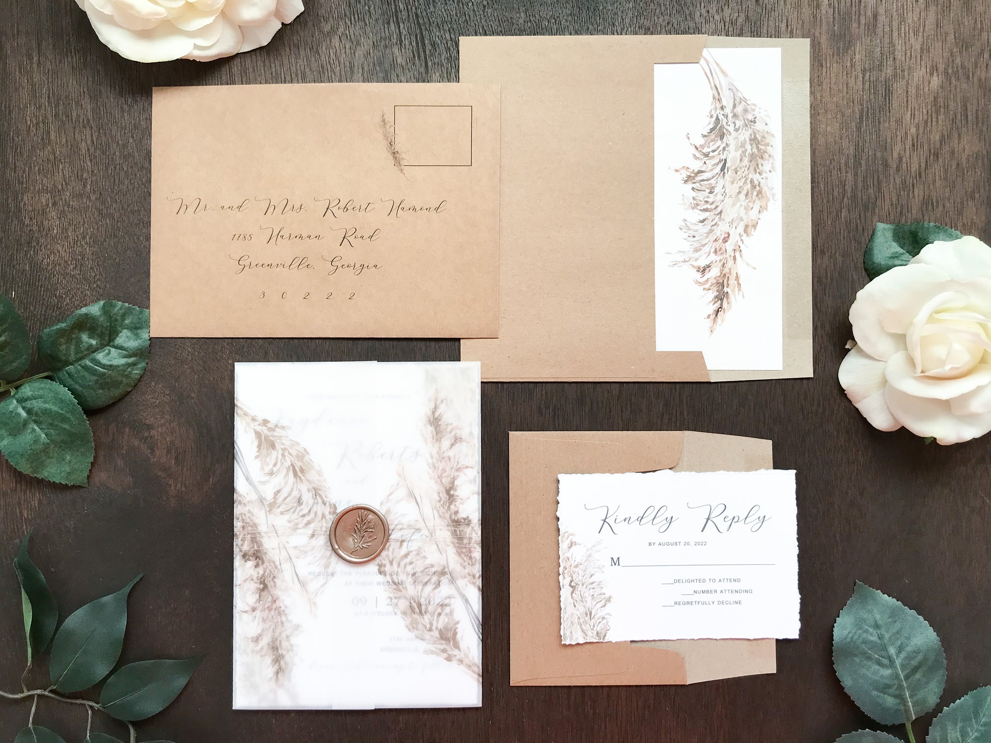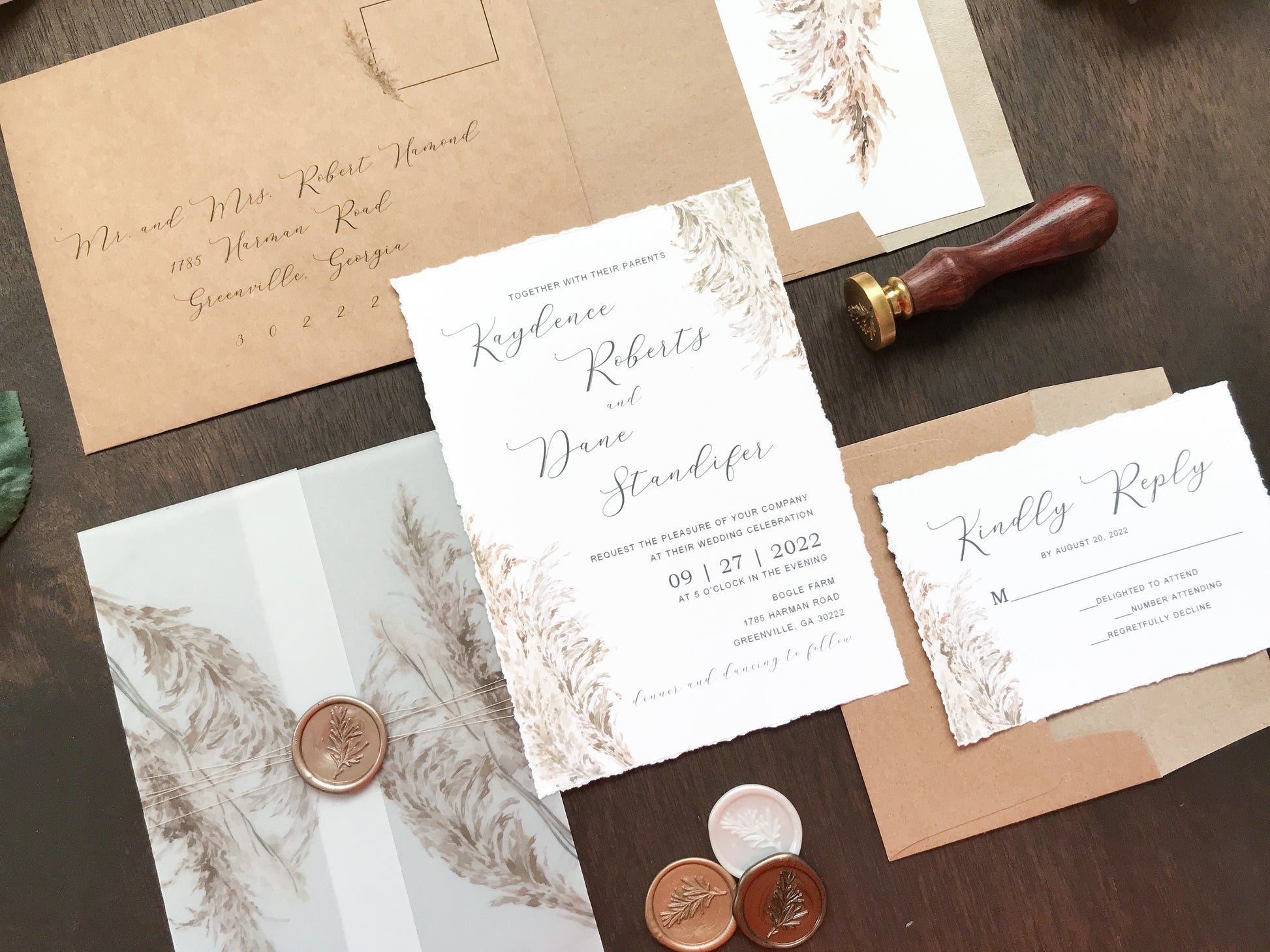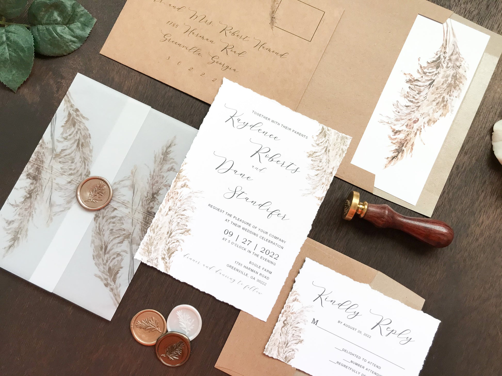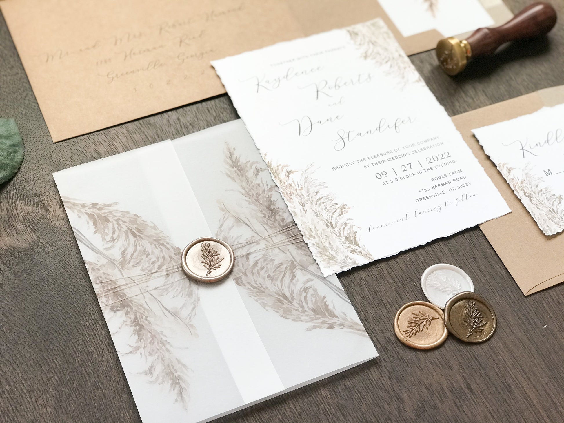 Deckled Edge Boho Vellum Wedding Invitation with Wax Seal and Pampas Grass