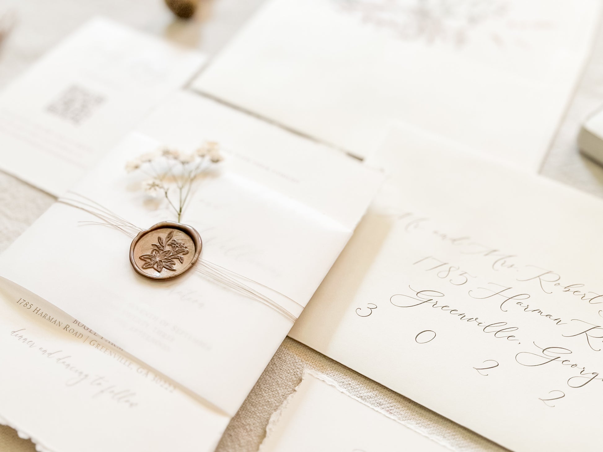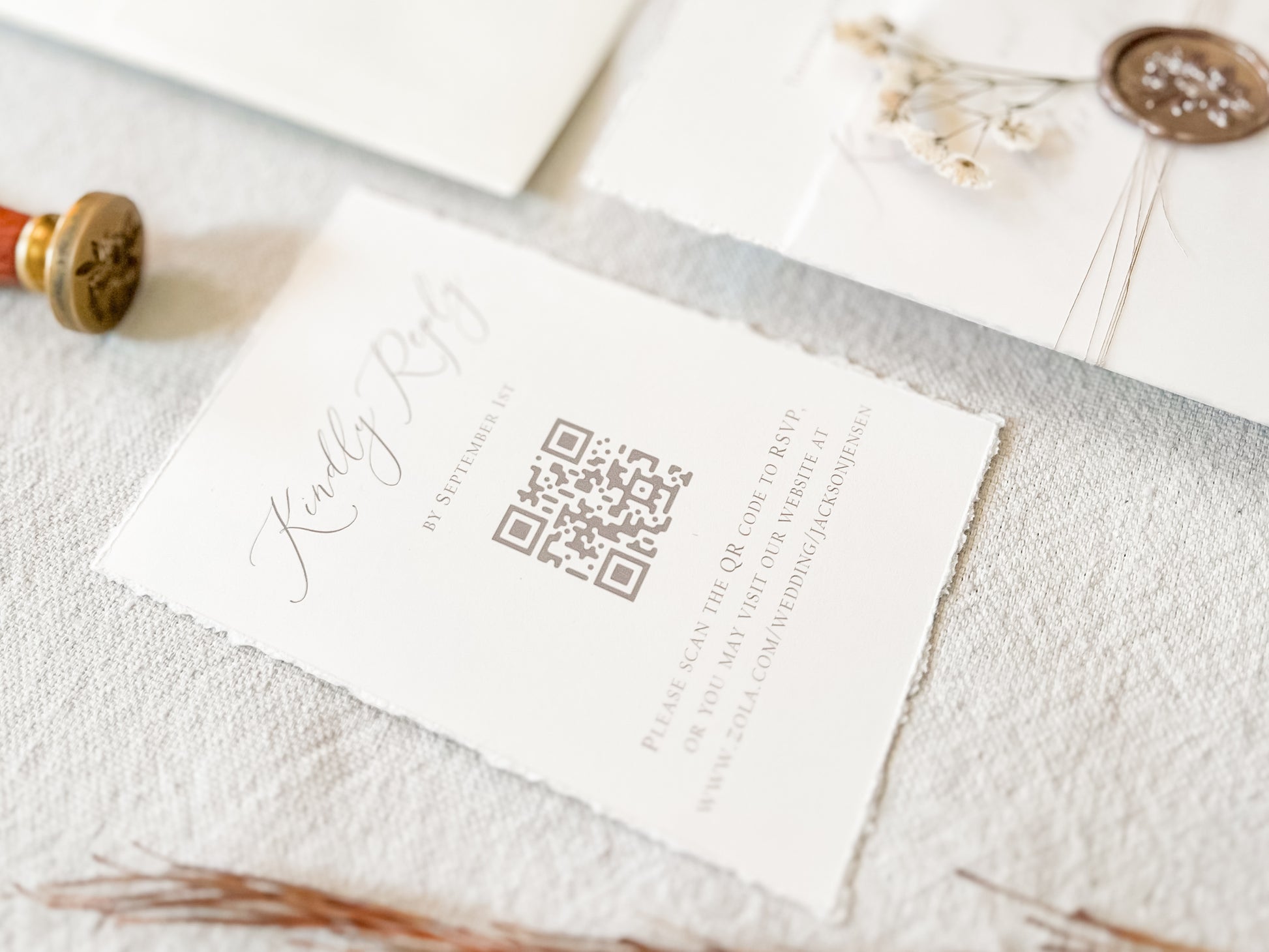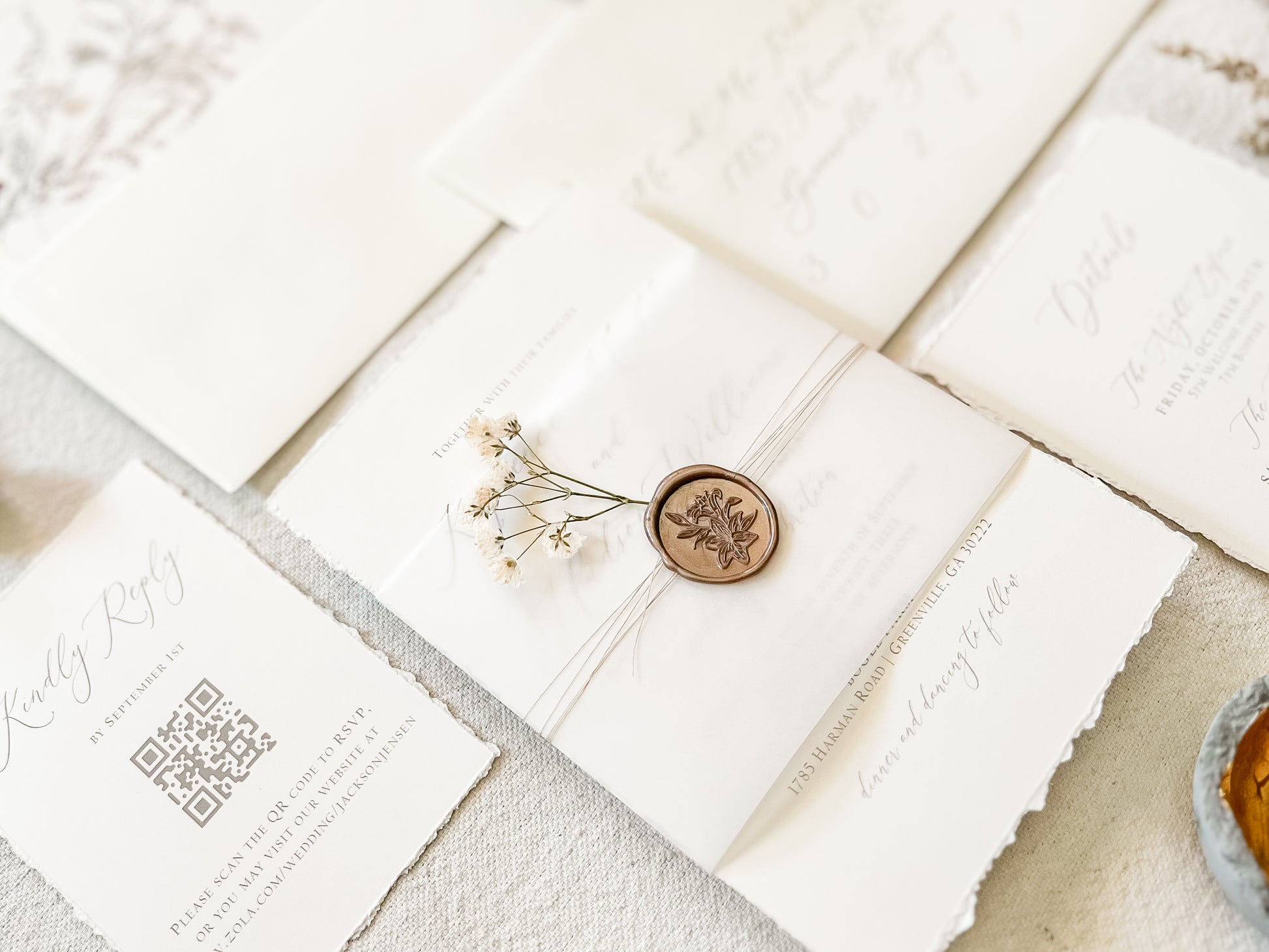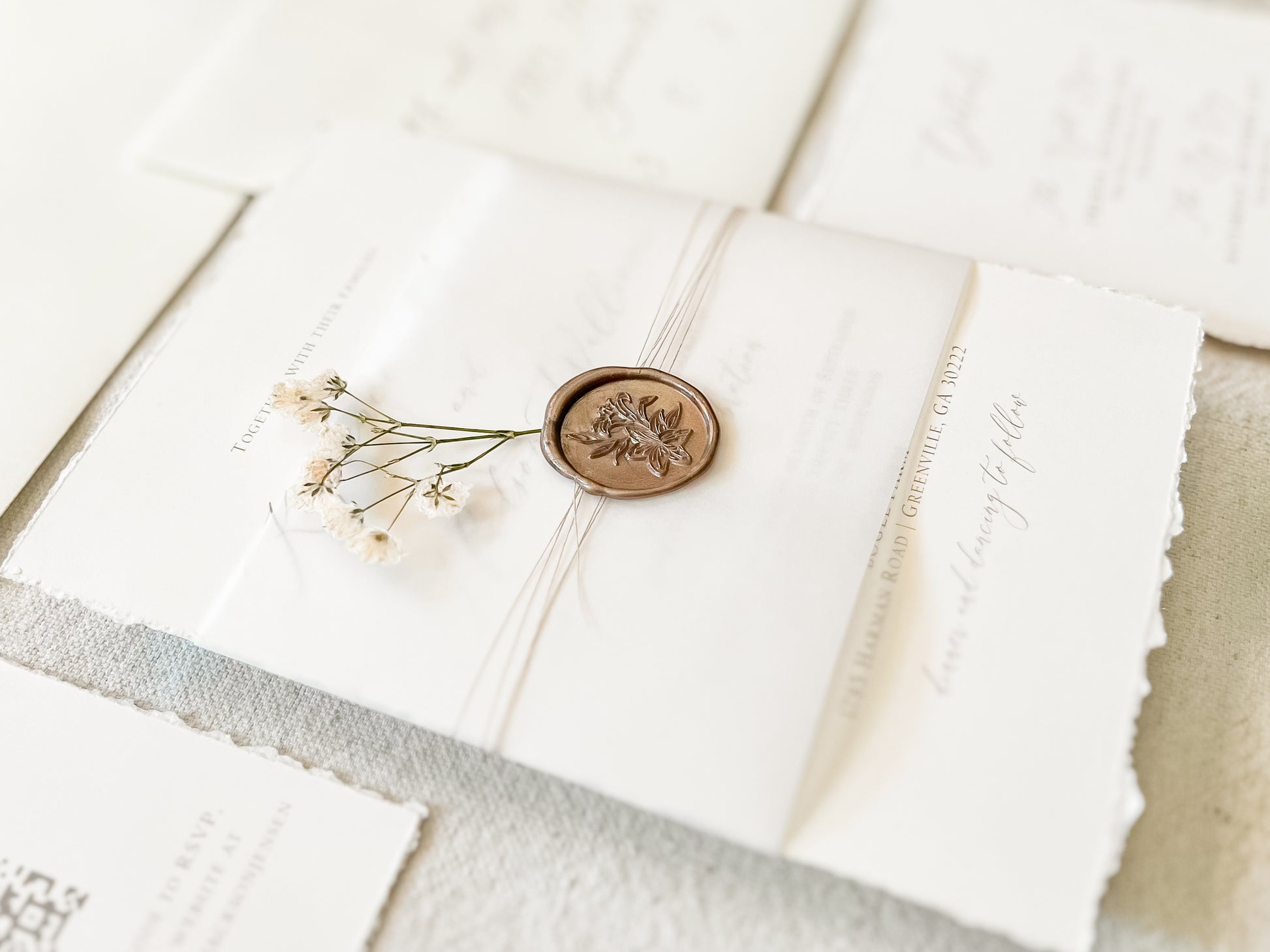 This soft ivory suite features hand-torn deckled edges and delicate baby’s breath, wrapped in vellum with khaki thread and finished with an almond colored wax seal for a clean, romantic presentation. Ideal for intimate weddings and timeless, natural aesthetics. Printed on 100 lb ivory cover stock. Other wax colors available. Please inquire for your color of choice. Shown with upgraded kraft envelopes.