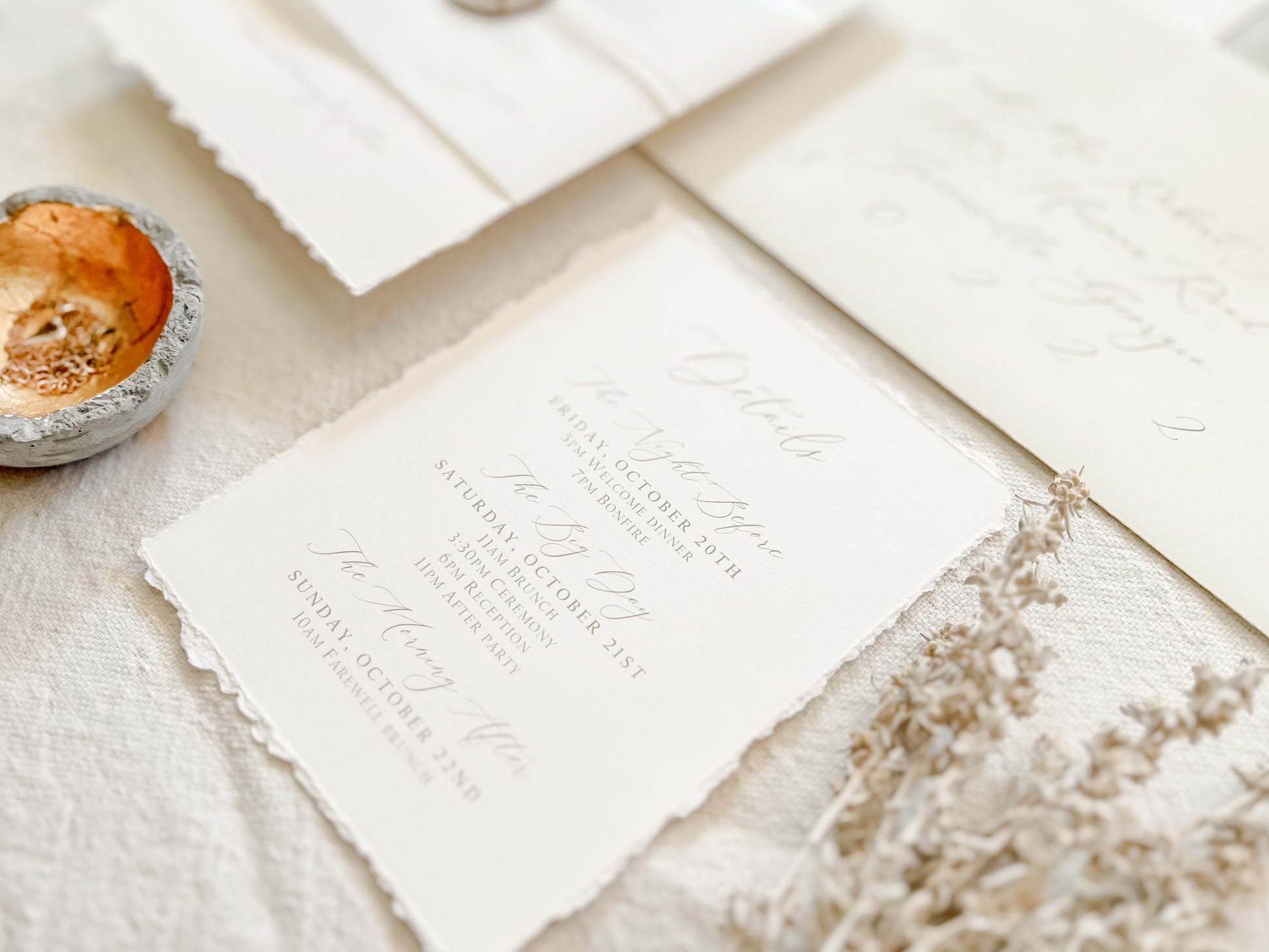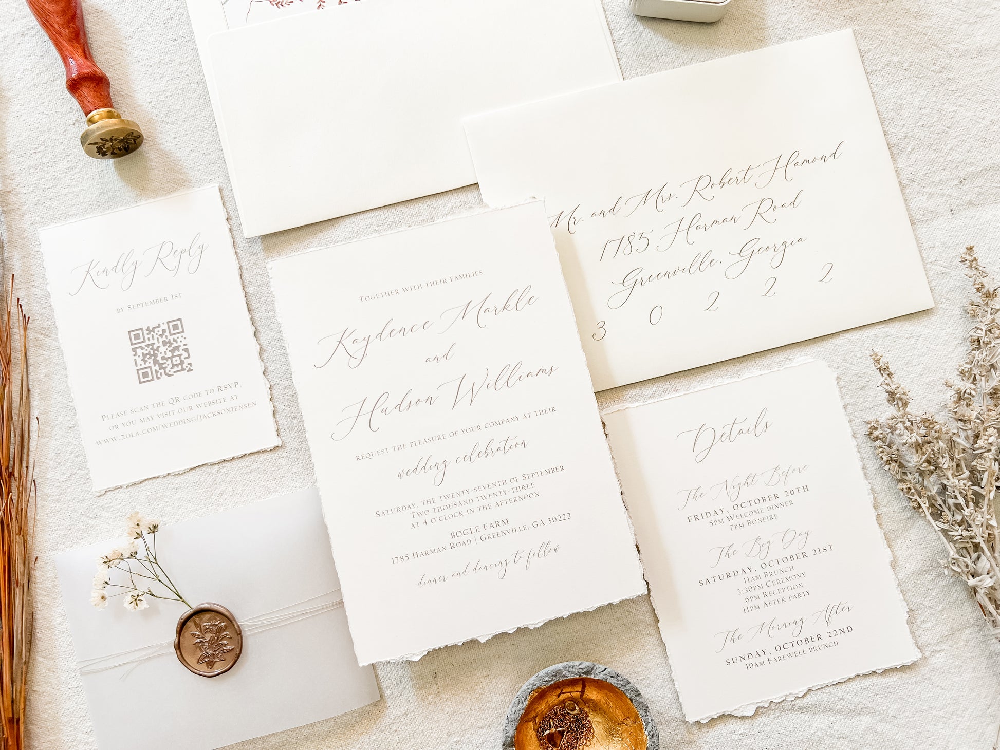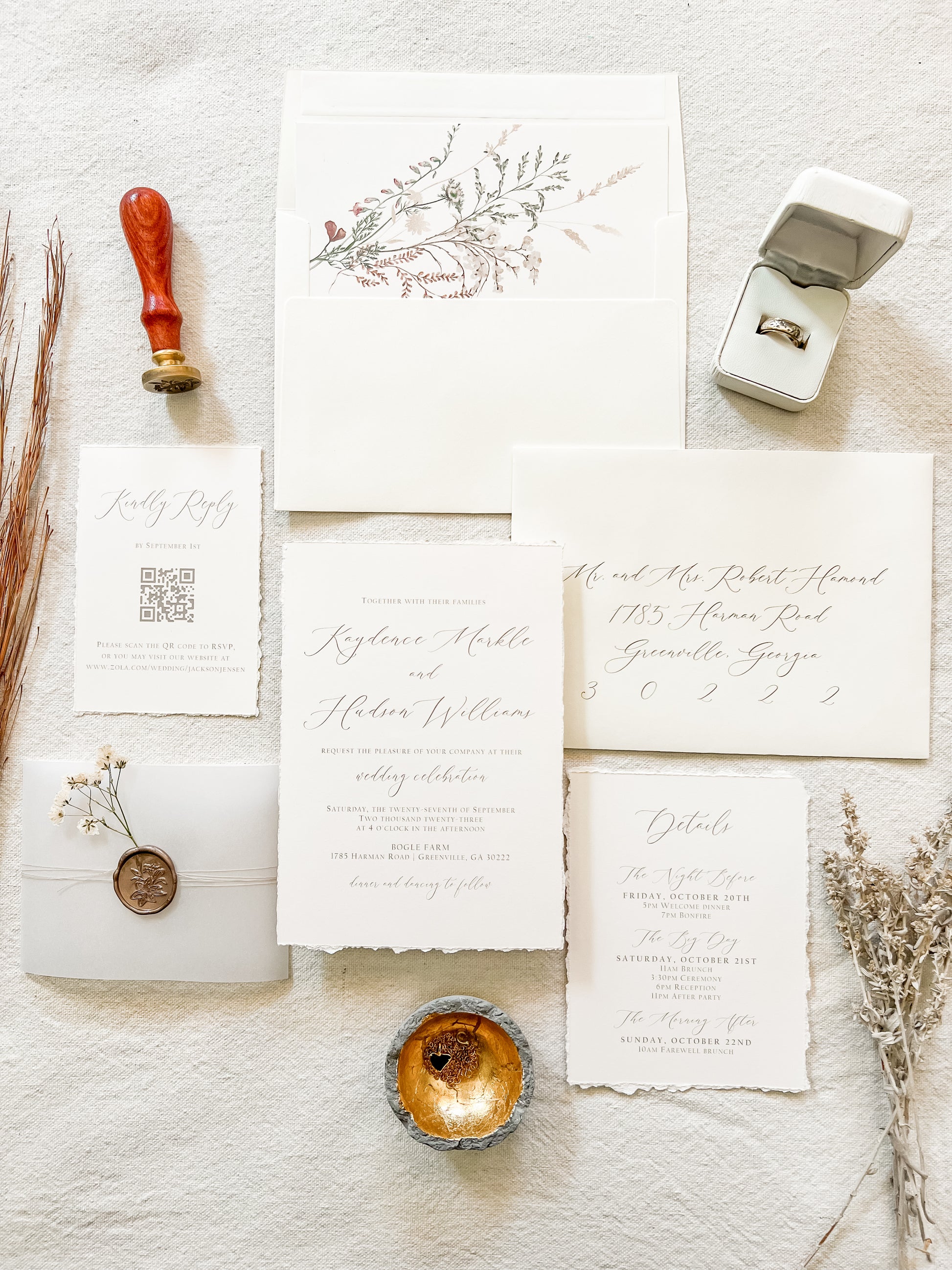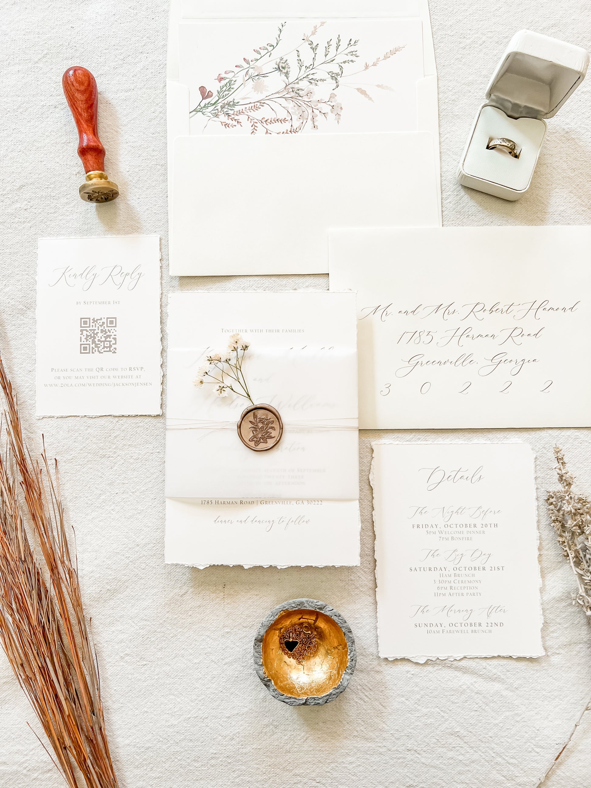 This soft ivory suite features hand-torn deckled edges and delicate baby’s breath, wrapped in vellum with khaki thread and finished with an almond colored wax seal for a clean, romantic presentation. Ideal for intimate weddings and timeless, natural aesthetics. Printed on 100 lb ivory cover stock. Other wax colors available. Please inquire for your color of choice. Shown with upgraded kraft envelopes.