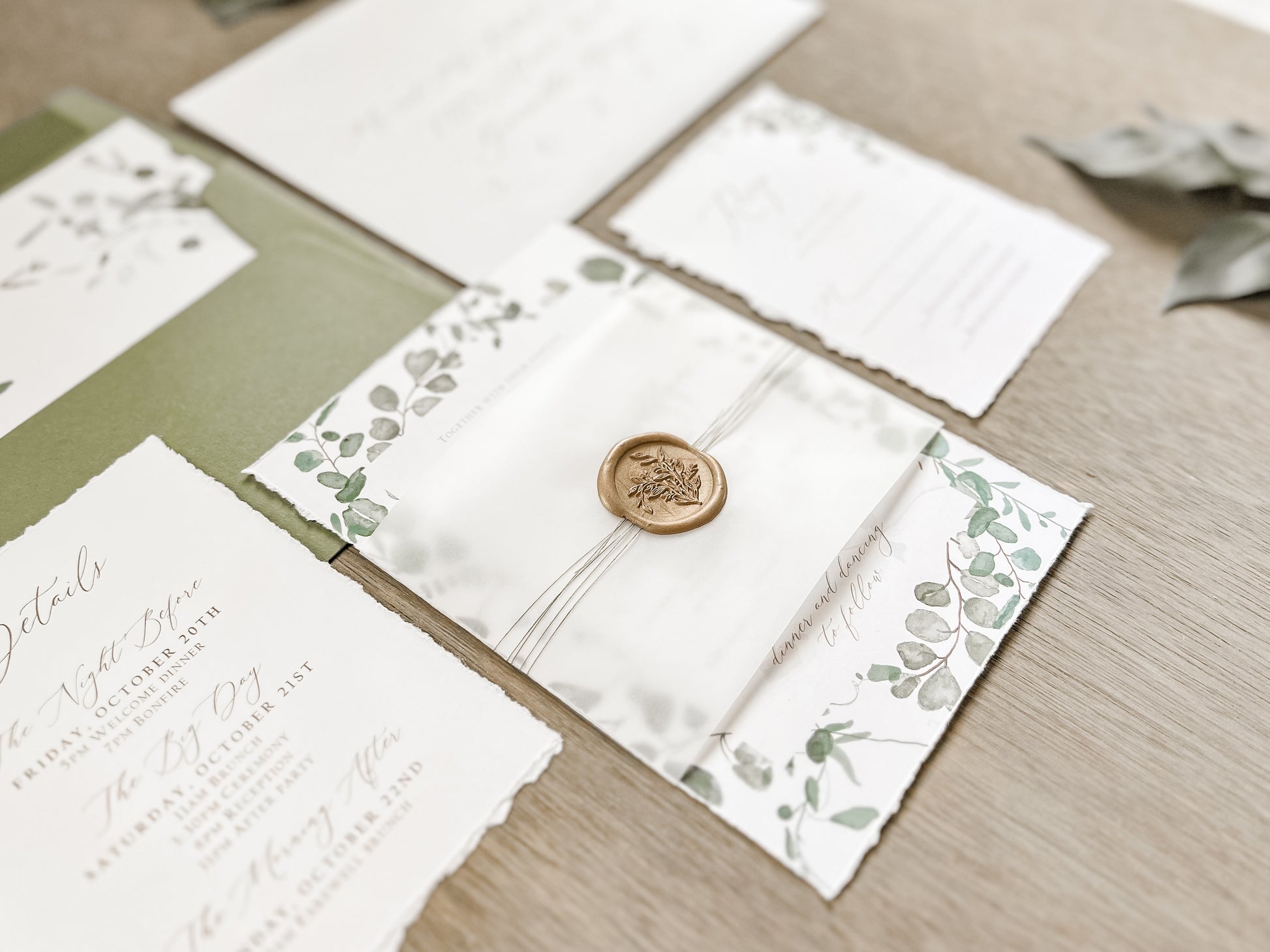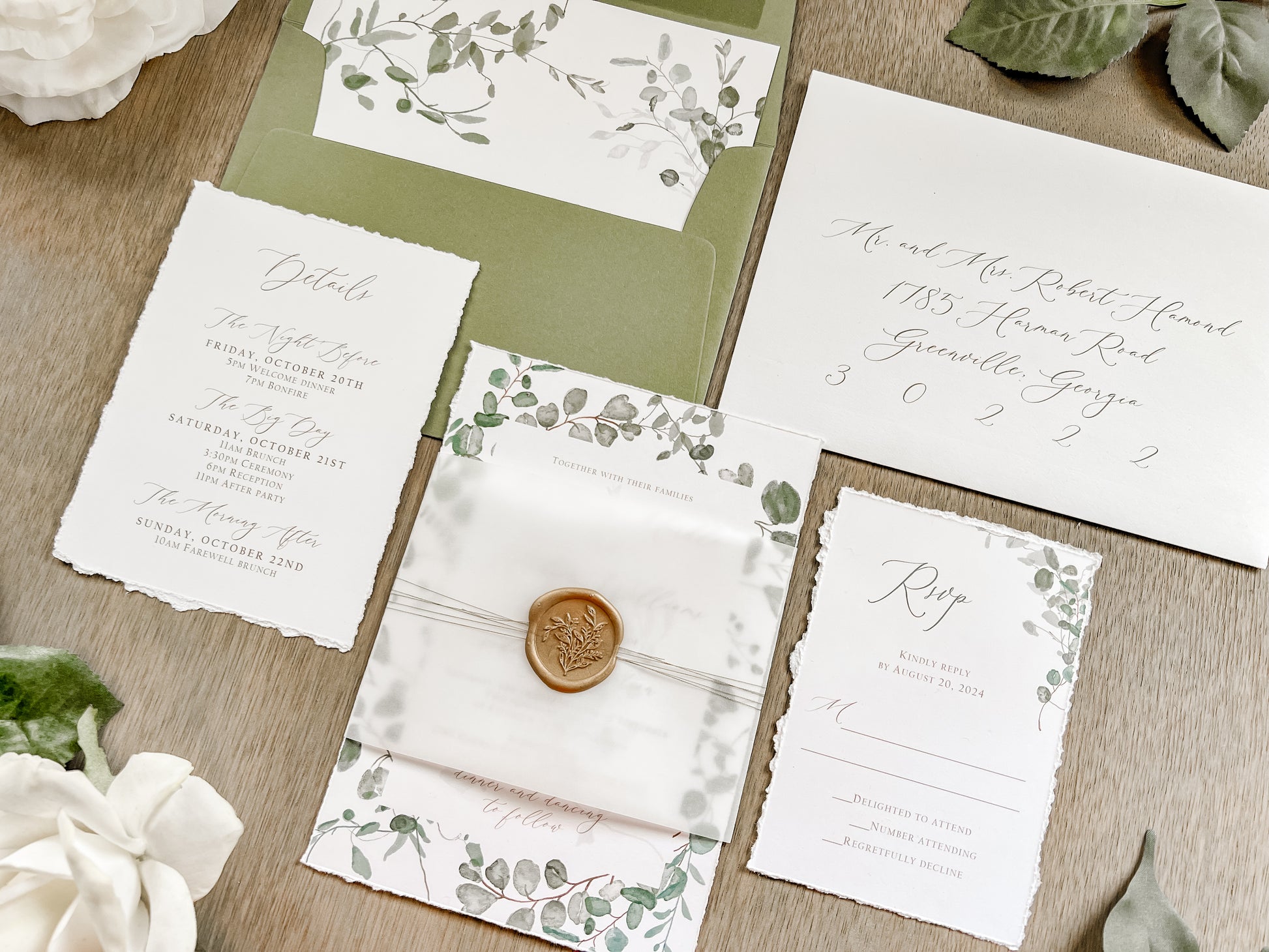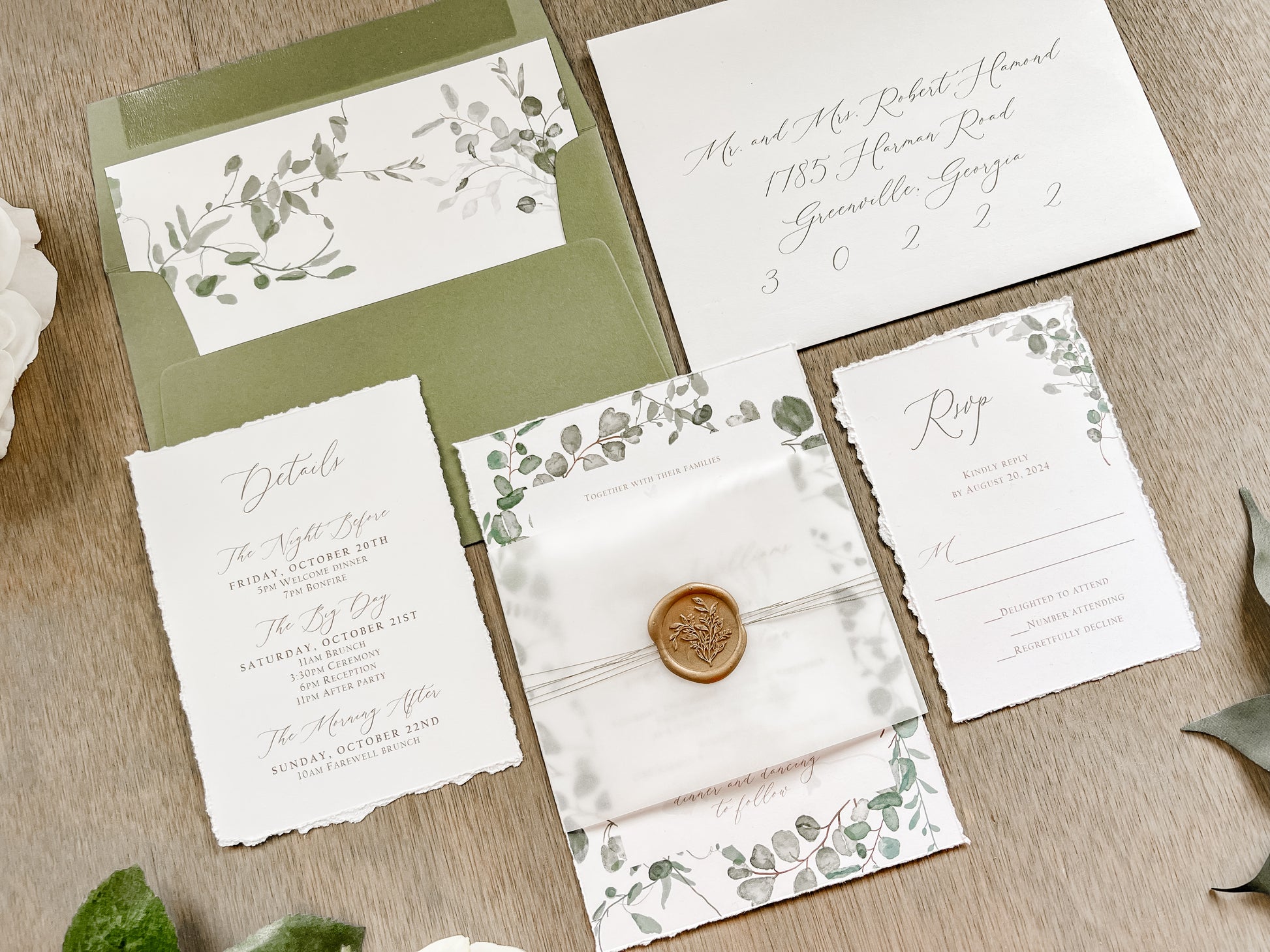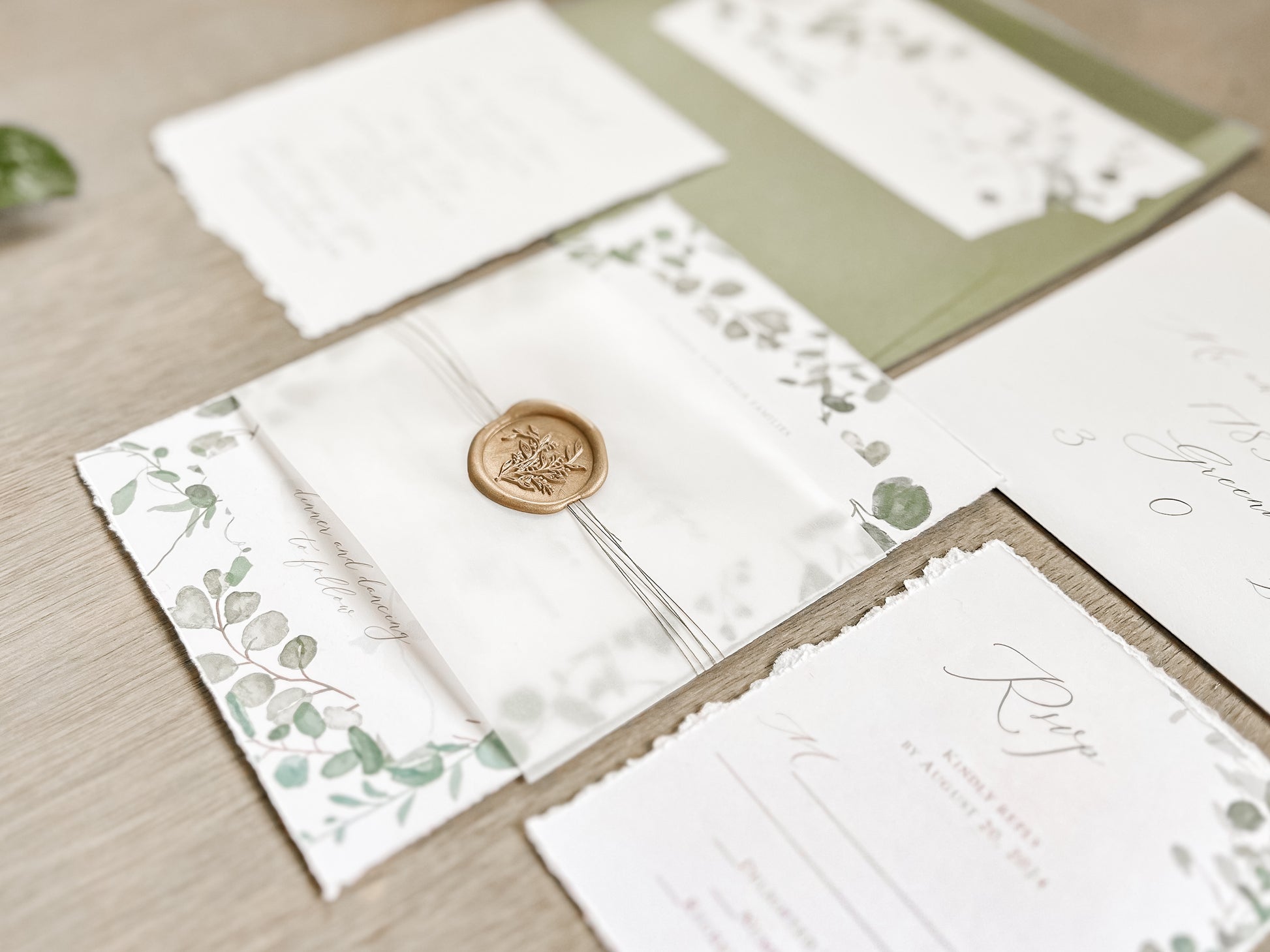 Eucalyptus Greenery Wedding Invitation with Deckled Edging, Vellum Belly Band and Wax Seal