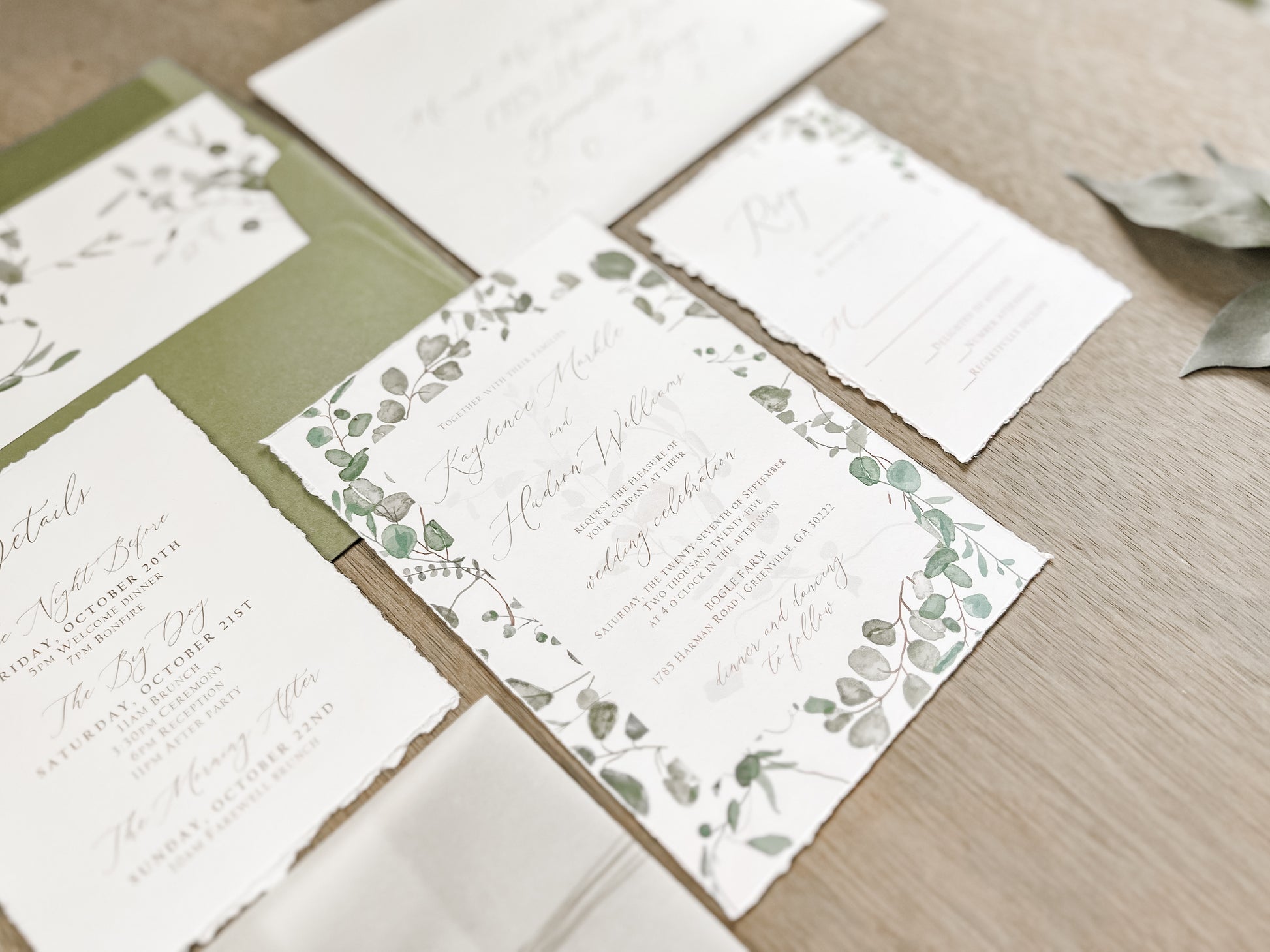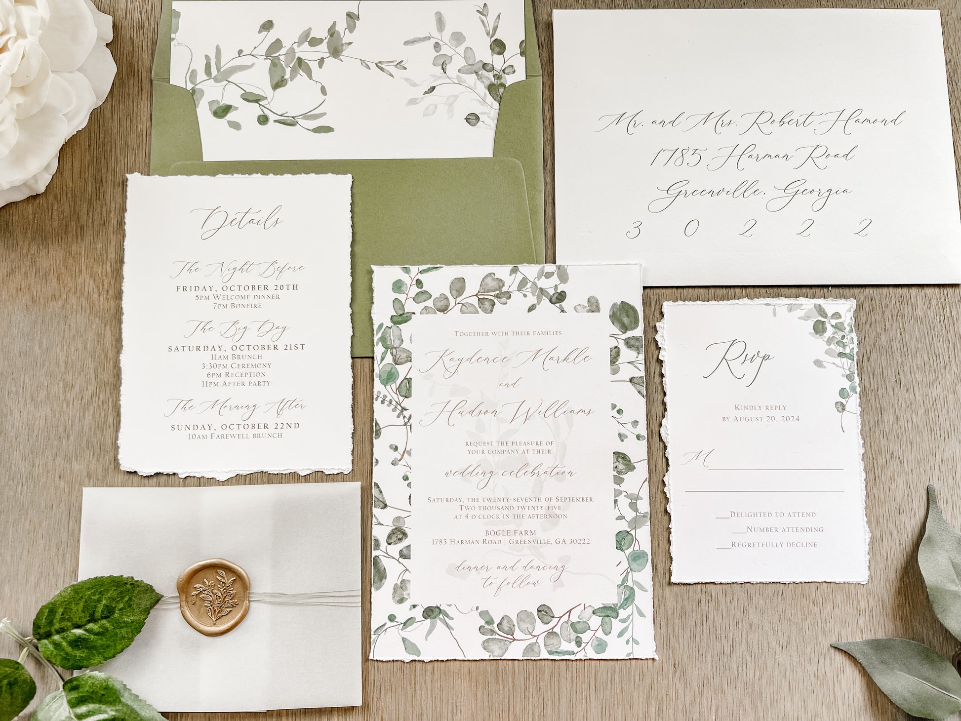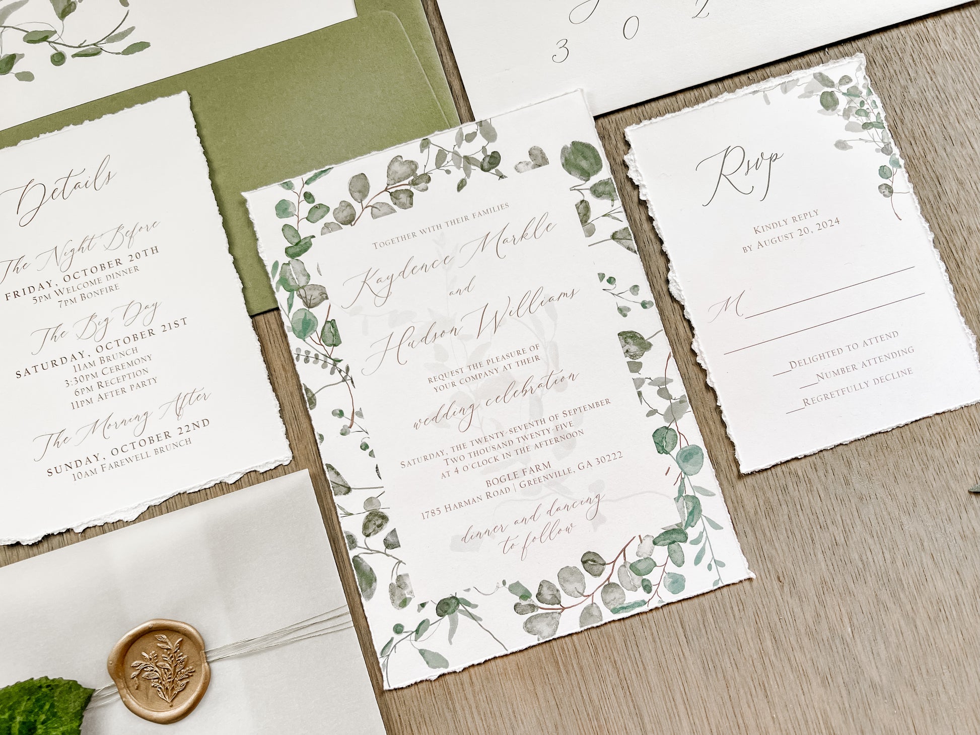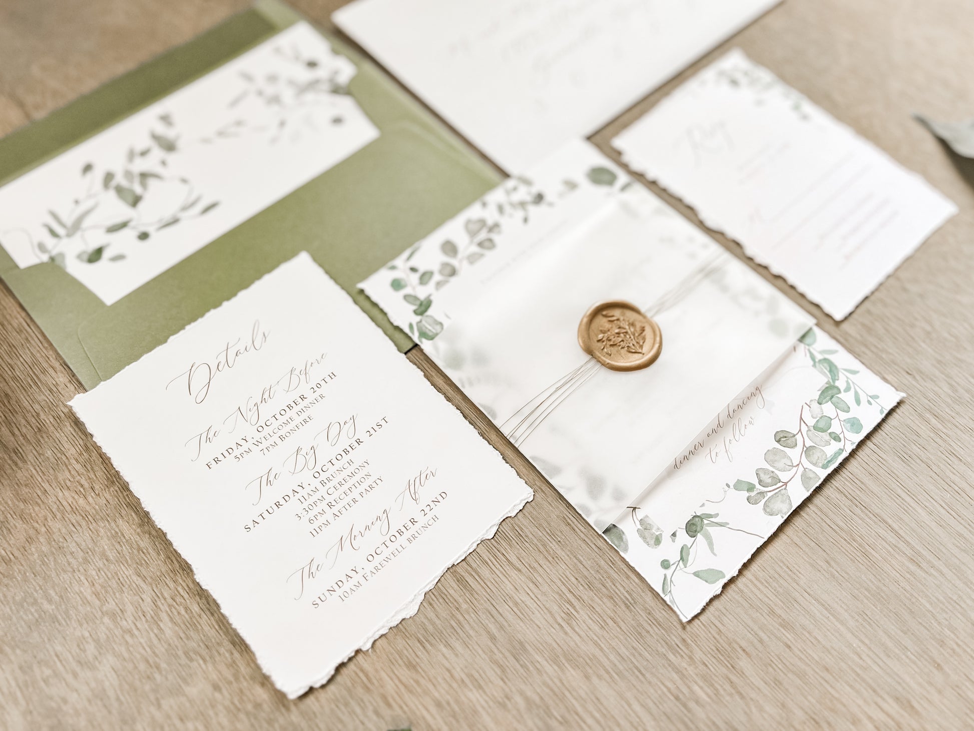 Eucalyptus Greenery Wedding Invitation with Deckled Edging, Vellum Belly Band and Wax Seal