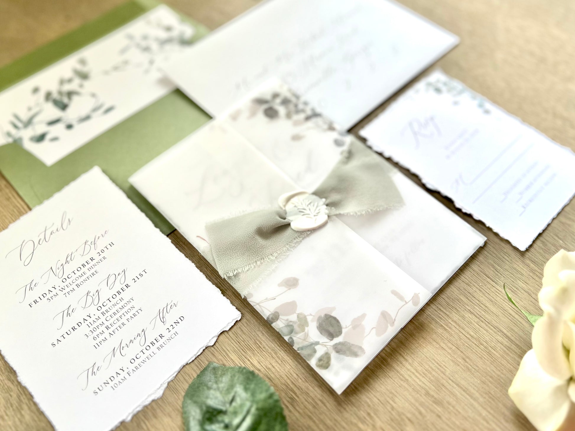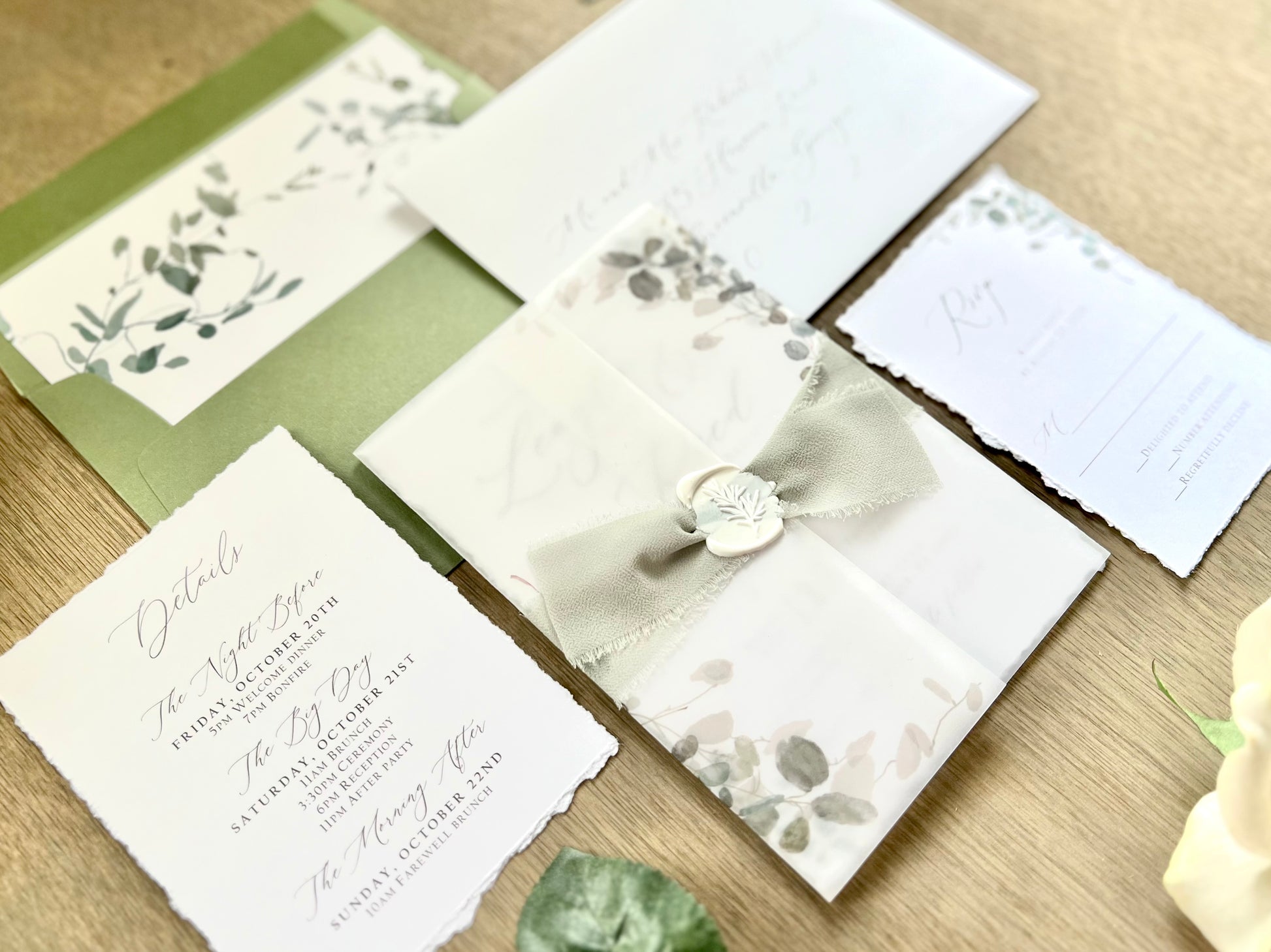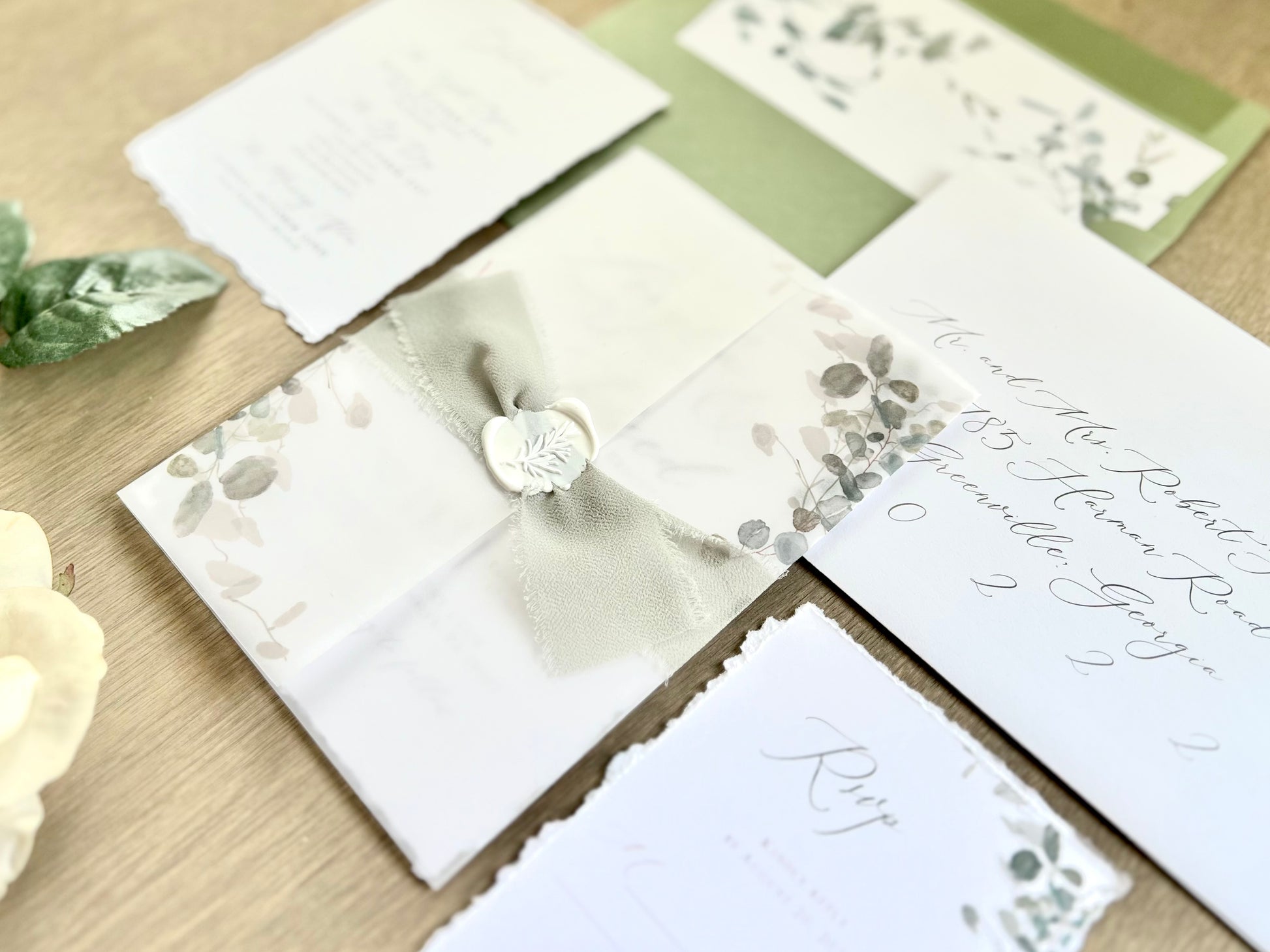 Greenery Vellum Wedding Invitation with Ribbon, Wax Seal & Deckled Edge
