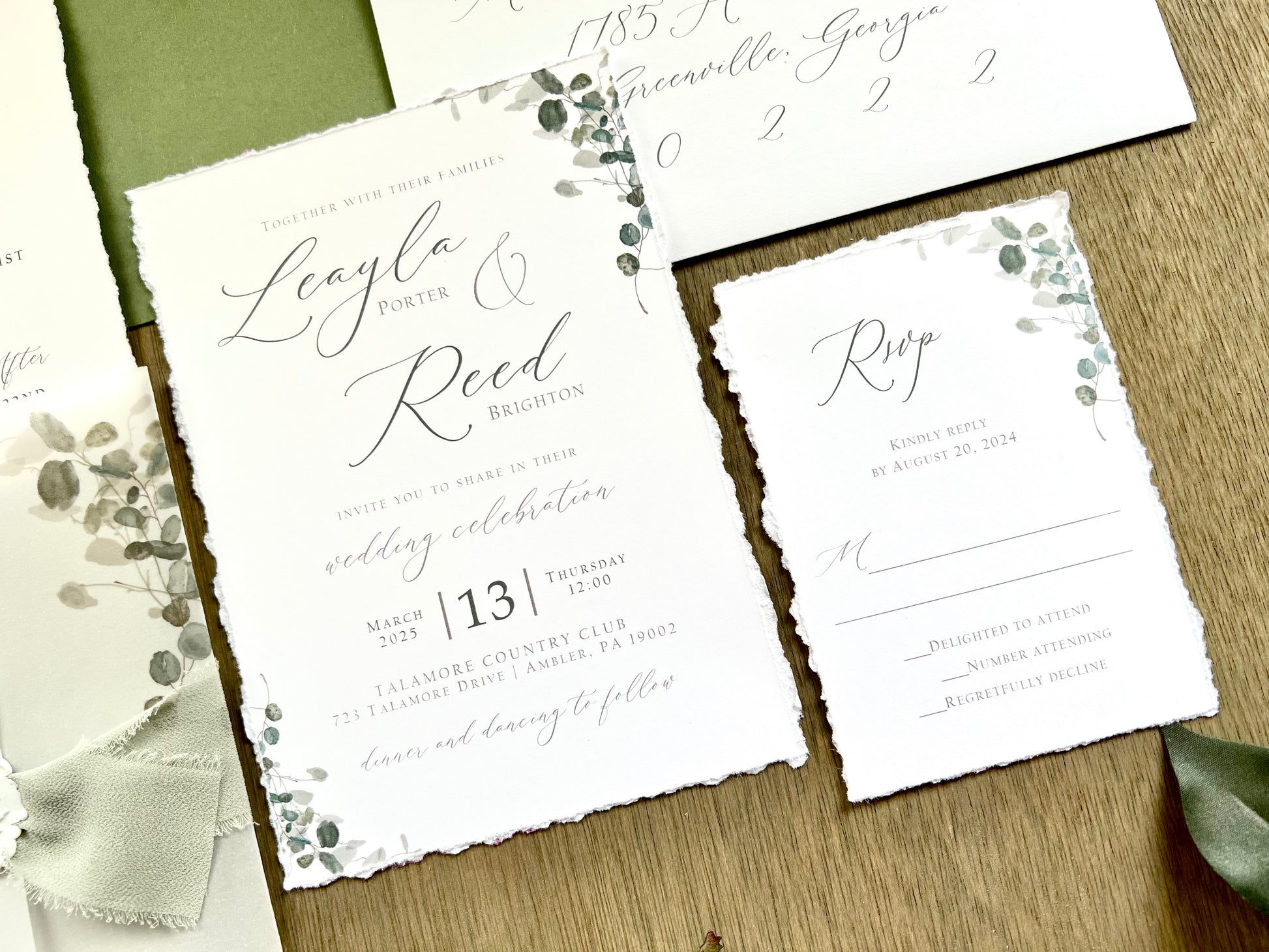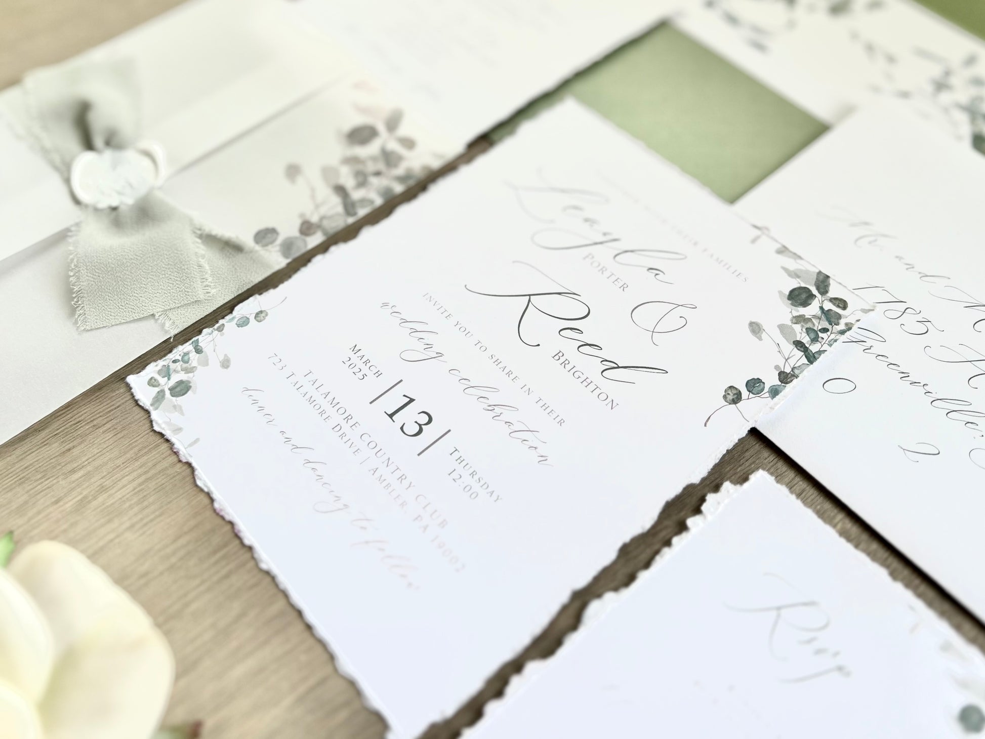 This elegant greenery wedding invitation is printed on 100 lb smooth white cover stock with hand torn deckled edges. Wrapped in eucalyptus vellum with muted dusty sage green chiffon ribbon and secured with a botanical white wax seal! Invitation can also be printed on ivory stock as well. Just add the color change in the notes at checkout.