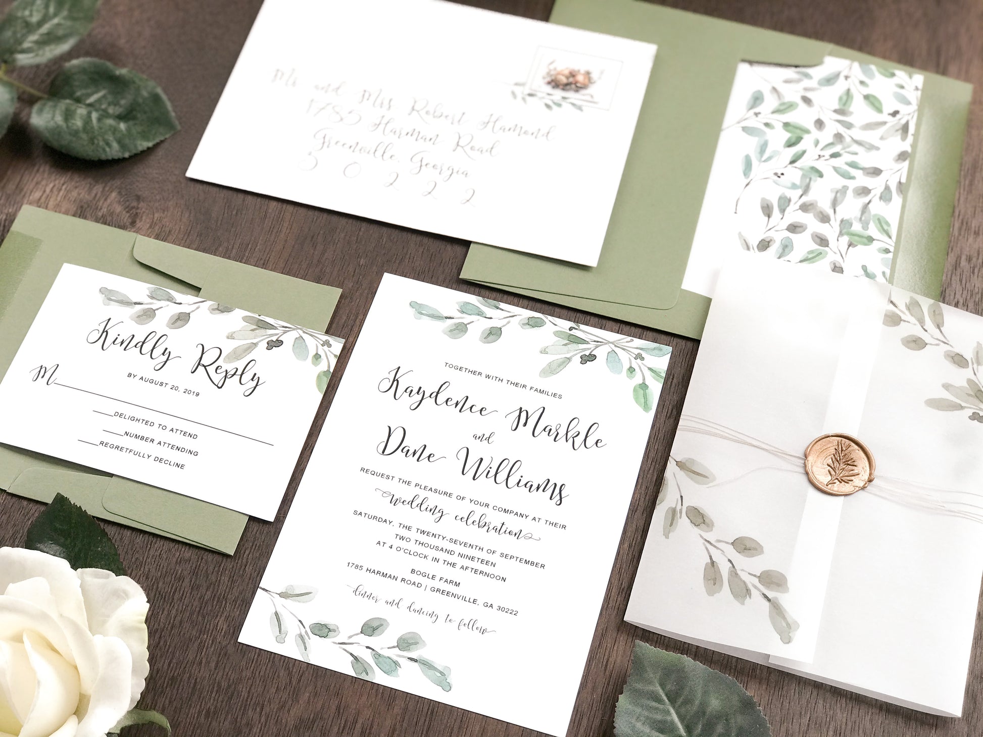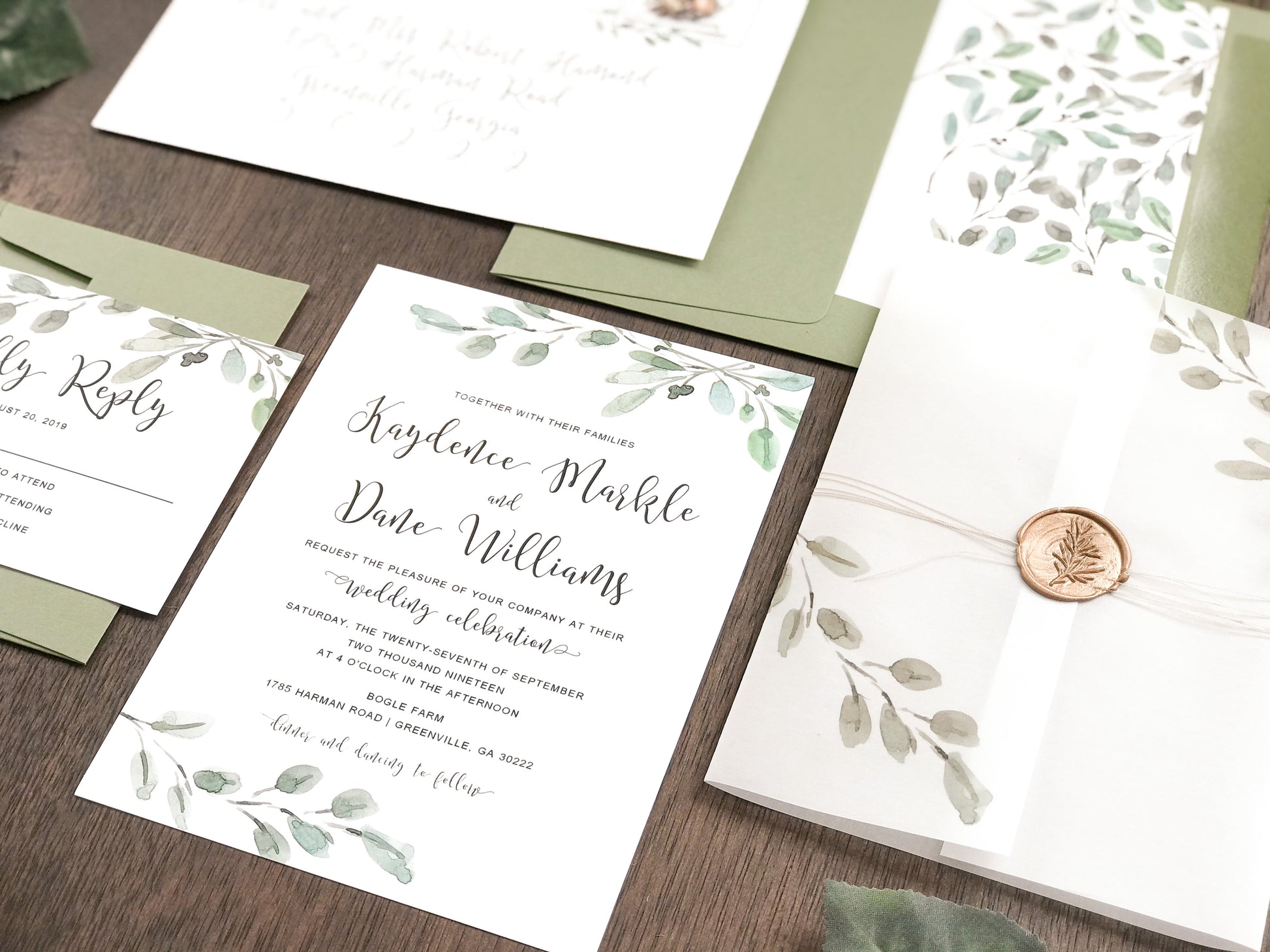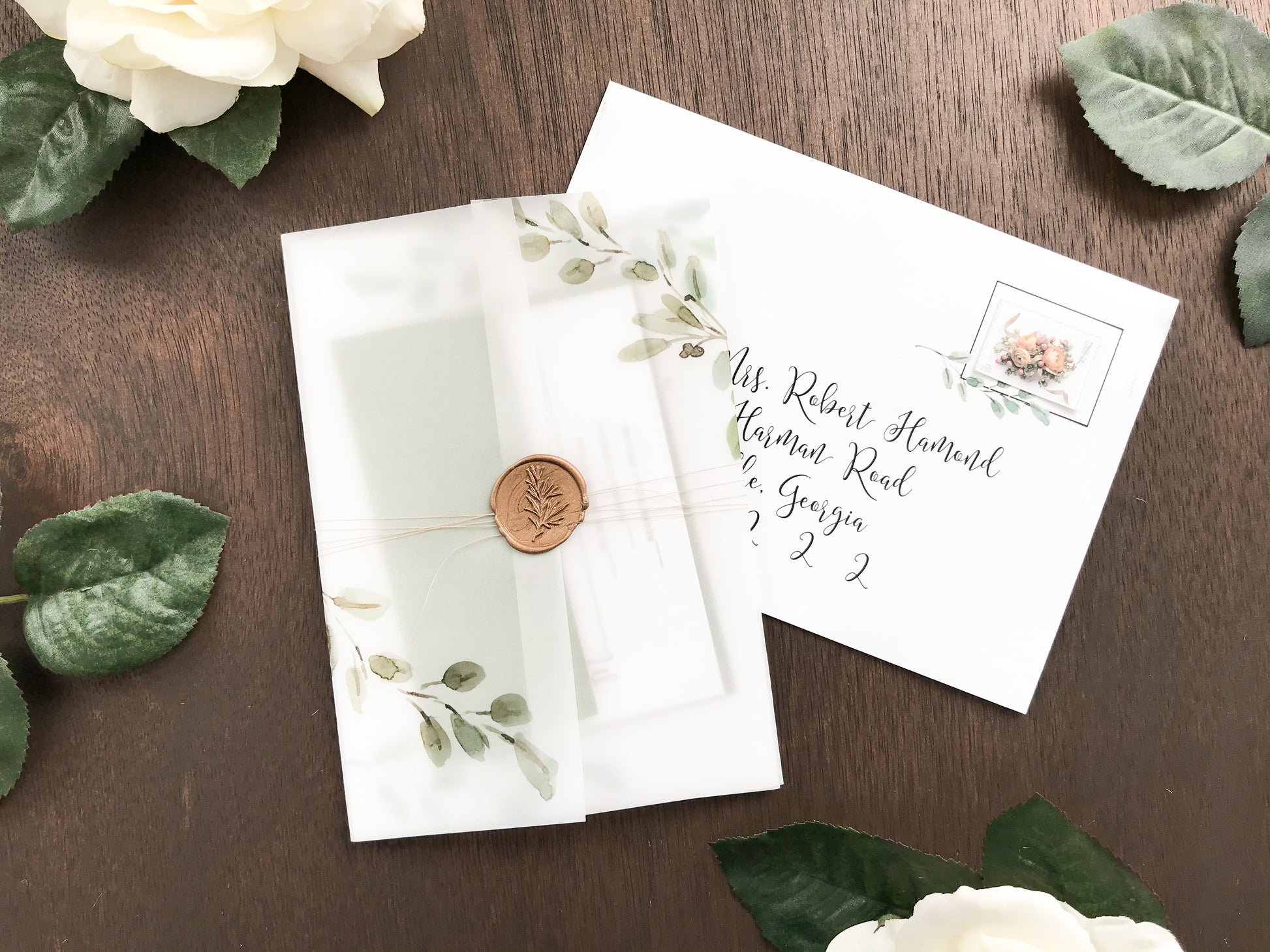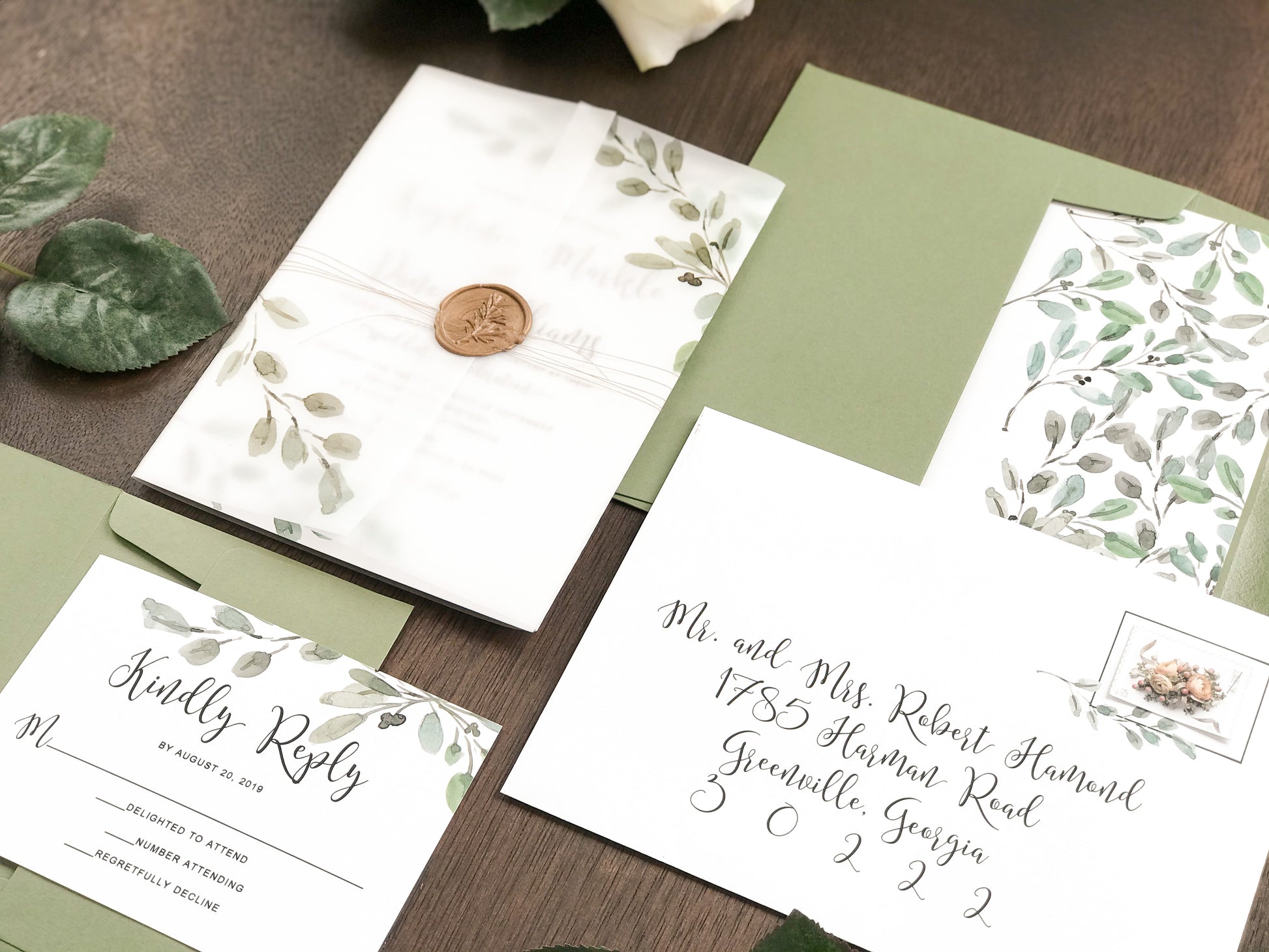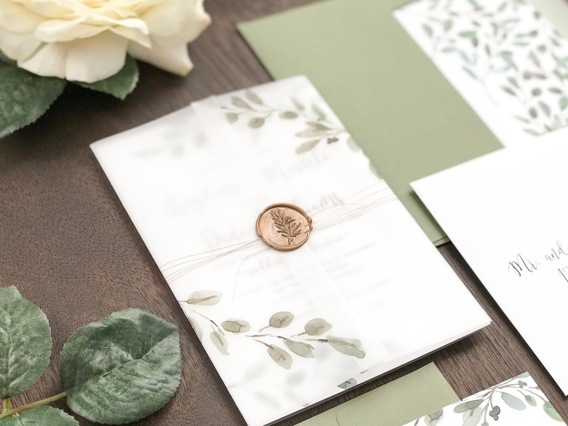 This gorgeous greenery invitation has all the modern elements! Delicate modern calligraphy printed on smooth 160 lb white cover stock wrapped in vellum with printed greenery and khaki thread then secured with a botanical wax seal! Antique gold wax is shown in the listing pictures. Green and white wax are also popular but nearly any color wax can be used. Please inquire for a specific color. Can also be printed on ivory stock as well. Just add the color change in the notes at checkout.