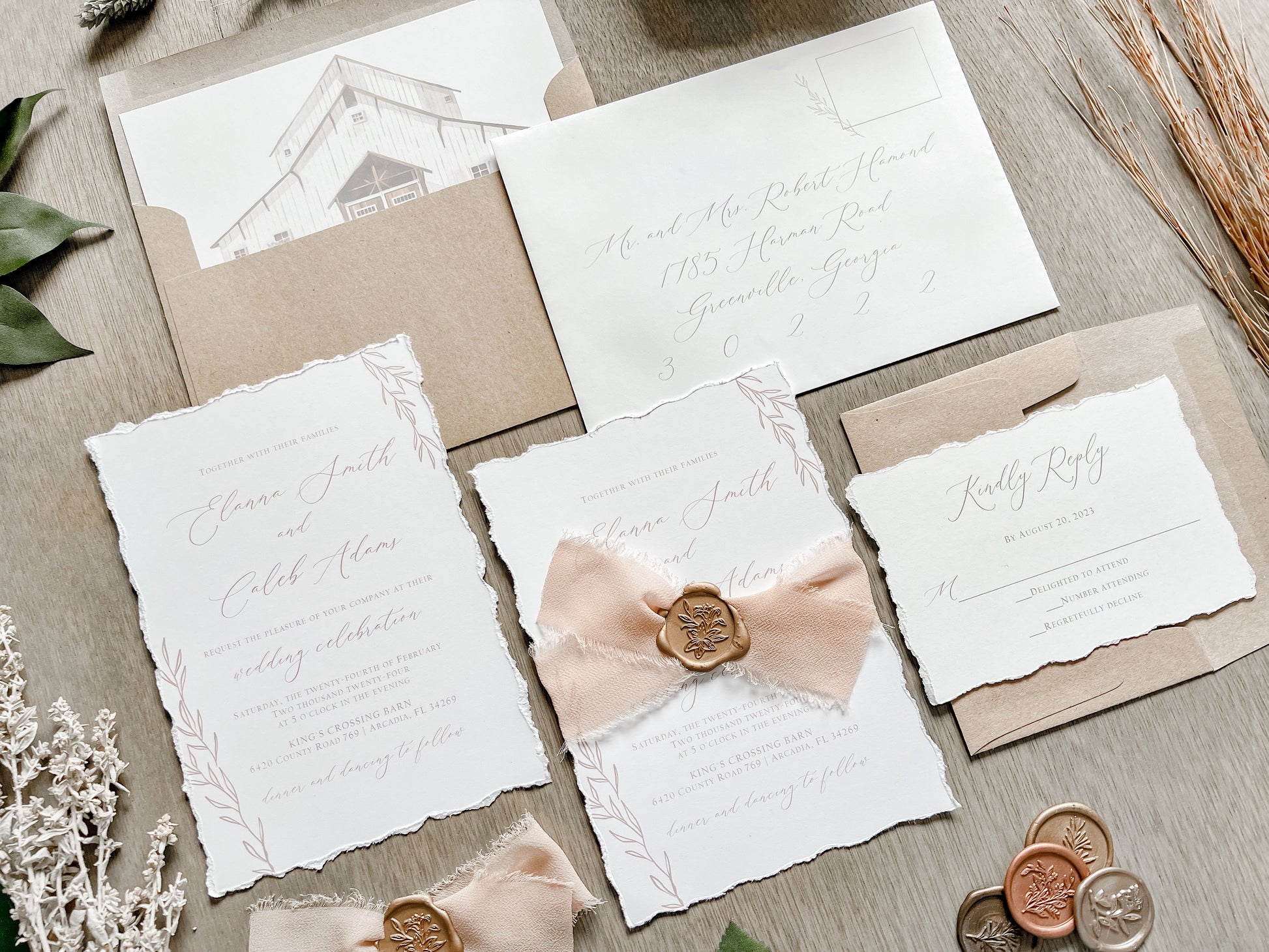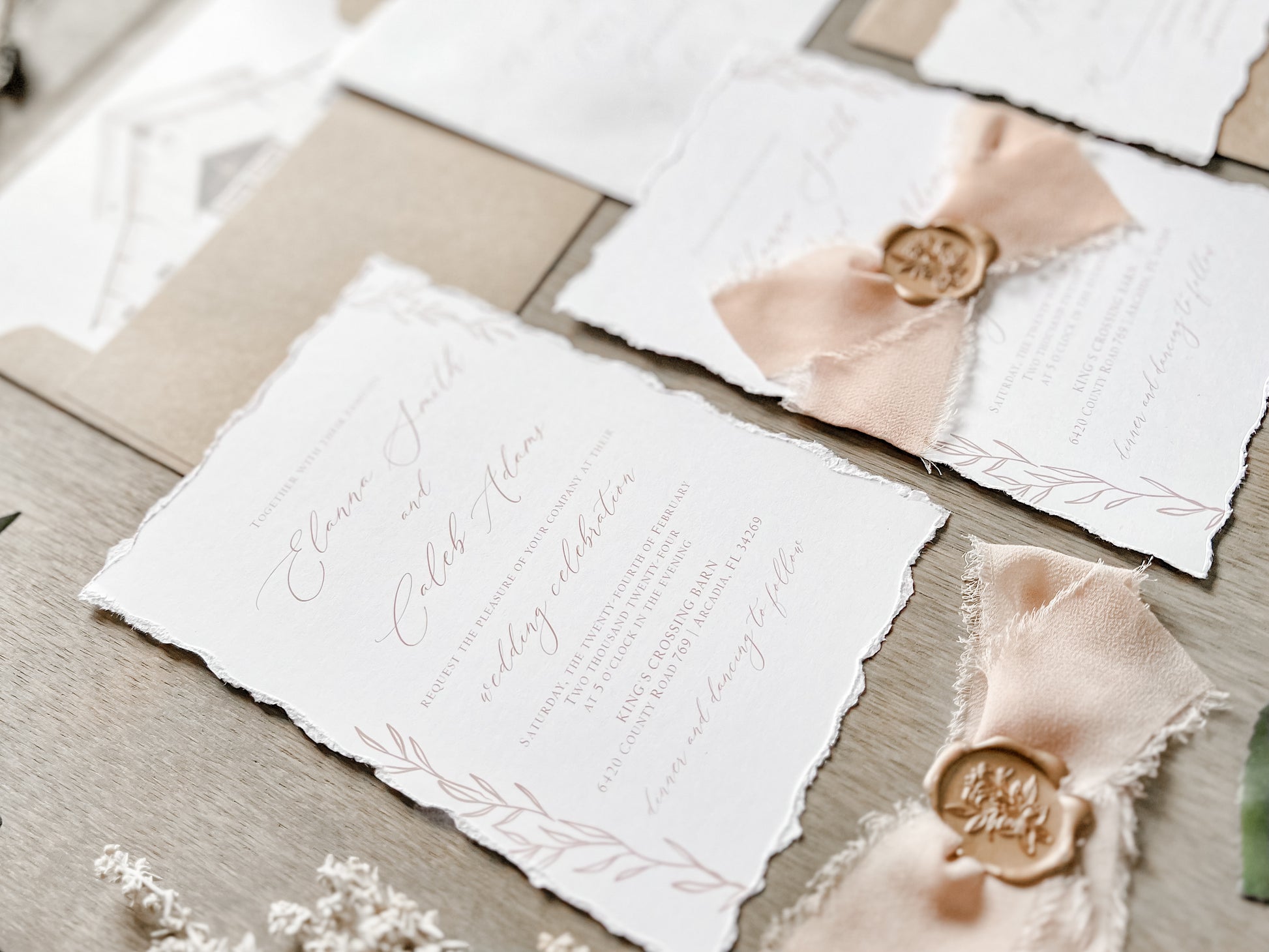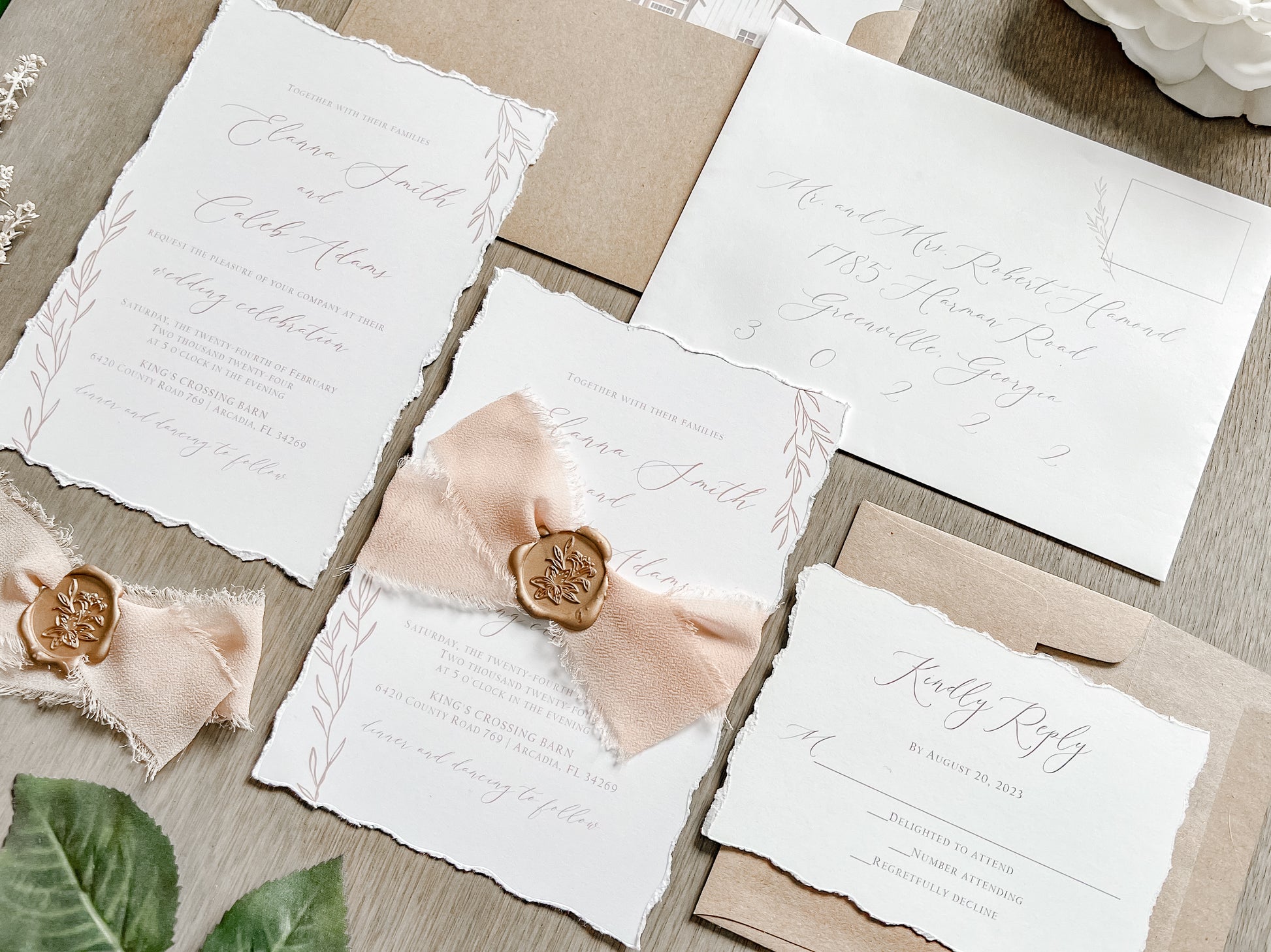 This elegant, traditional-style wedding invitation is printed on 100 lb white cover stock with deckled edges for a refined, artisanal finish. The suite is wrapped in a nude brown chiffon ribbon belly band and sealed with an antique gold wax seal - an understated, romantic pairing. Text is printed in a warm, light brown hue to beautifully complement the ribbon. Ribbon and wax seal colors are fully customizable - please inquire to tailor the palette to your vision. Can also be printed on ivory or beige stock as well. Just add the color change in the notes at checkout. Pictures show kraft envelopes.