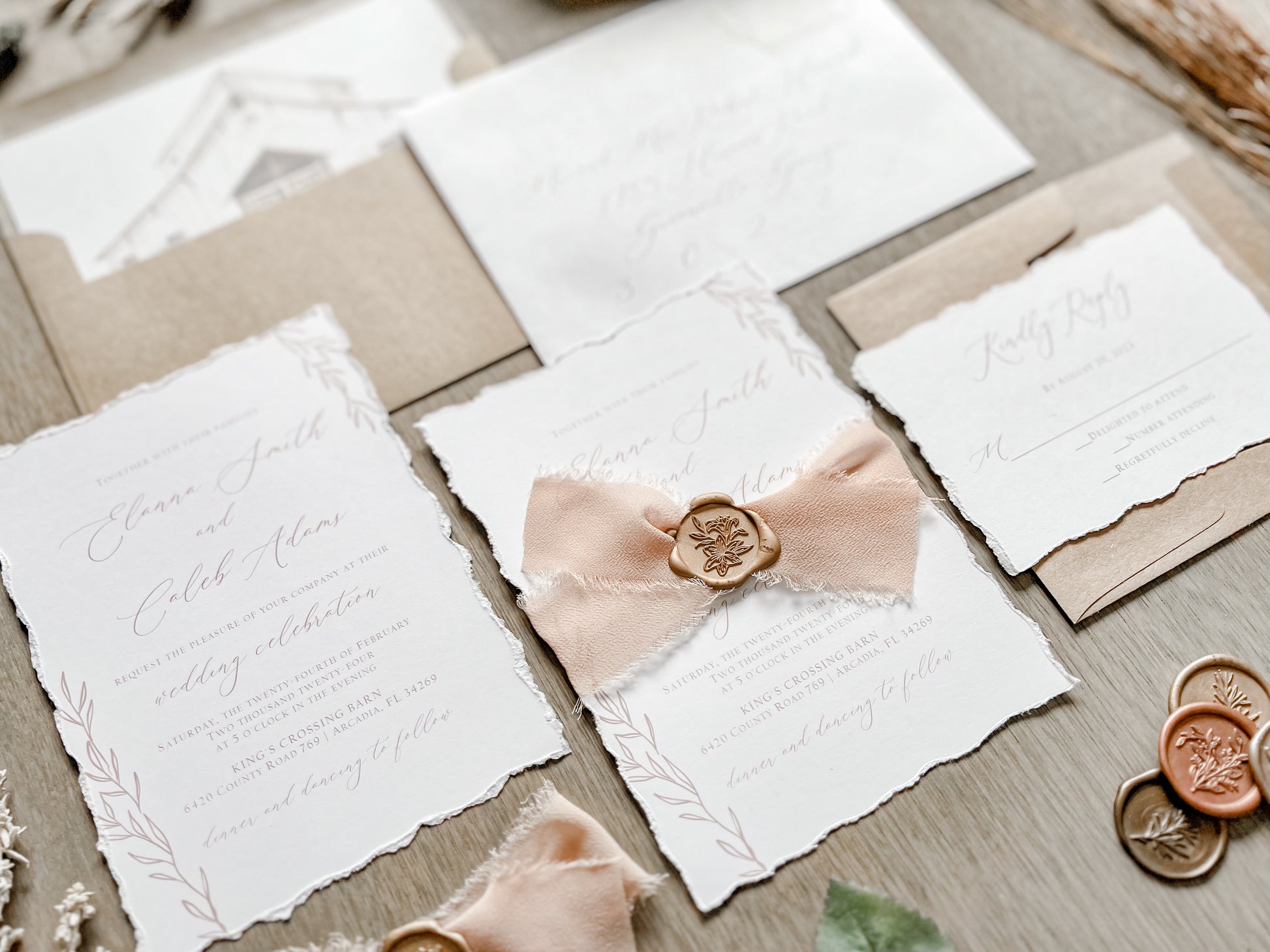 Light Brown Ribbon Wedding Invitation with Deckled Edging & Antique Gold Wax Seal