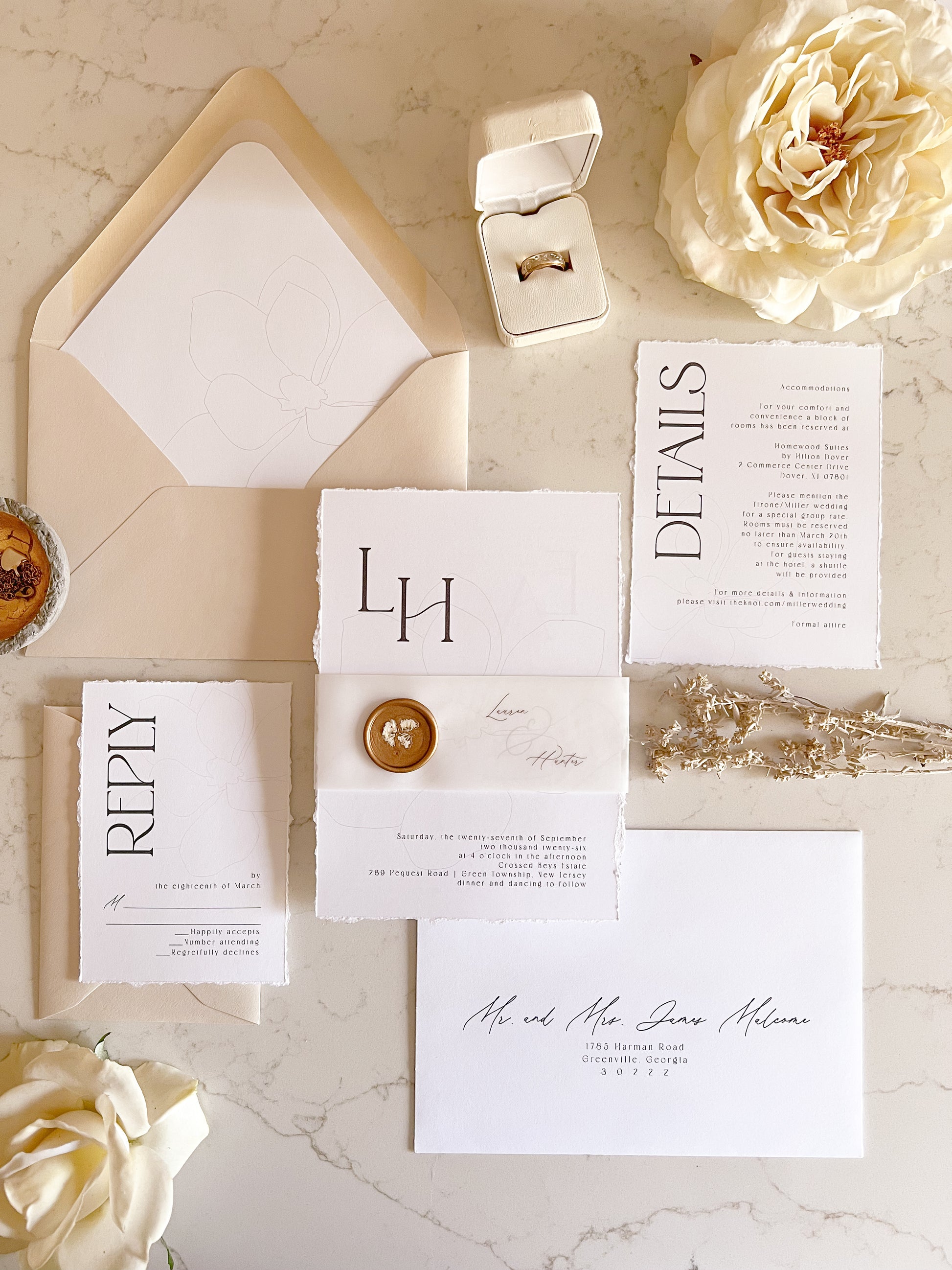 Modern Magnolia Wedding Invitation with Vellum & Wax seal