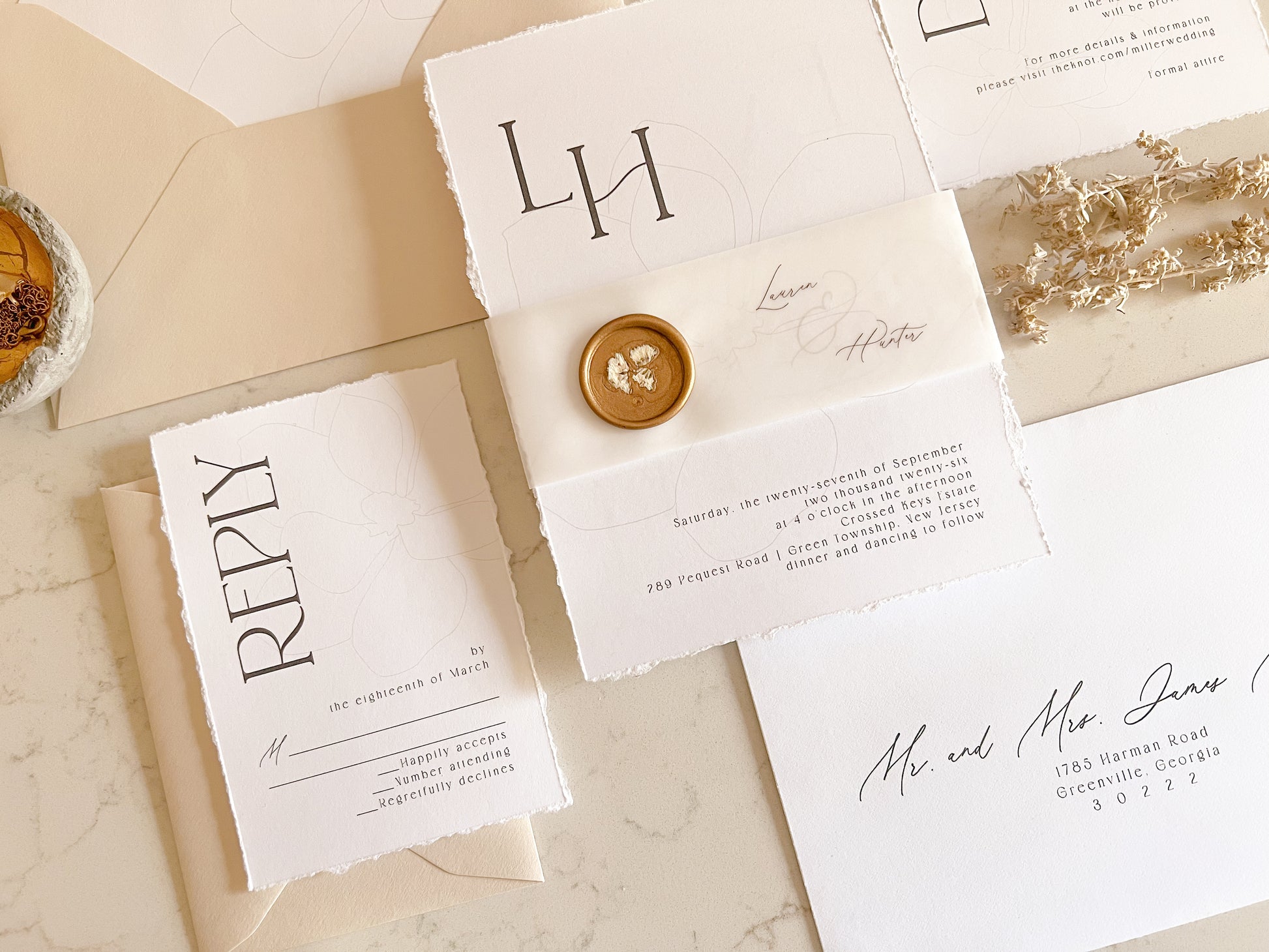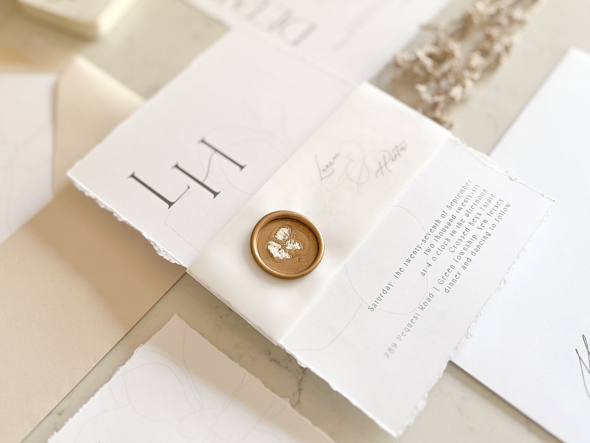 This elegant wedding invitation suite is printed on smooth 100 lb white cover stock and finished with hand-torn deckled edges for a refined, handmade look. The invitation features a subtle magnolia background and is wrapped in translucent vellum and secured with an antique gold wax seal accented with delicate dried baby’s breath petals, creating an elegant finish to the neutral palette. With minimalist typography, this design blends modern simplicity with timeless detail. Perfect for classic, modern and formal weddings, this invitation suite offers an understated yet distinctive presentation for couples seeking a sophisticated, neutral wedding aesthetic.