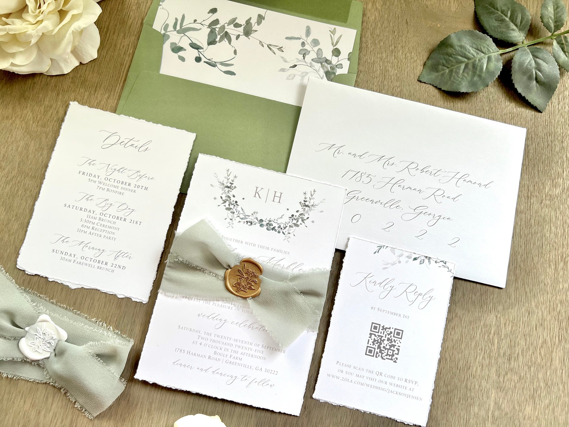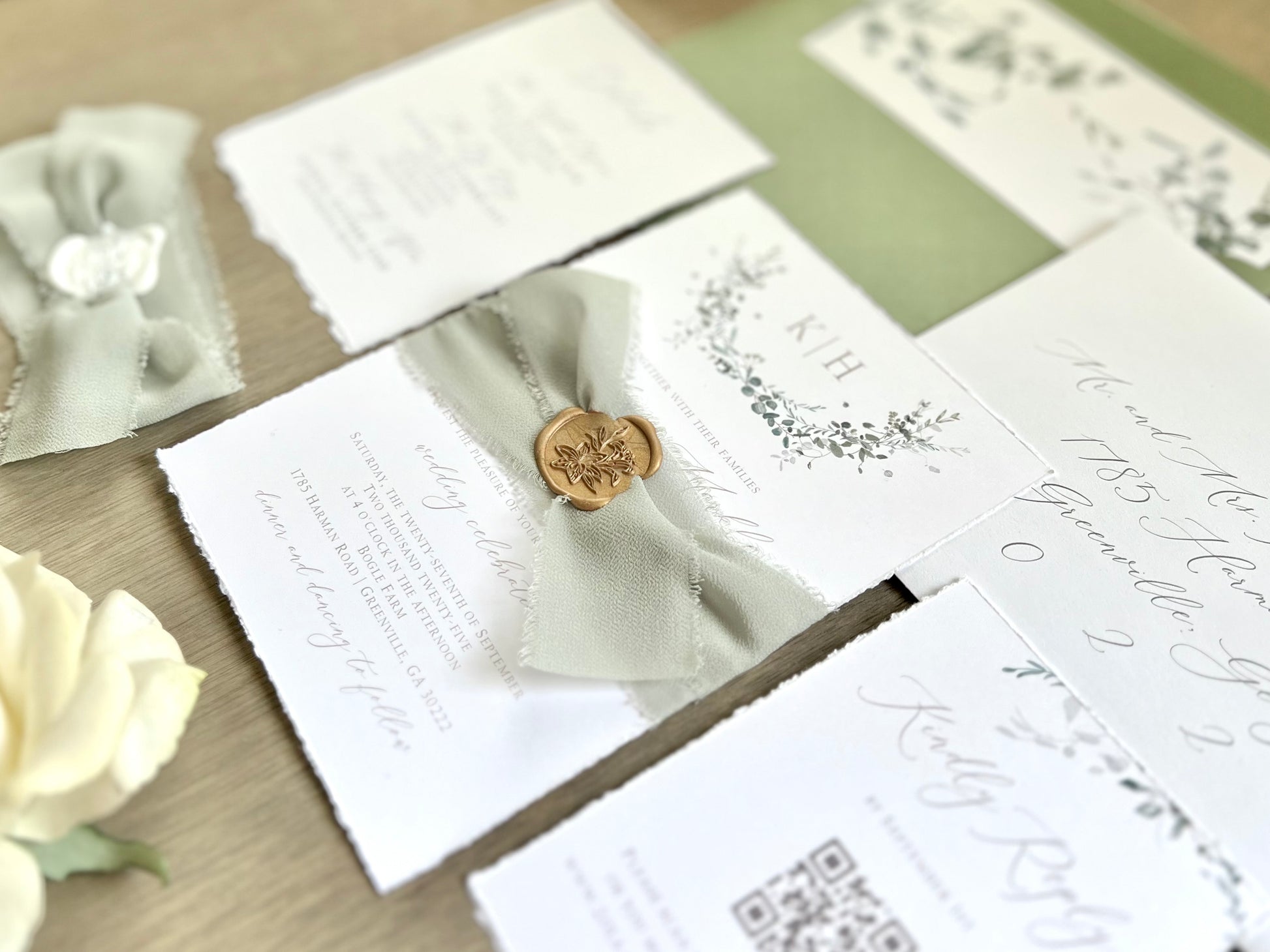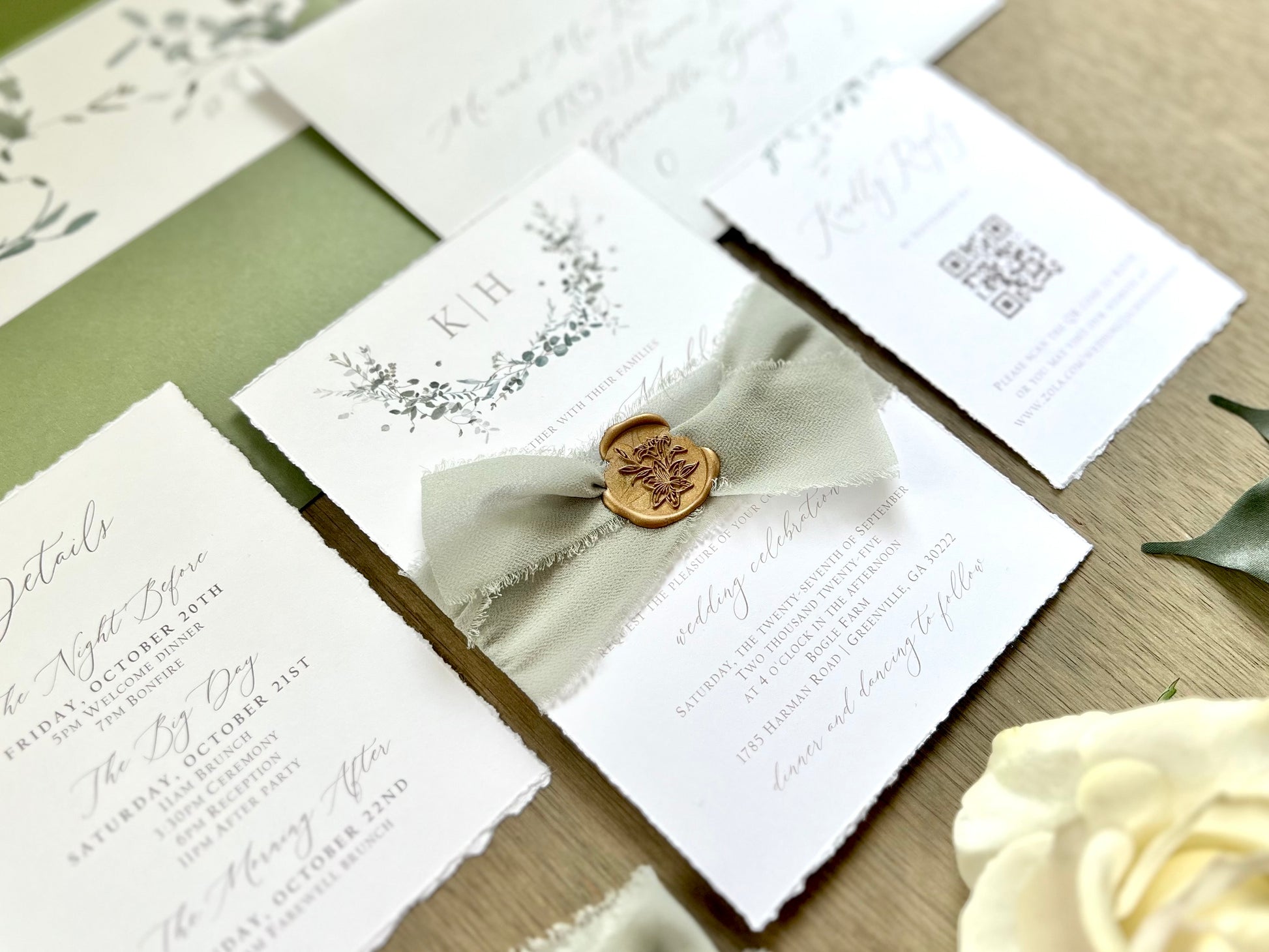 Monogram Laurel Wreath Wedding Invitation with Muted Sage Green Chiffon Ribbon & Wax Seal with Deckled Edging