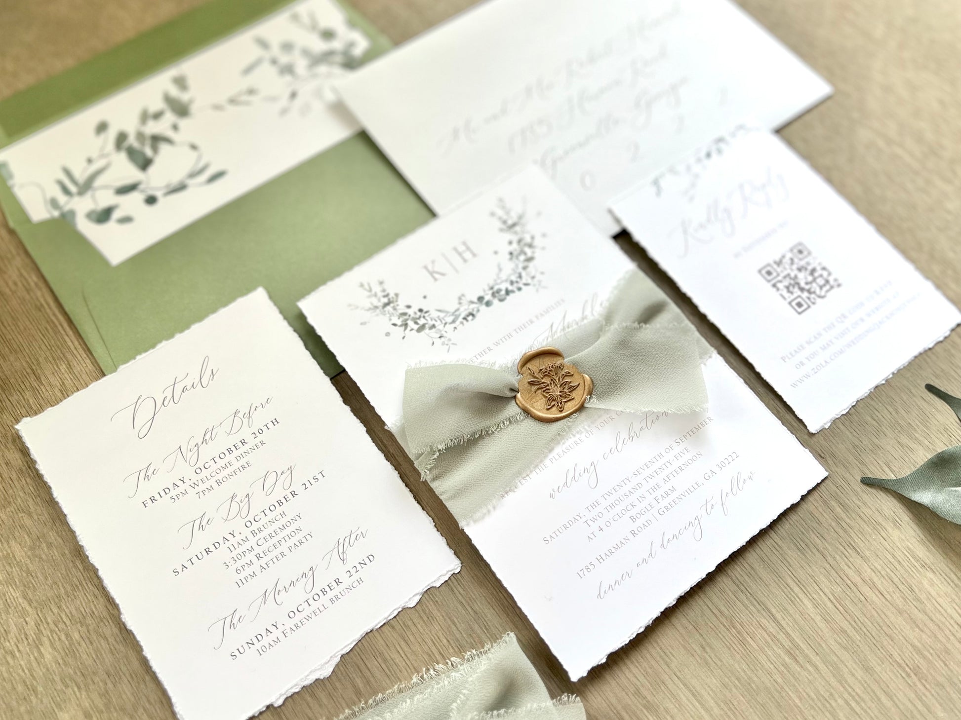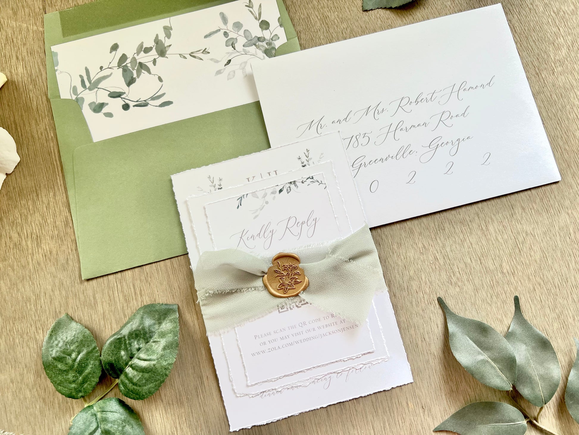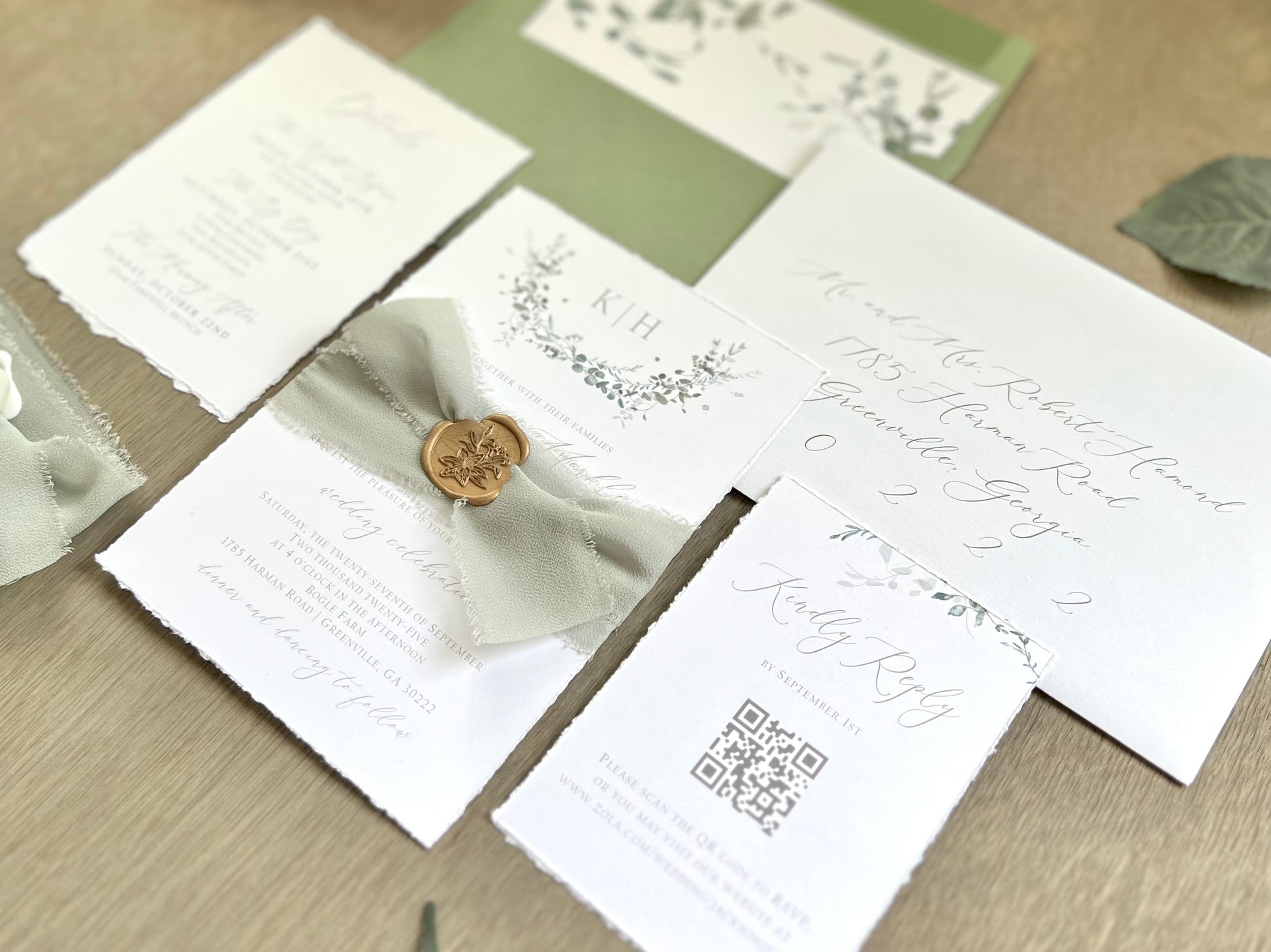 Monogram Laurel Wreath Wedding Invitation with Muted Sage Green Chiffon Ribbon & Wax Seal with Deckled Edging