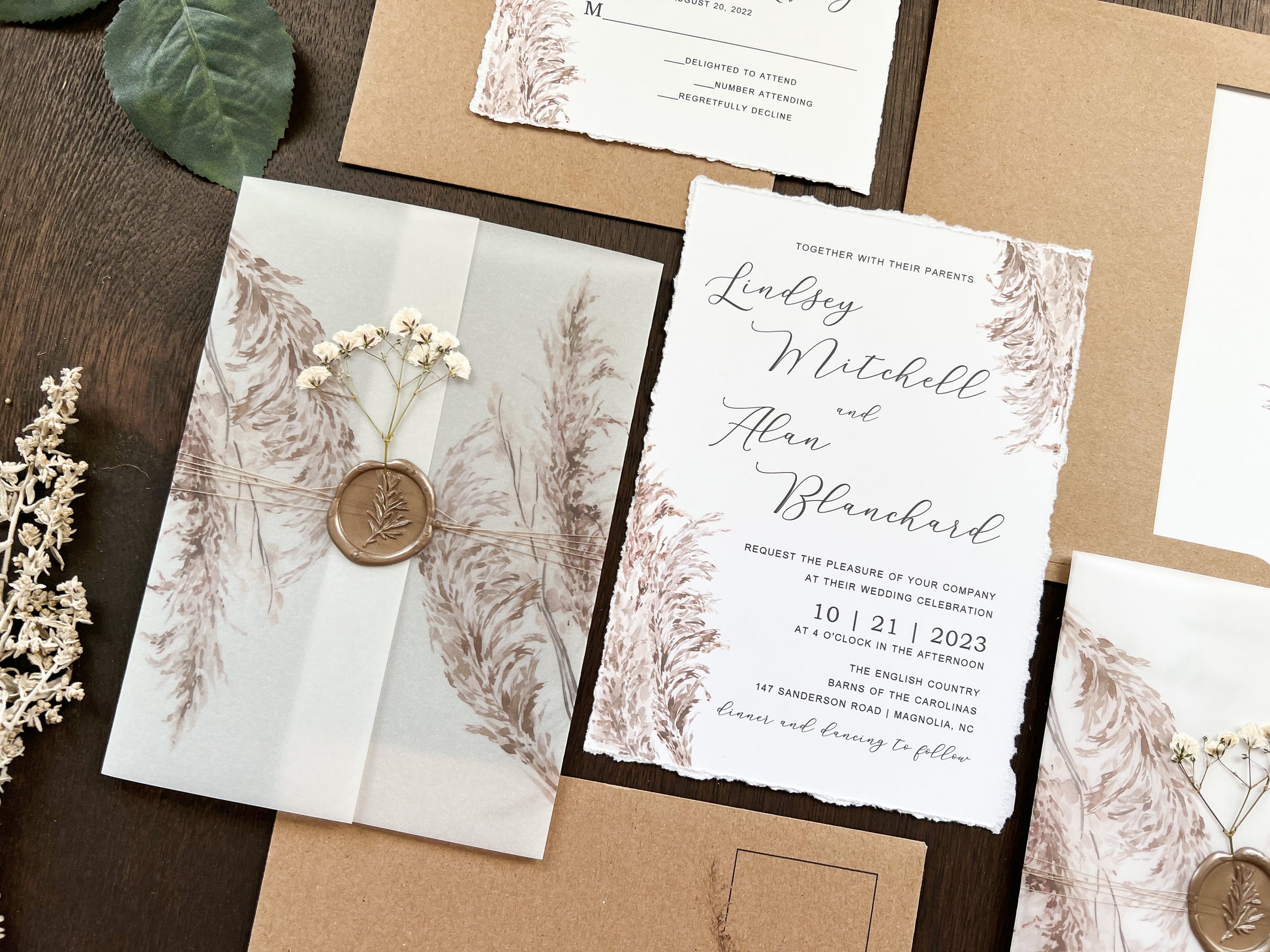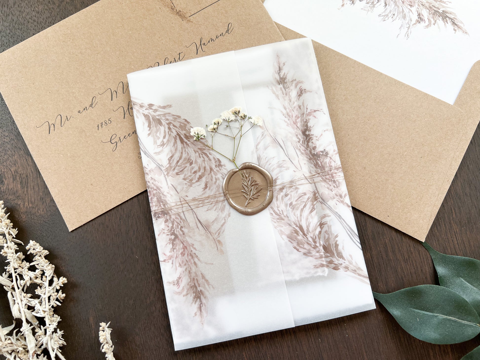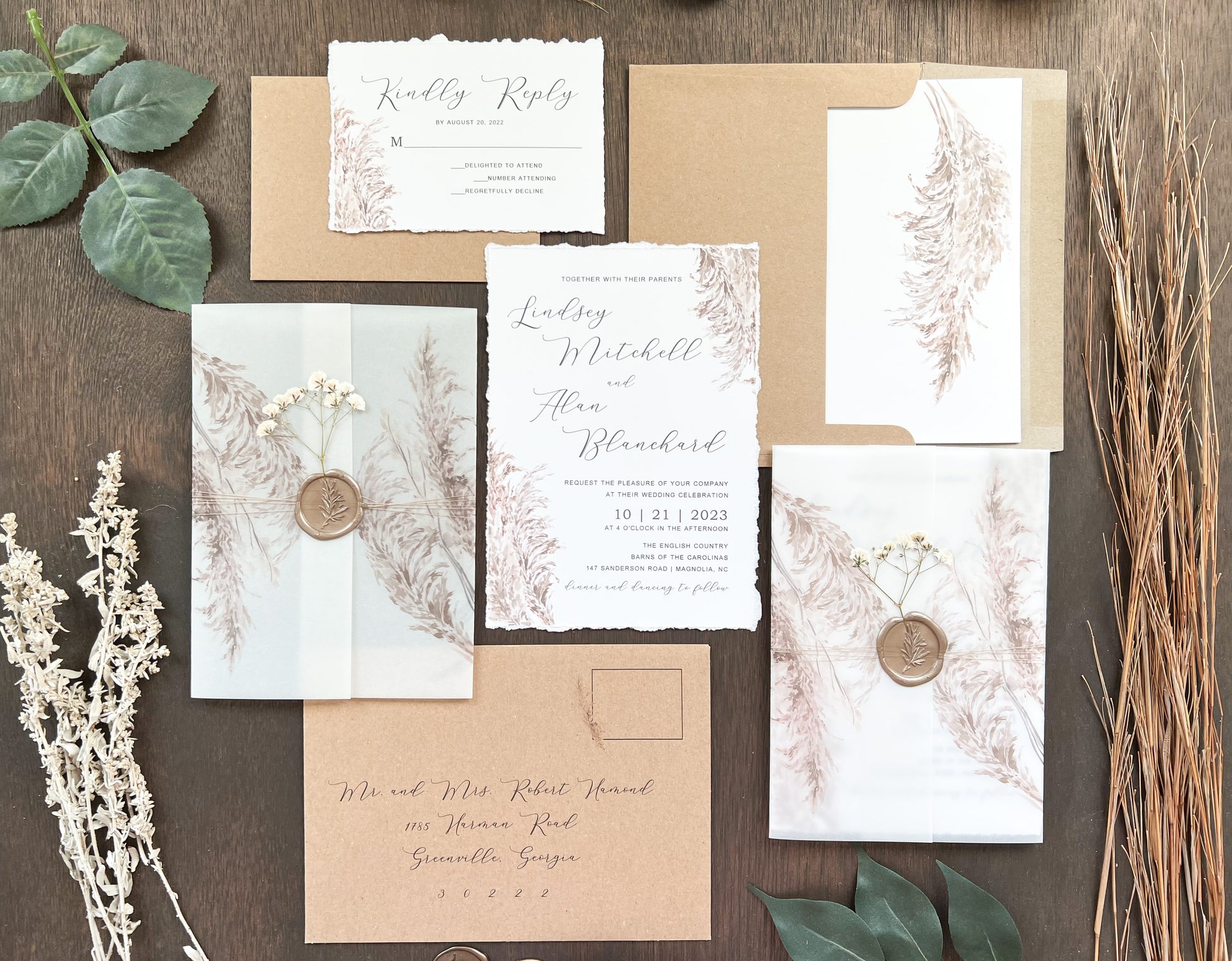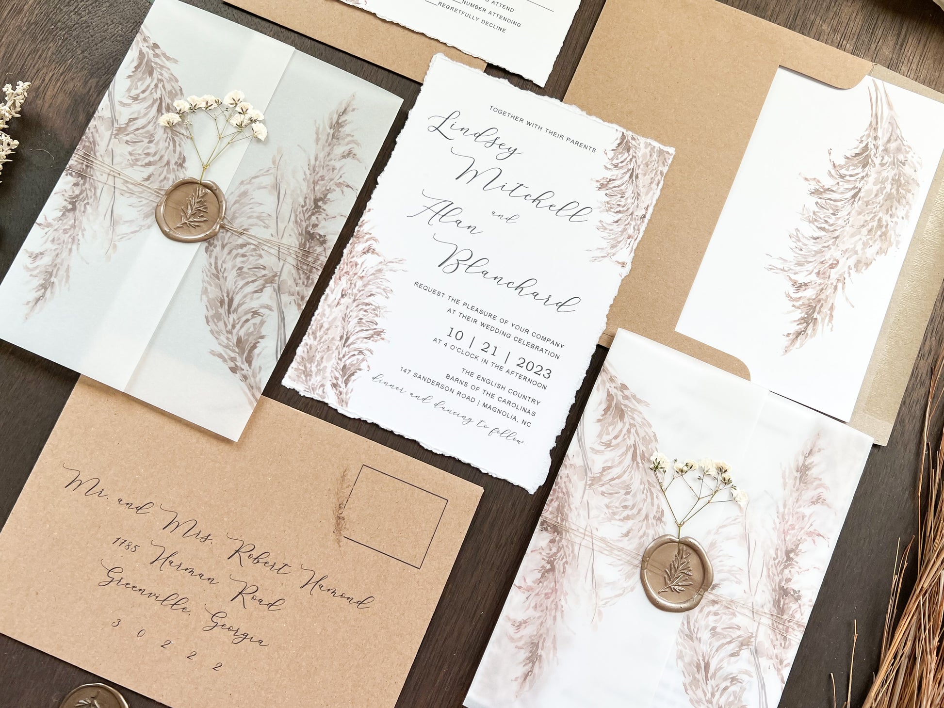 Pampas Grass and Baby’s Breath Wedding Invitation with Deckled Edge, Vellum with Wax Seal