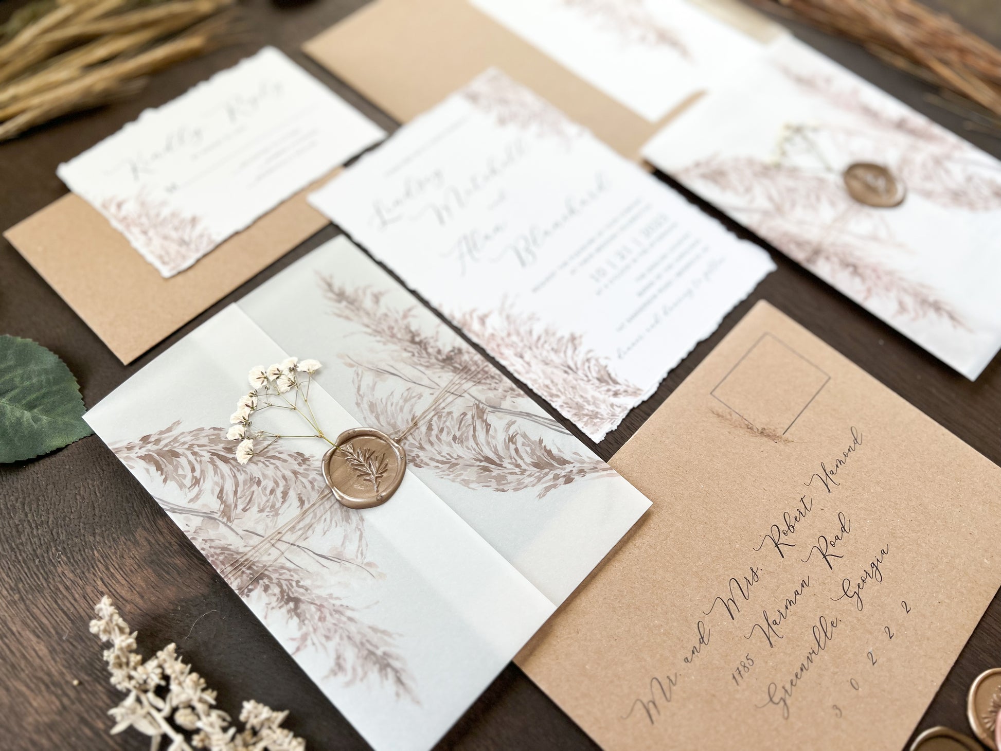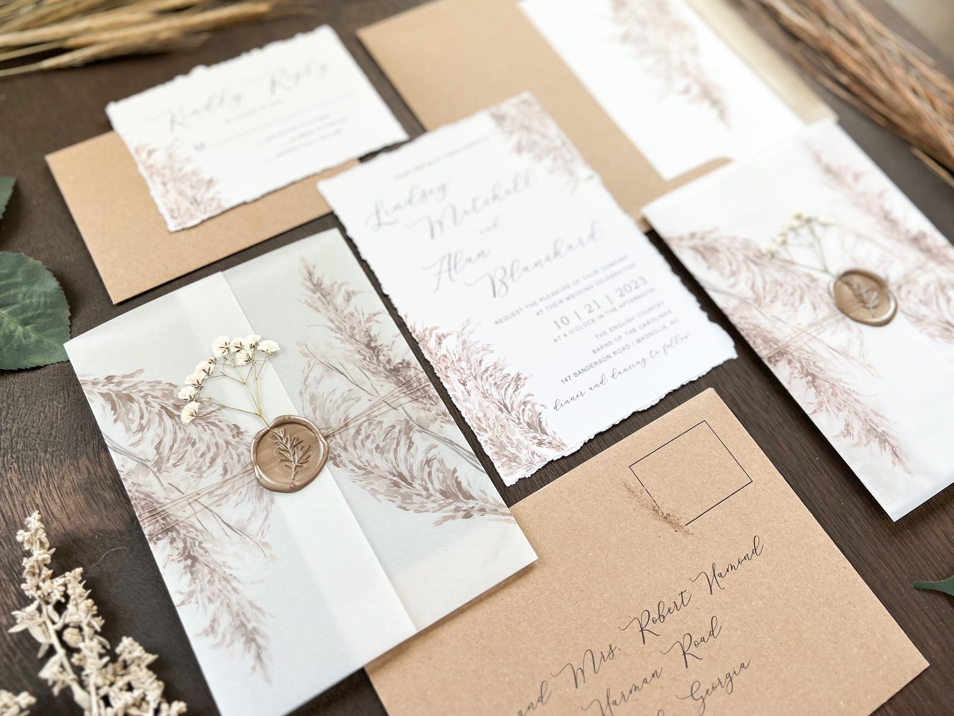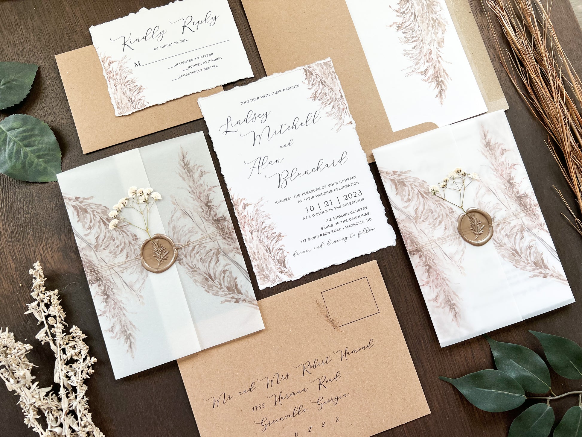 Pampas Grass and Baby’s Breath Wedding Invitation with Deckled Edge, Vellum with Wax Seal