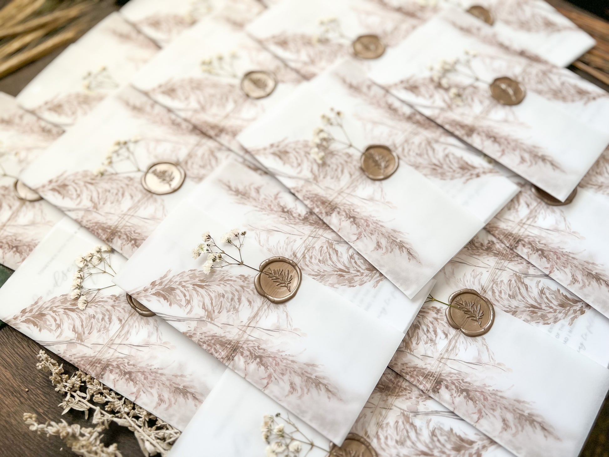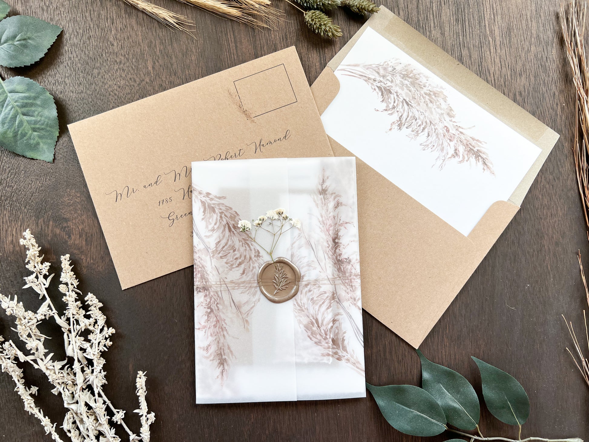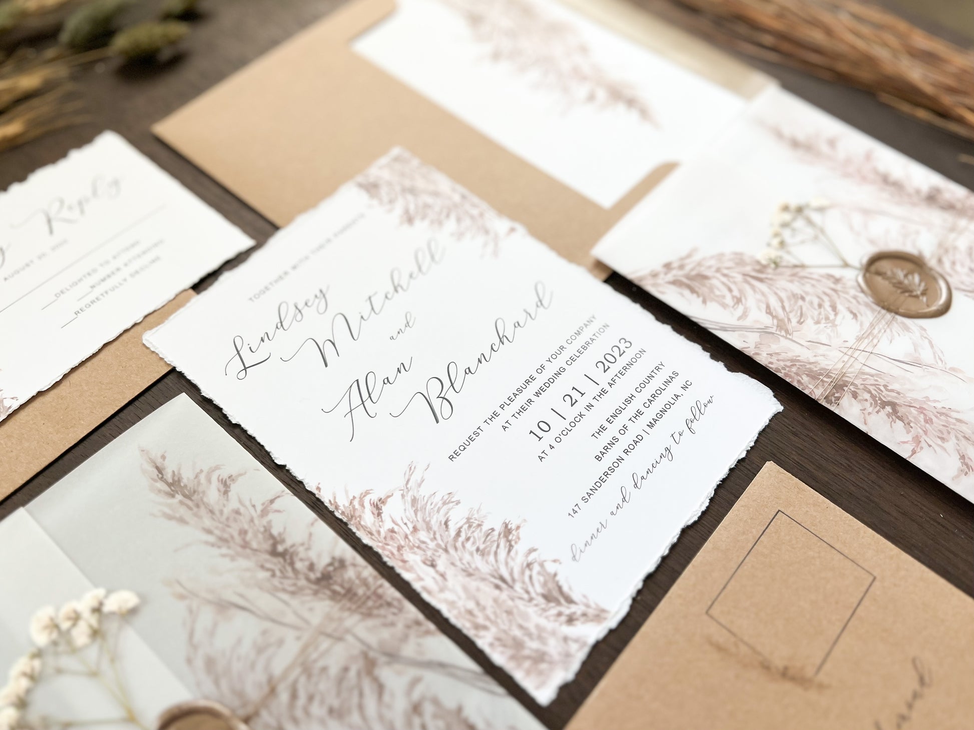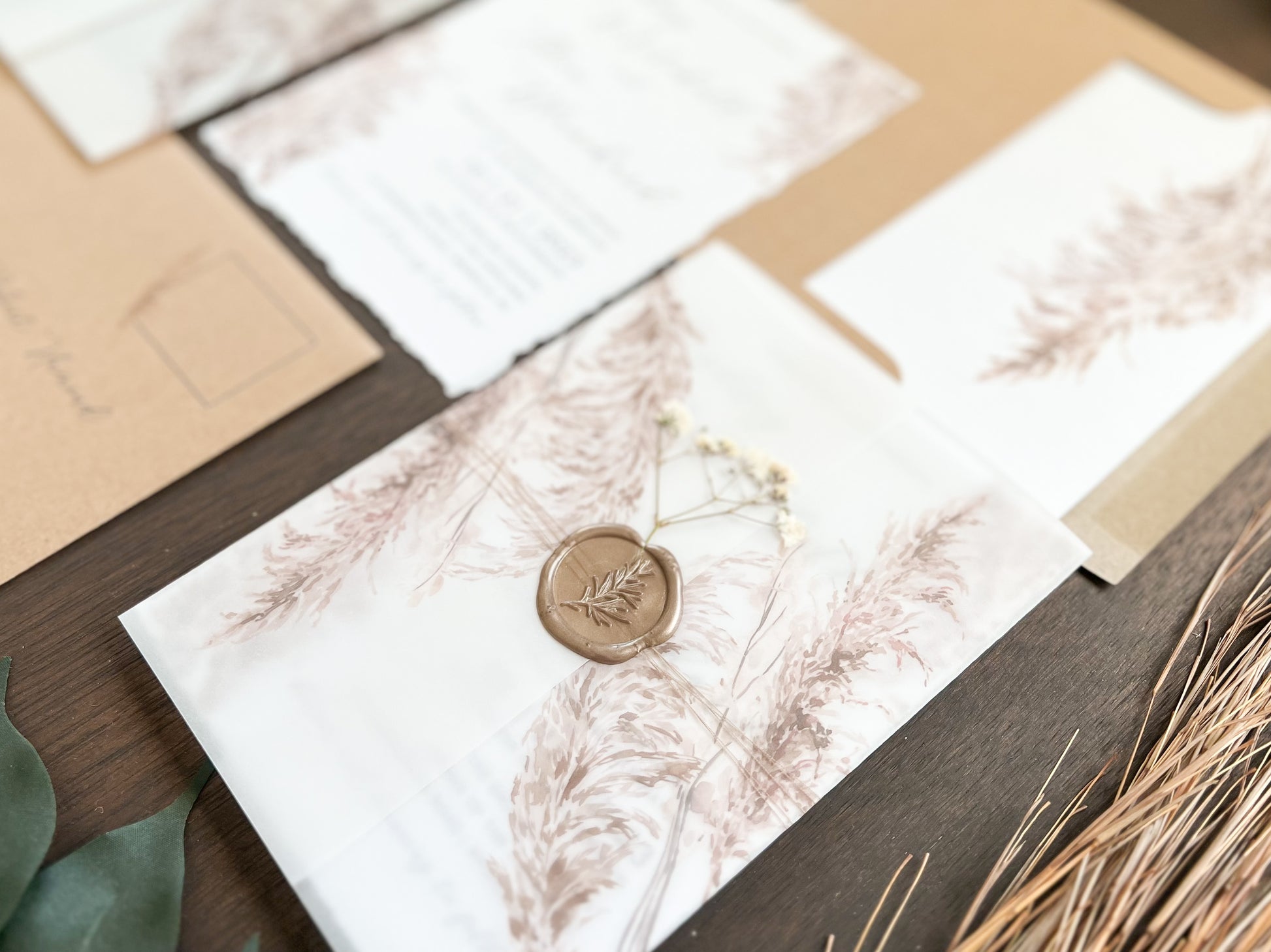 Pampas Grass and Baby’s Breath Wedding Invitation with Deckled Edge, Vellum with Wax Seal