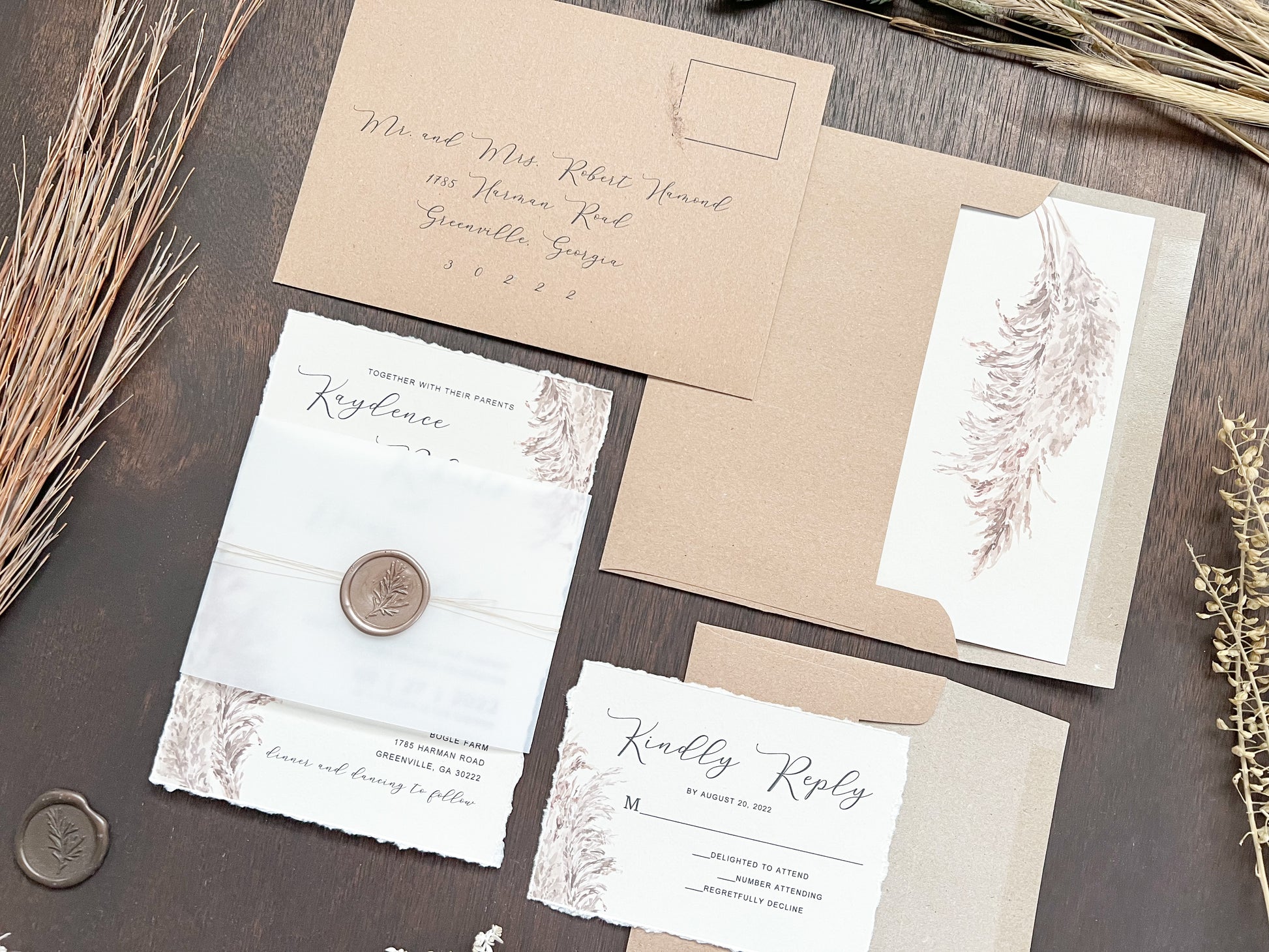 Pampas Grass Wedding Invitation with Deckled Edging, Vellum, & Wax Seal