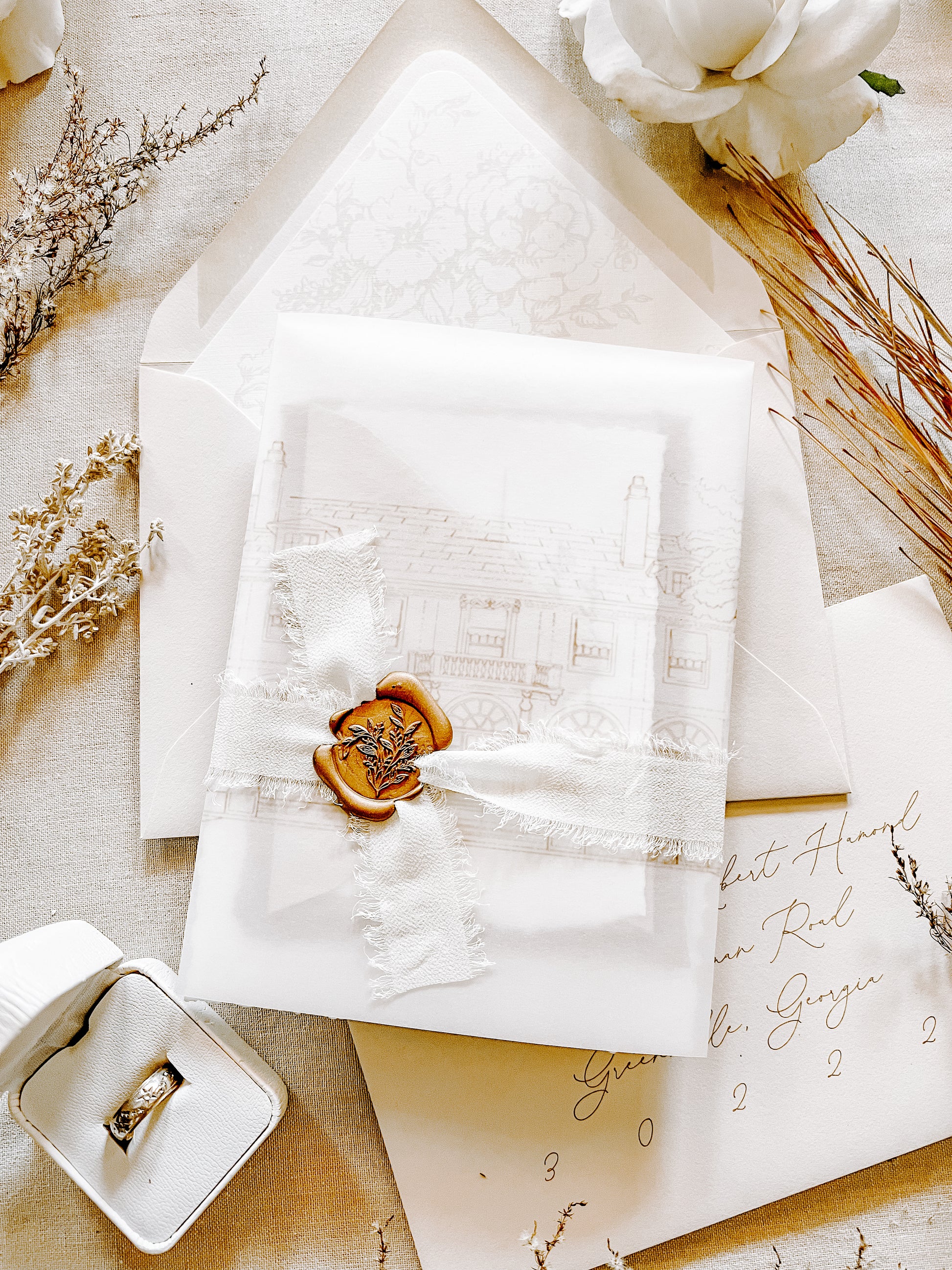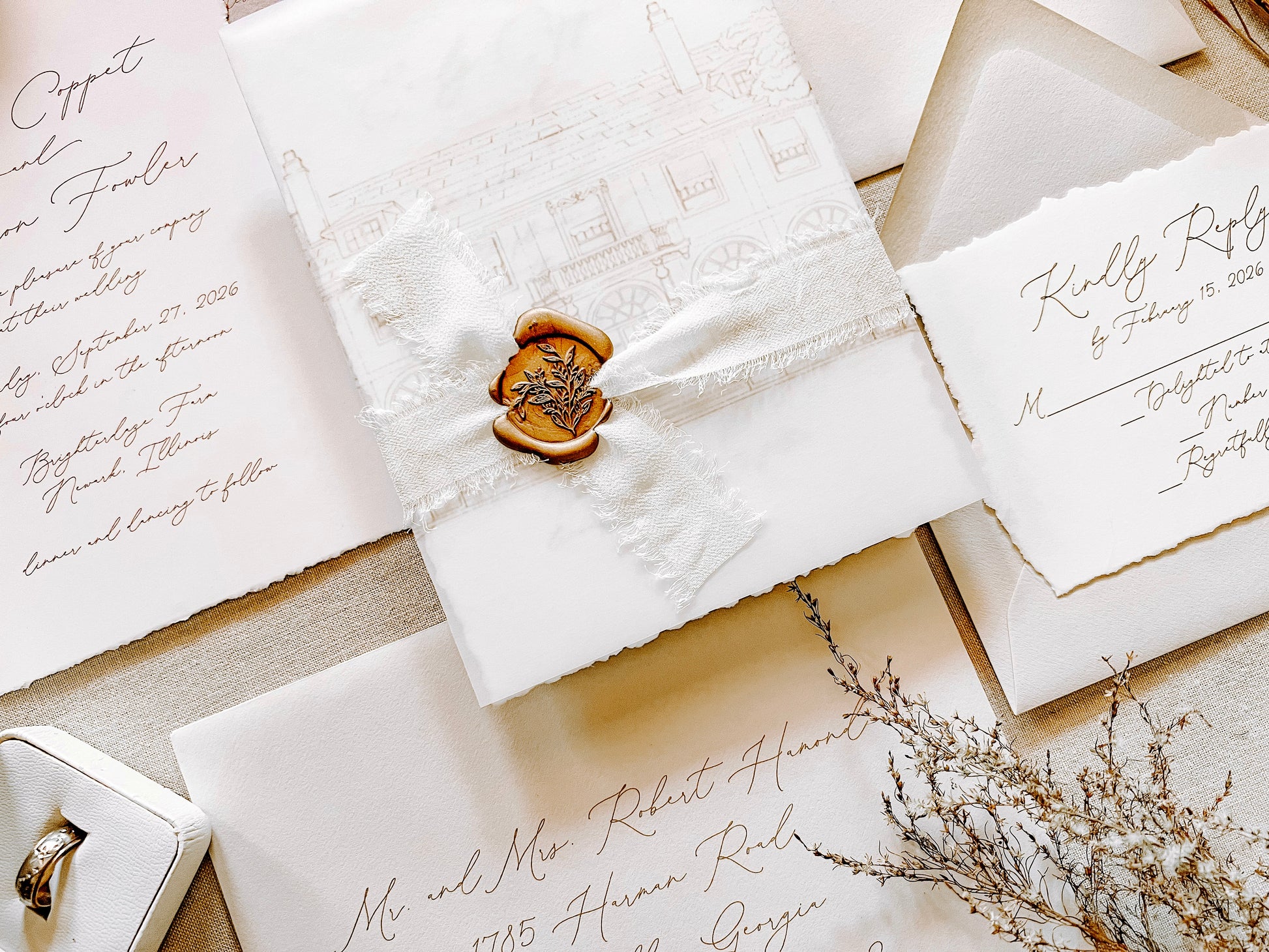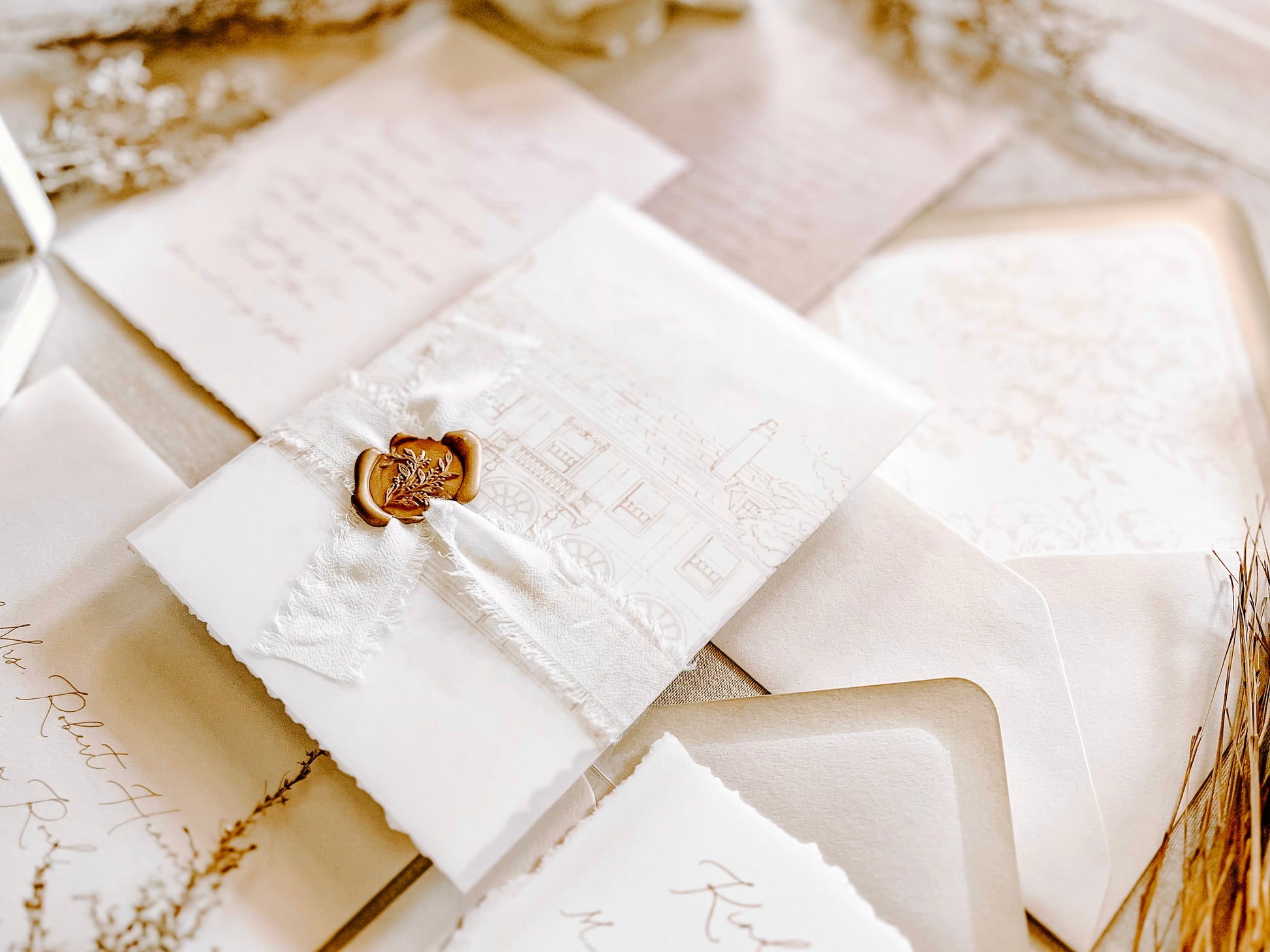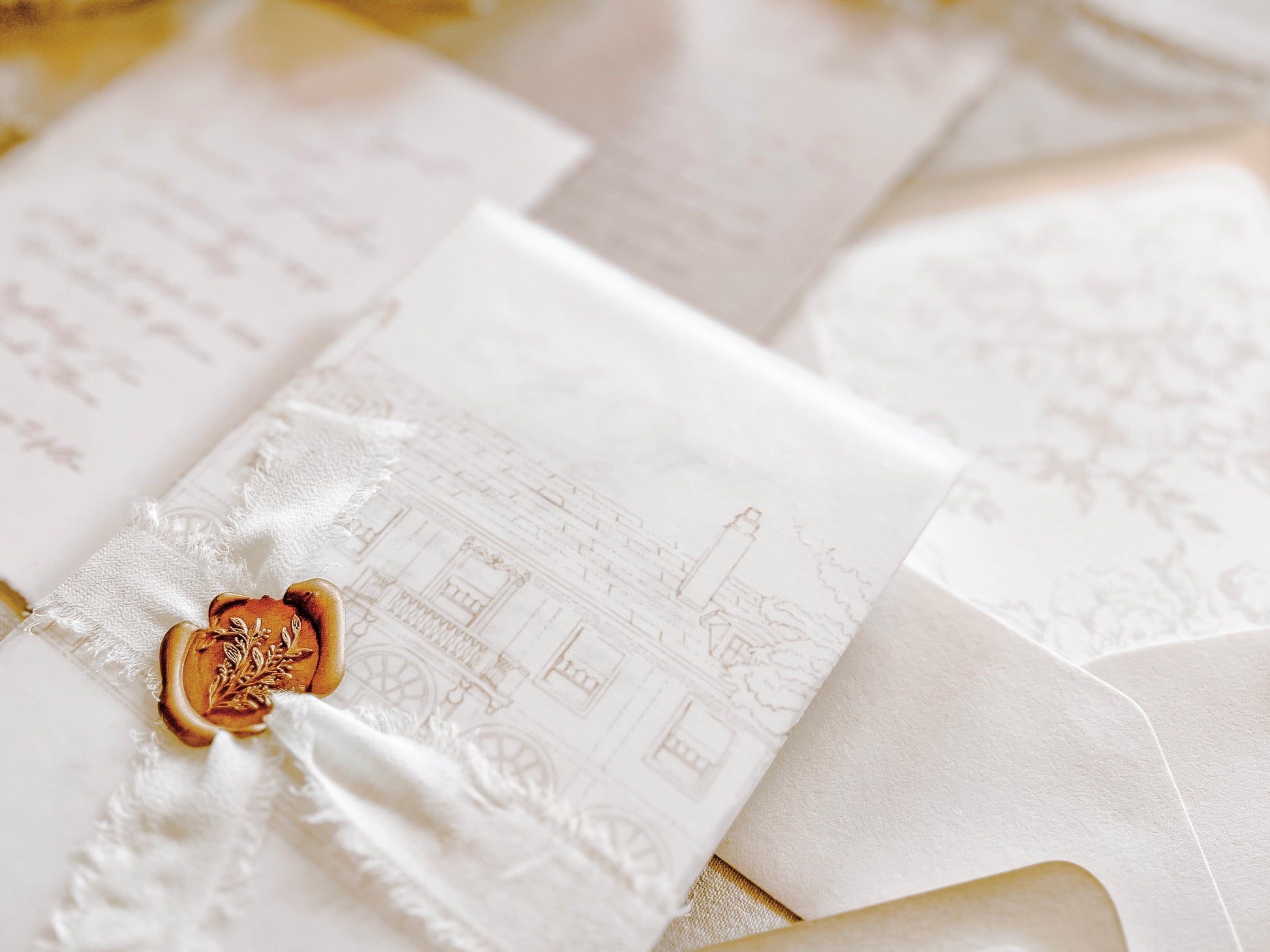 Printed using artisan letterpress techniques, each invitation showcases the deep, tactile impression that makes letterpress so enduring. The suite is wrapped in translucent vellum featuring a venue sketch, tied with a flowing frayed chiffon ribbon and finished with a wax seal. Soft neutral tones complete the understated, elegant look.