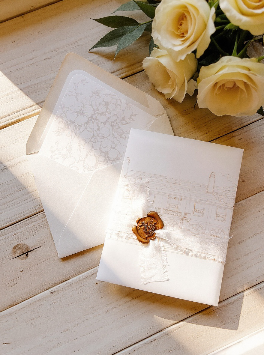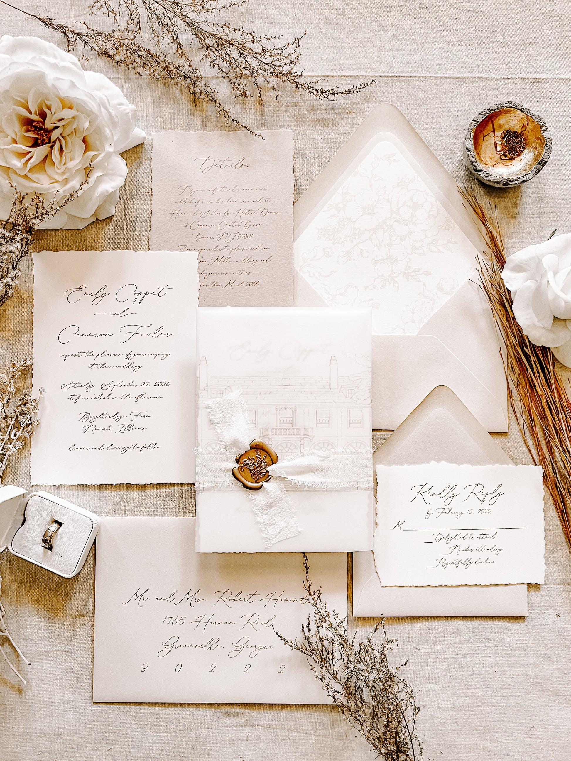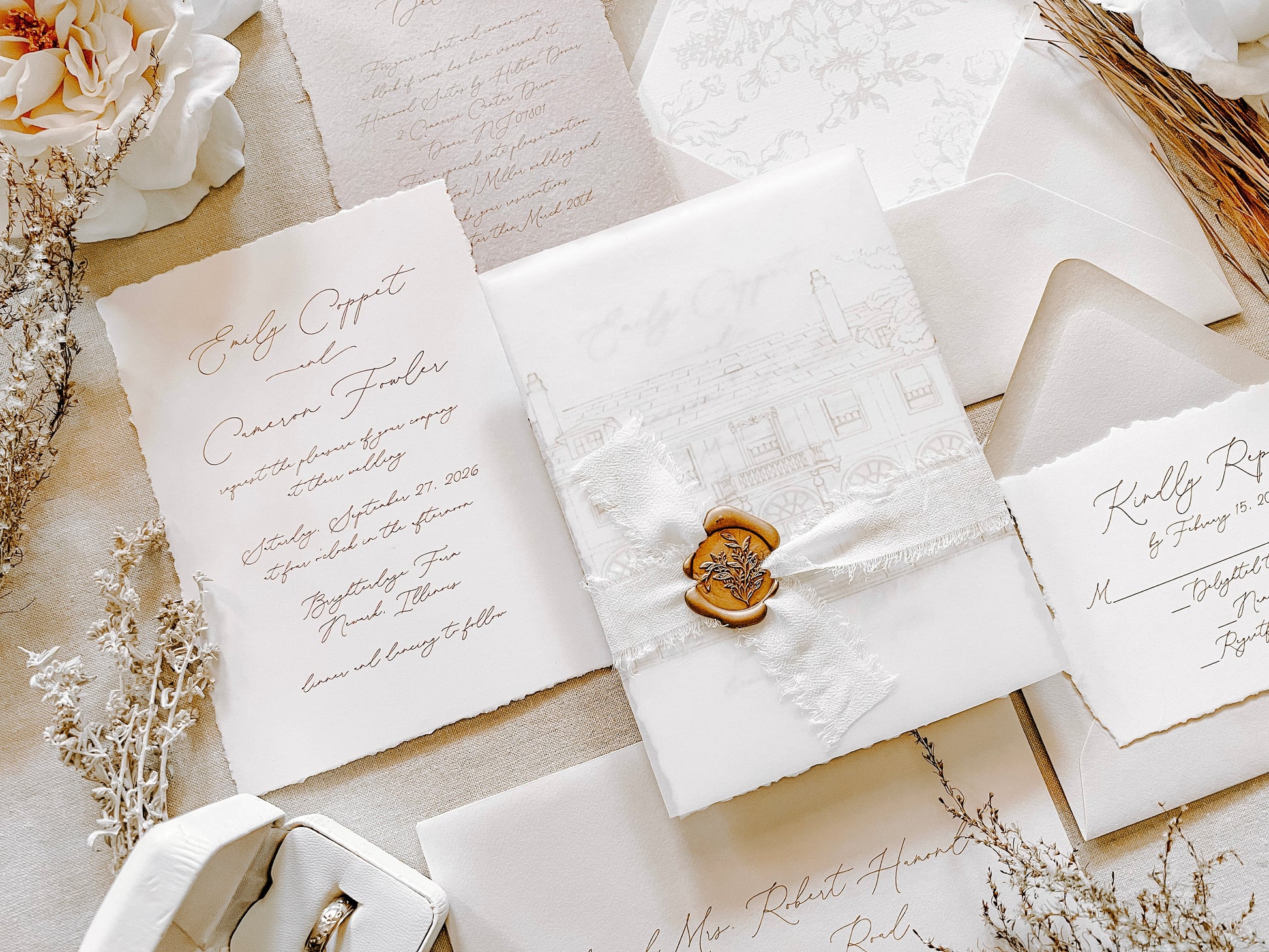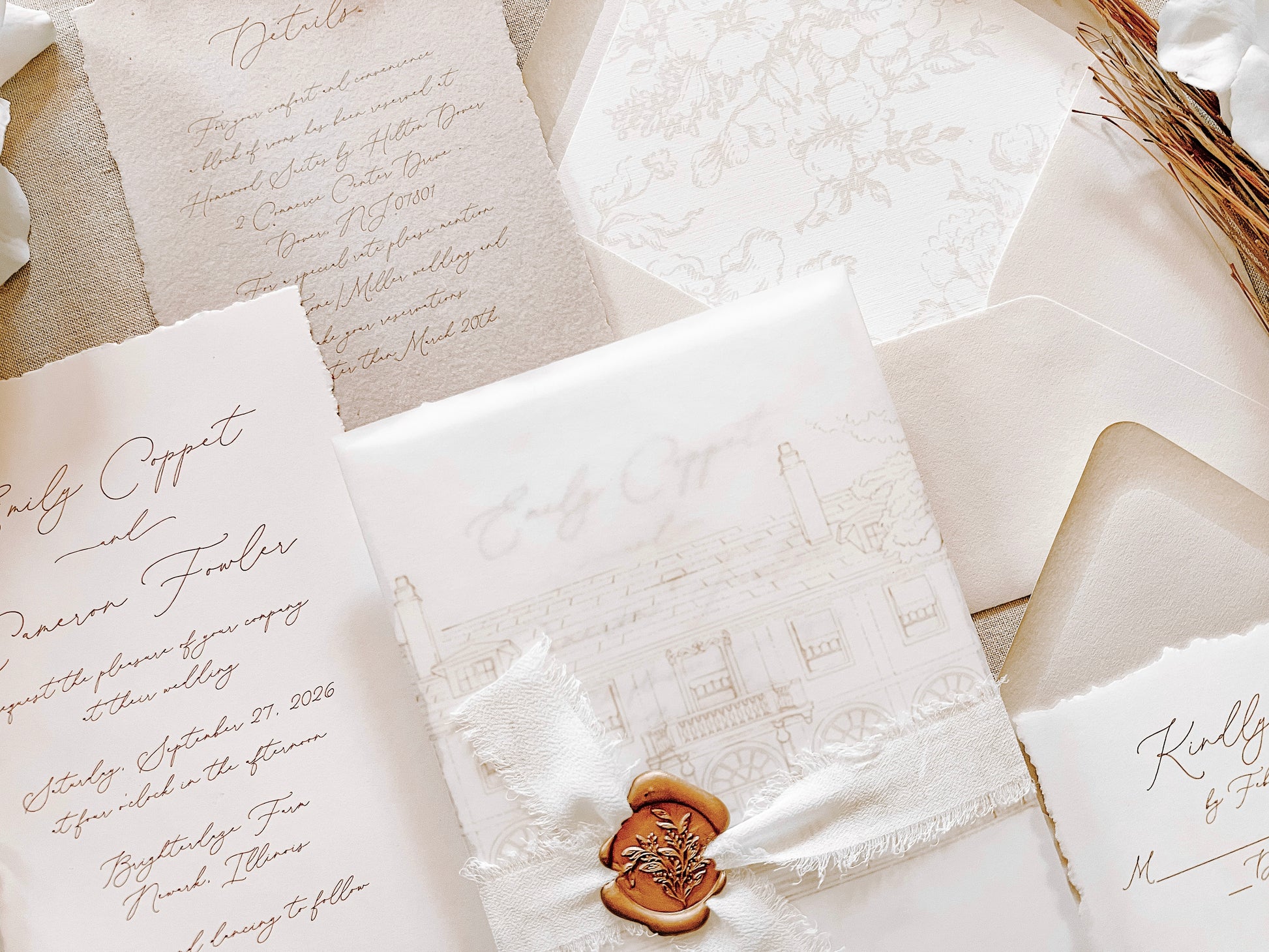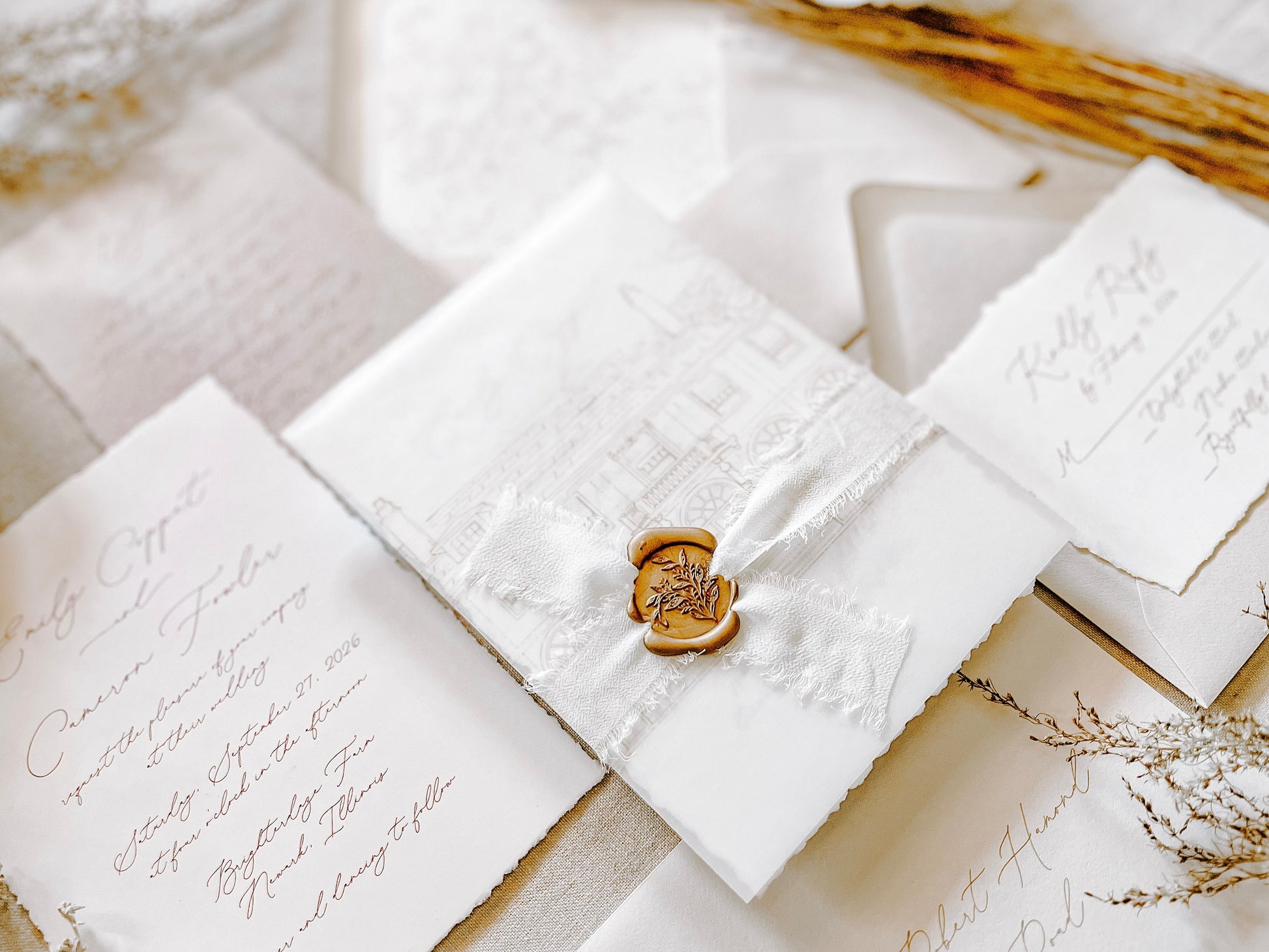 Printed using artisan letterpress techniques, each invitation showcases the deep, tactile impression that makes letterpress so enduring. The suite is wrapped in translucent vellum featuring a venue sketch, tied with a flowing frayed chiffon ribbon and finished with a wax seal. Soft neutral tones complete the understated, elegant look.
