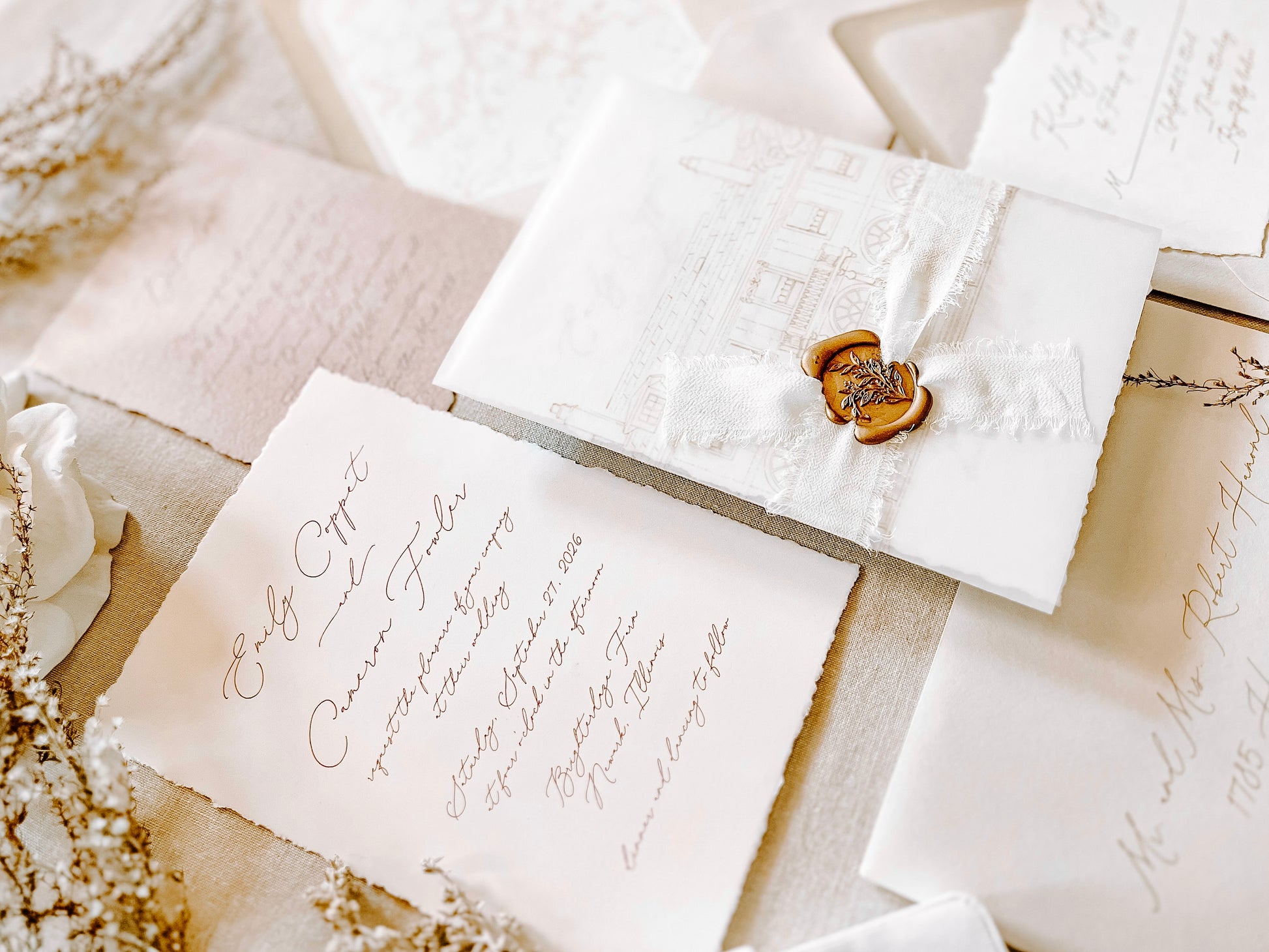 This design was created with the intention of capturing the soft, timeless feel of vintage correspondence - from the flowing all-calligraphy lettering to the handmade cotton paper, delicate deckled edging, and traditional wax seal. Every detail was chosen to evoke a sense of history, romance and old-world charm.