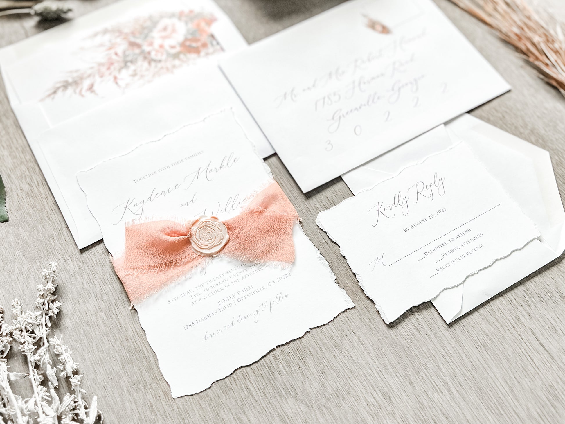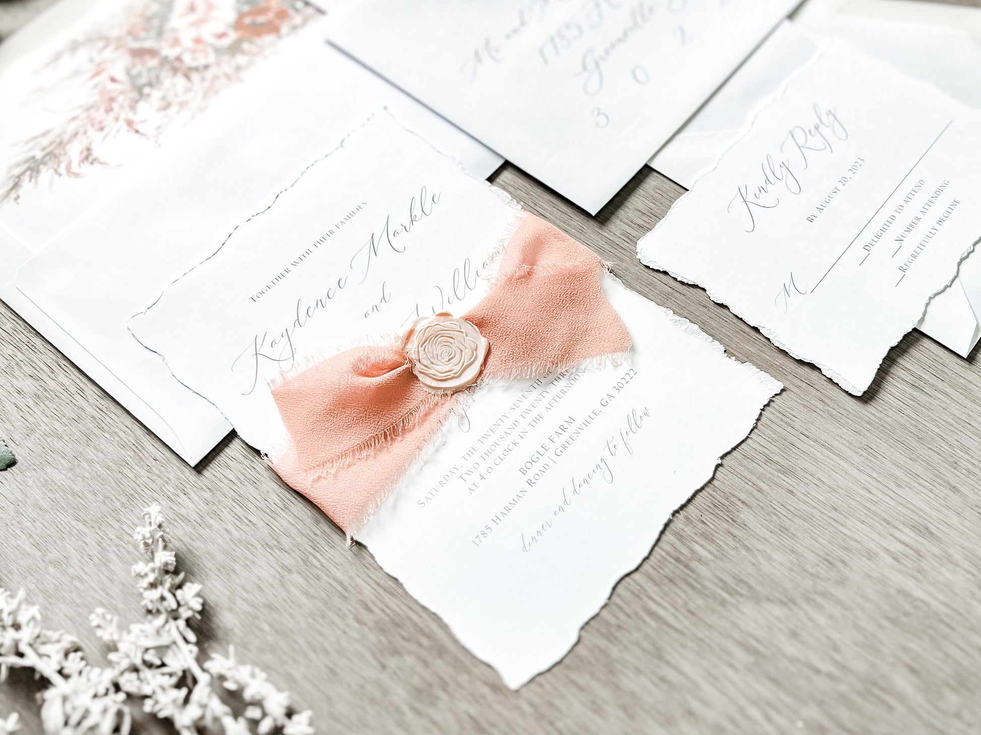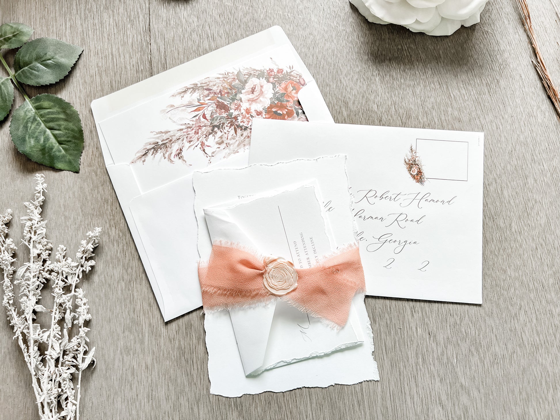 This elegant traditional style wedding invitation is printed on 100lb ivory cover stock with deckled (hand torn) edging. Invitation is wrapped in rose gold chiffon ribbon with a blush pink botanical wax seal. The rose gold ribbon gives a dusty rose or pink feel. Other wax and ribbon colors available. Please inquire for your color of choice.