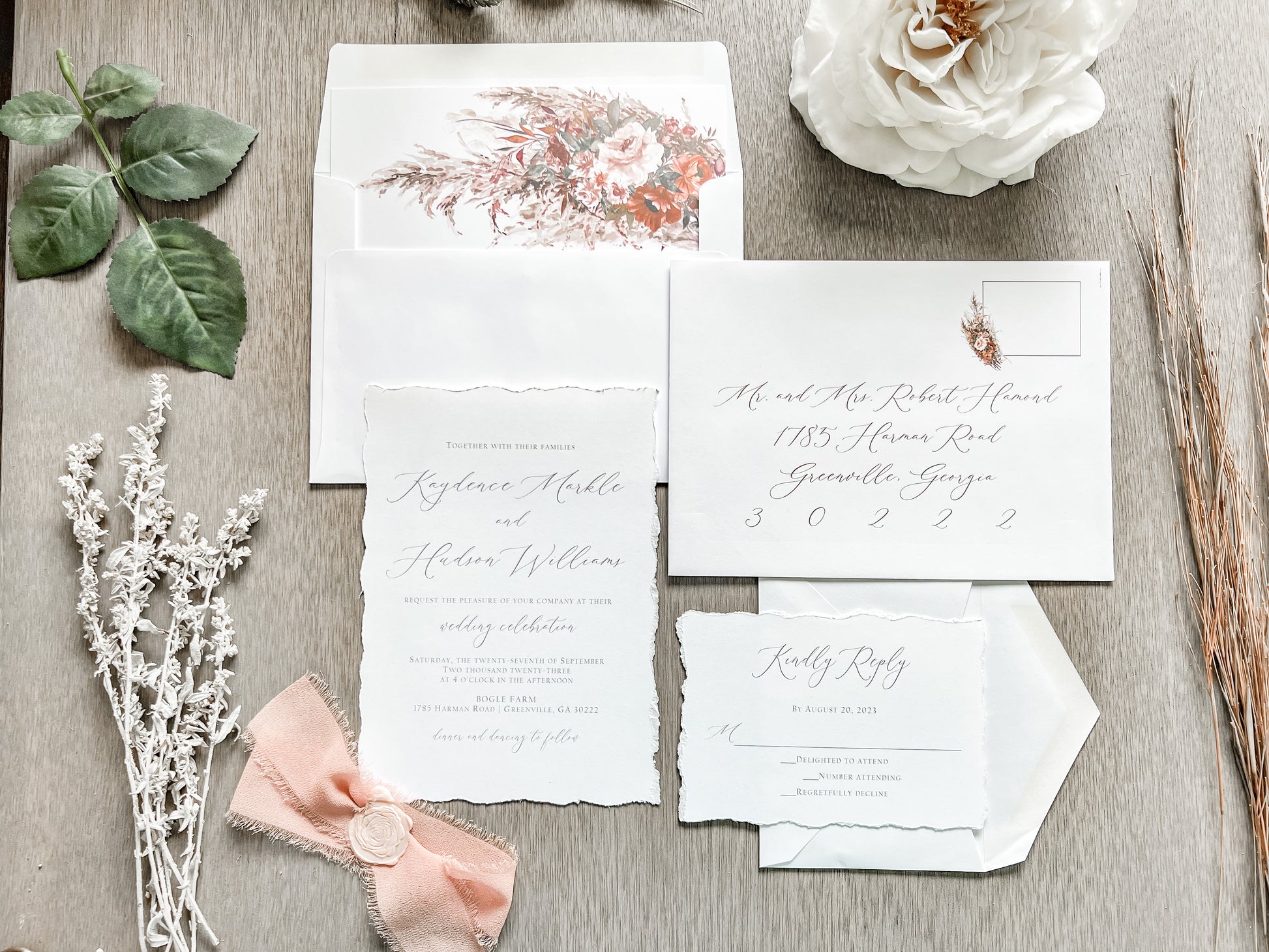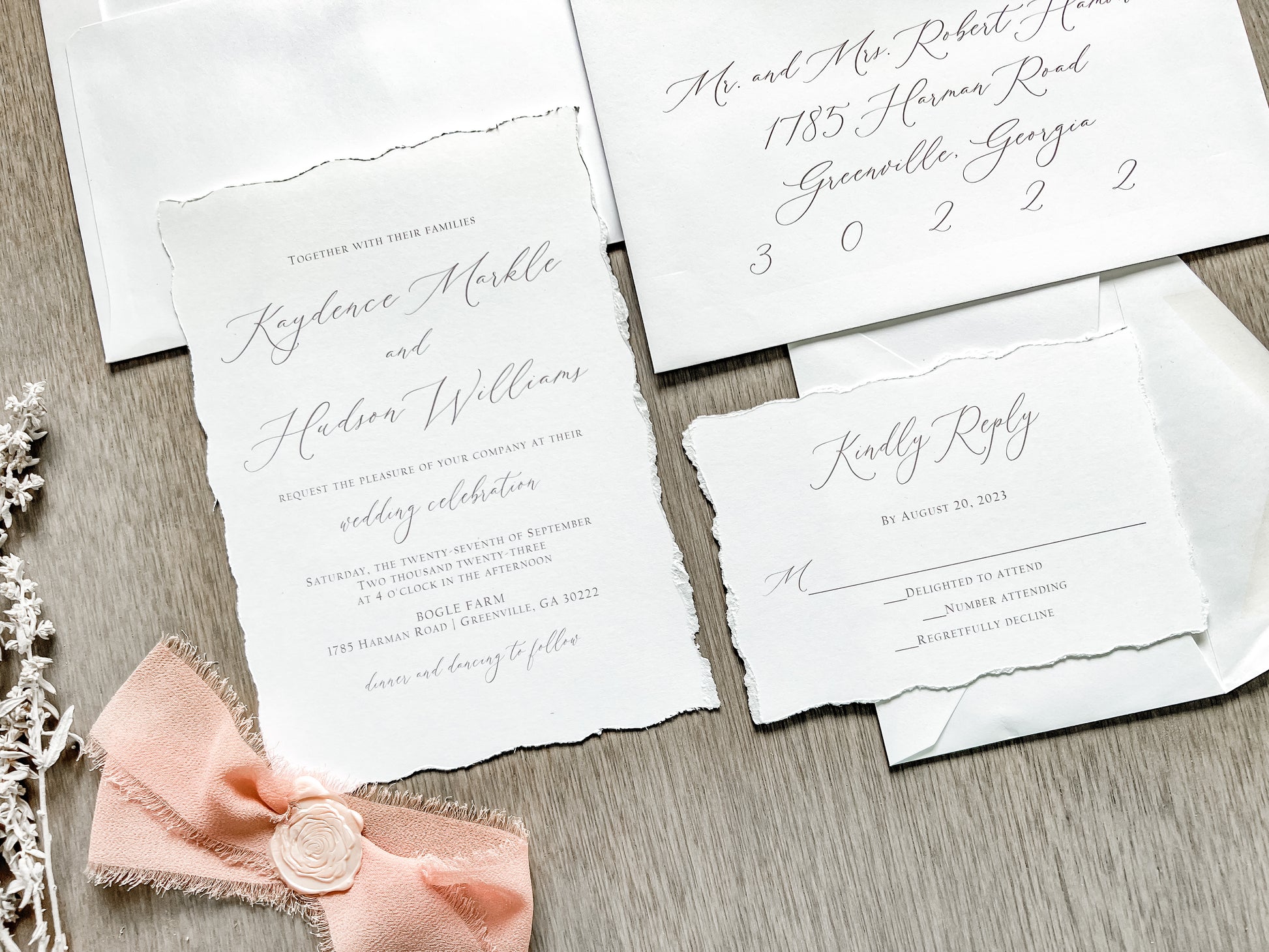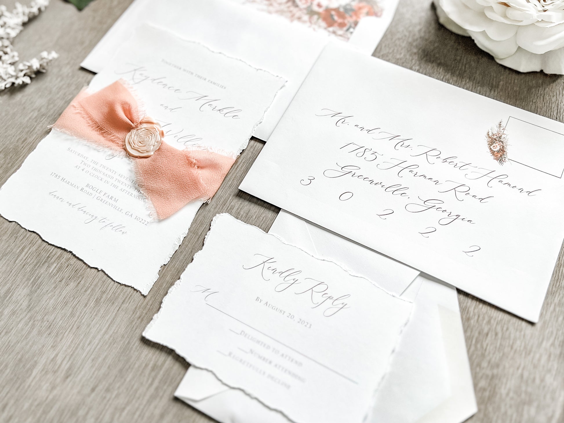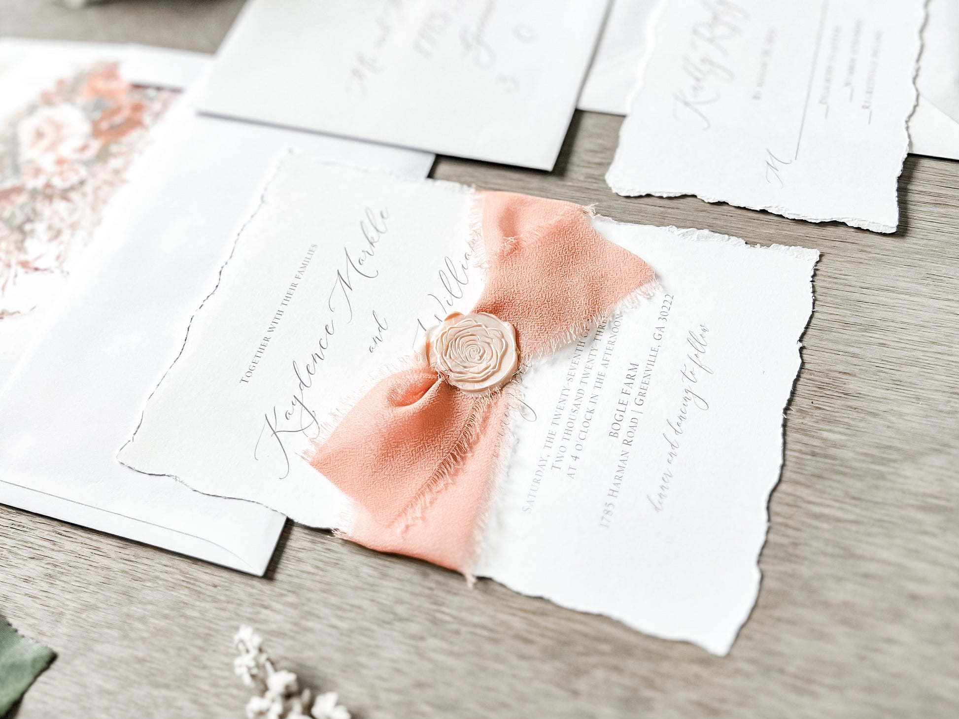 This elegant traditional style wedding invitation is printed on 100lb ivory cover stock with deckled (hand torn) edging. Invitation is wrapped in rose gold chiffon ribbon with a blush pink botanical wax seal. The rose gold ribbon gives a dusty rose or pink feel. Other wax and ribbon colors available. Please inquire for your color of choice.