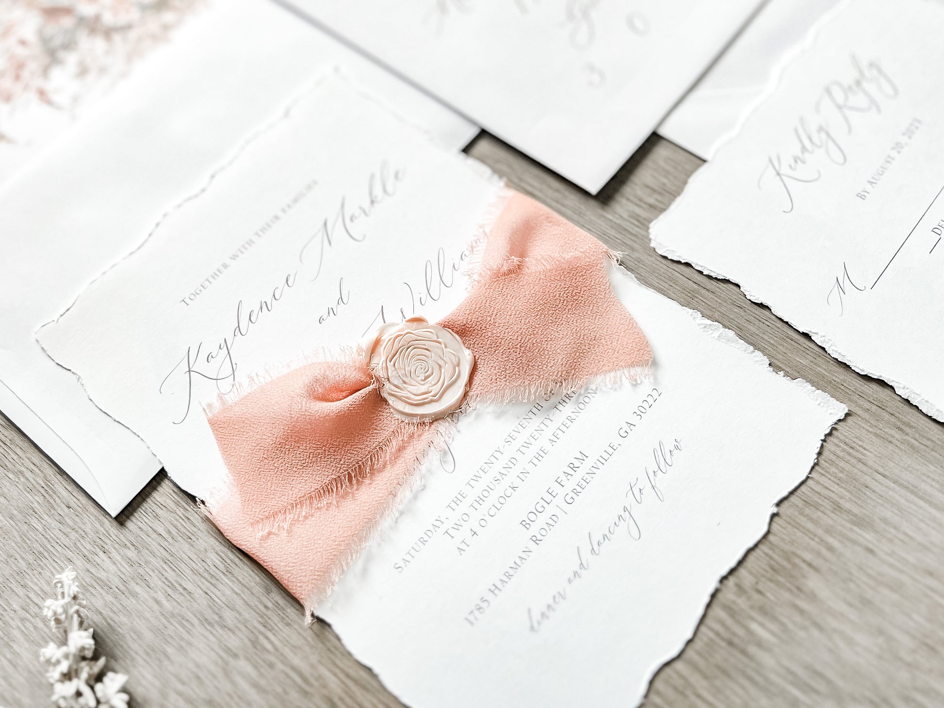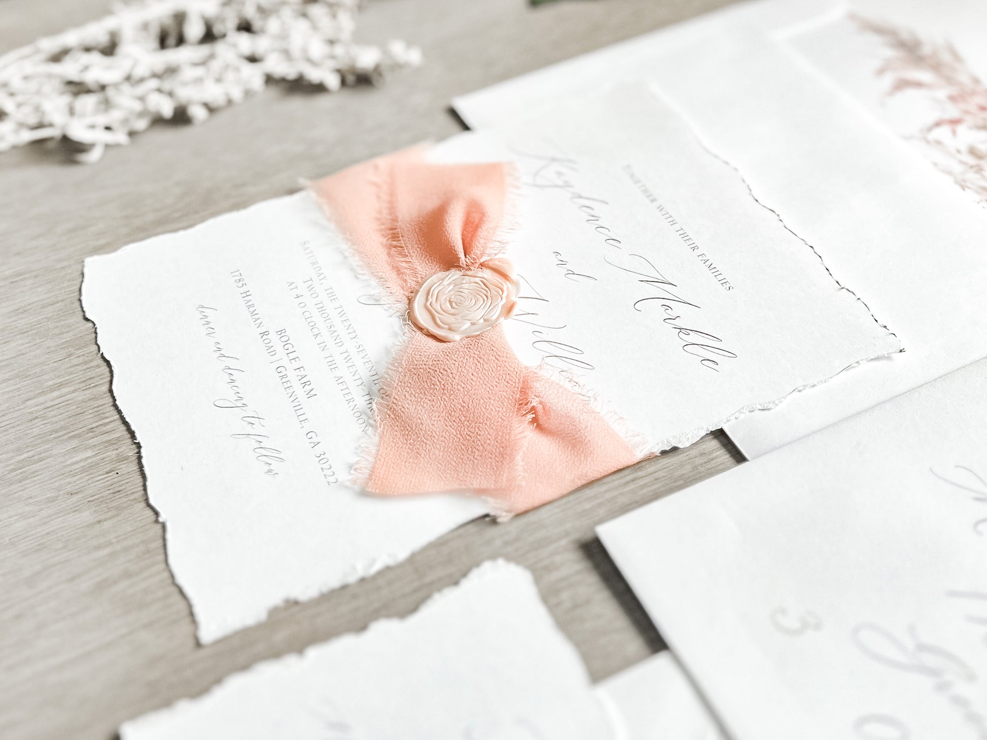 Rose Gold Ribbon Wedding Invitation with Deckled Edging and Blush Pink Wax Seal