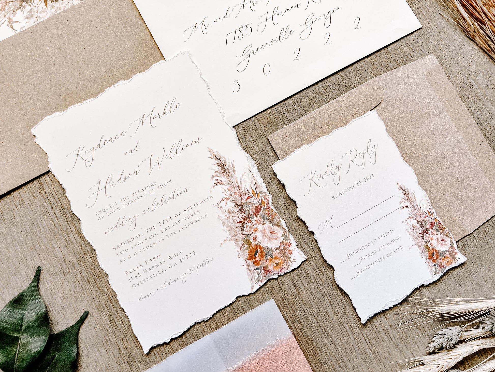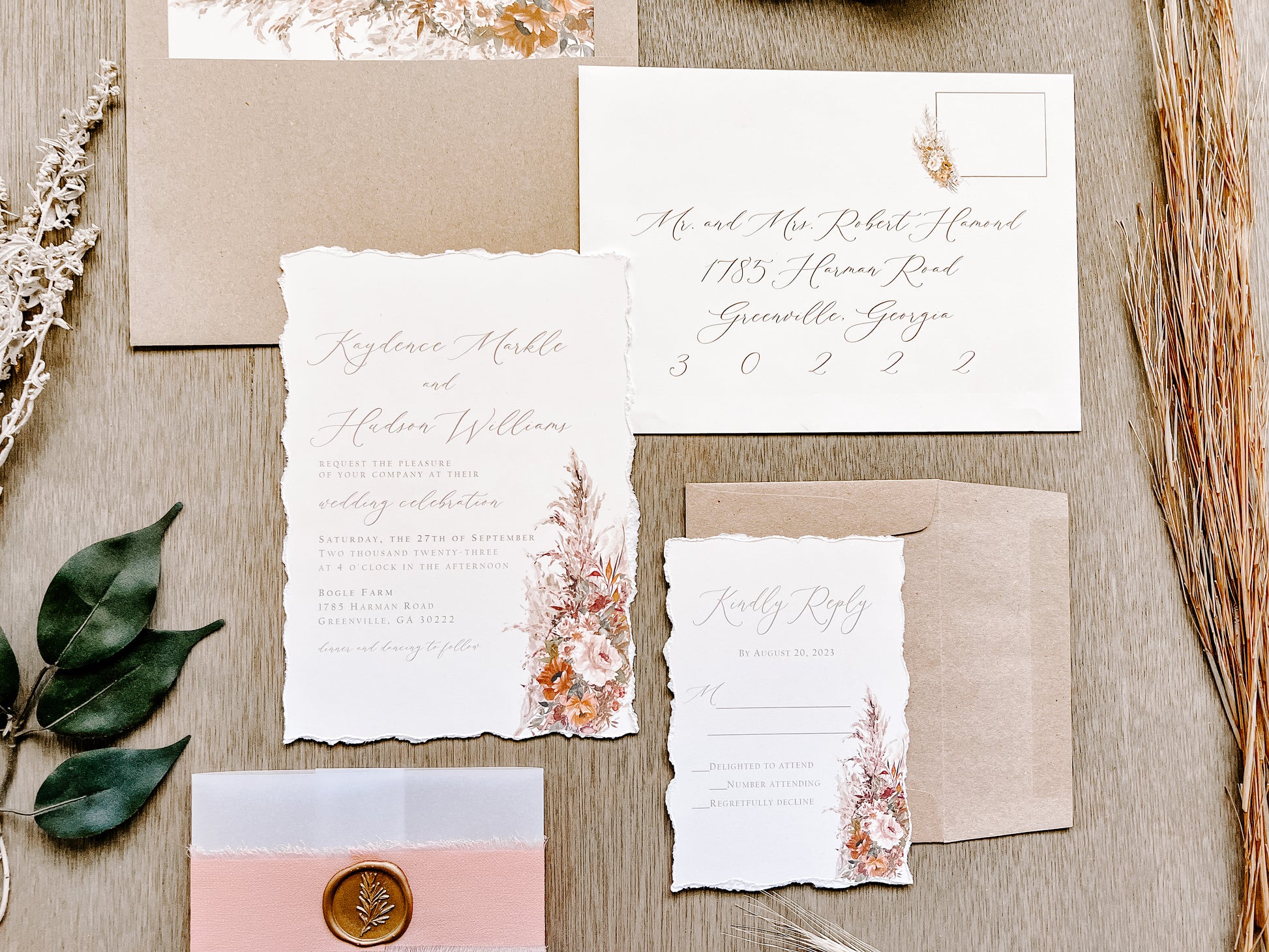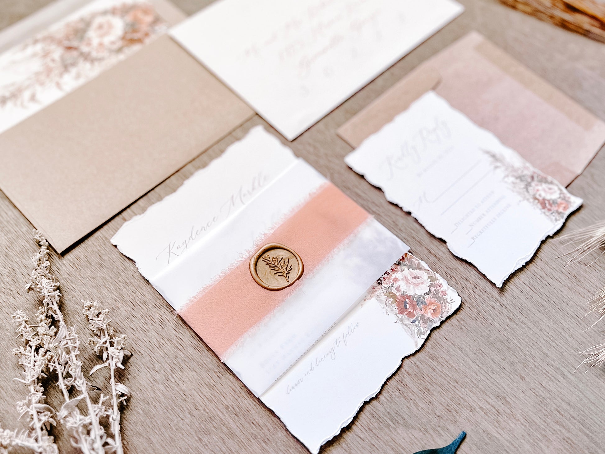 Rose Gold Wedding Invitation with Pampas Grass, Terracotta Beige Florals, Deckled Edging, Vellum Belly Band, Chiffon Ribbon and Wax Seal
