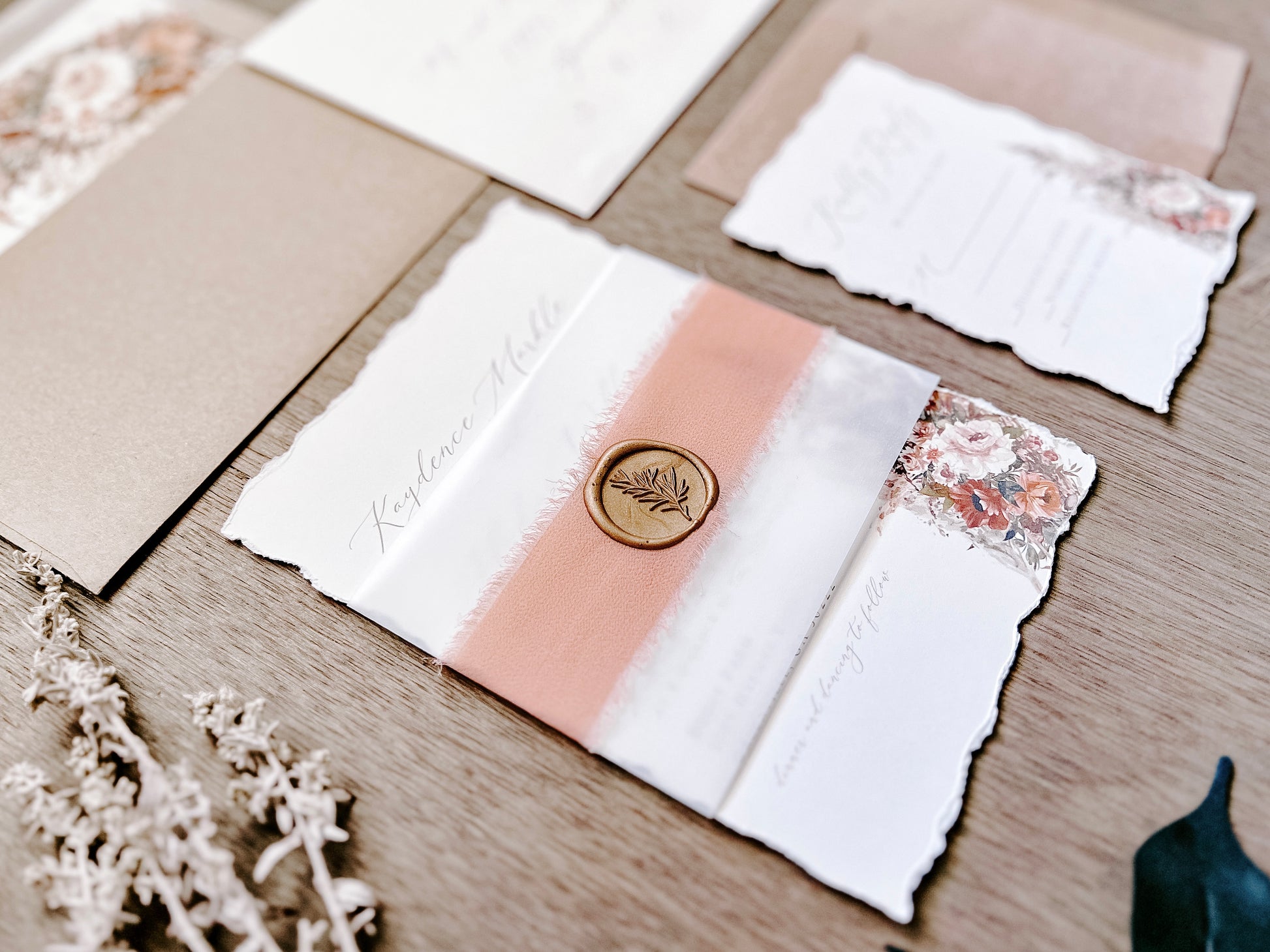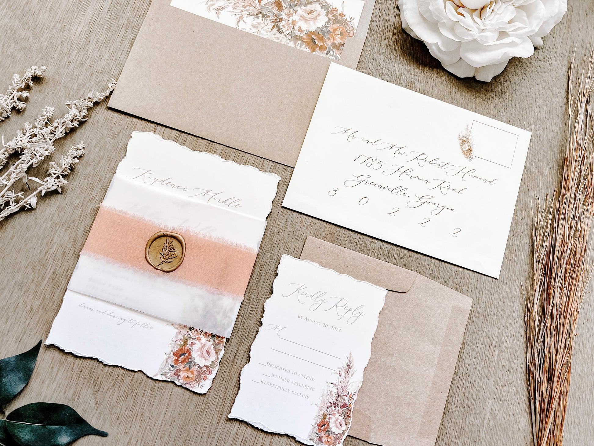 This modern boho style wedding invitation is printed on 100 lb ivory cover stock with deckled (hand torn) edging. Invitation is wrapped in a wide vellum belly band with rose gold chiffon ribbon and an antique gold wax seal. Other wax and ribbon colors available. Please inquire for your color of choice. Shown with upgraded kraft and beige colored envelopes.