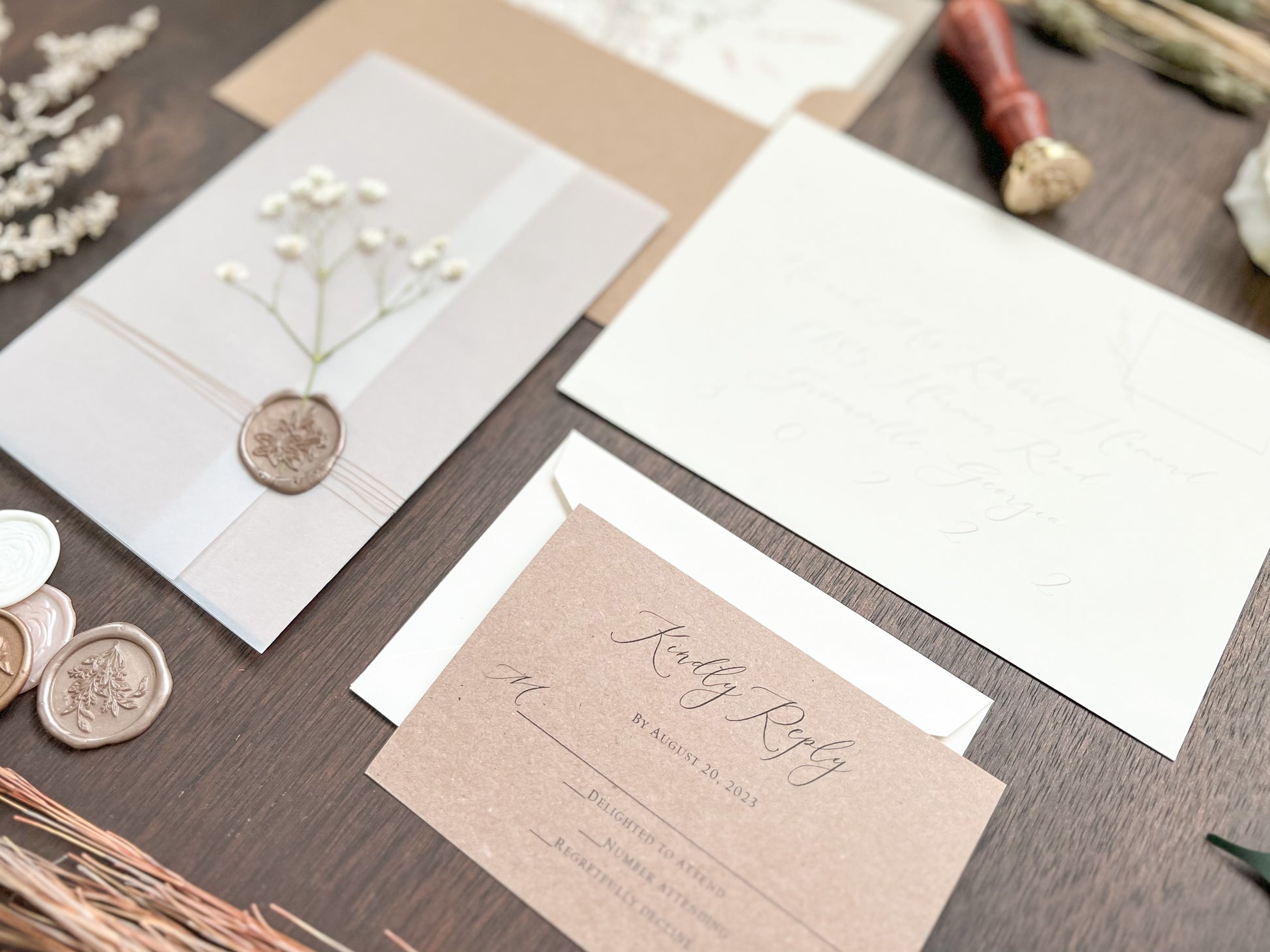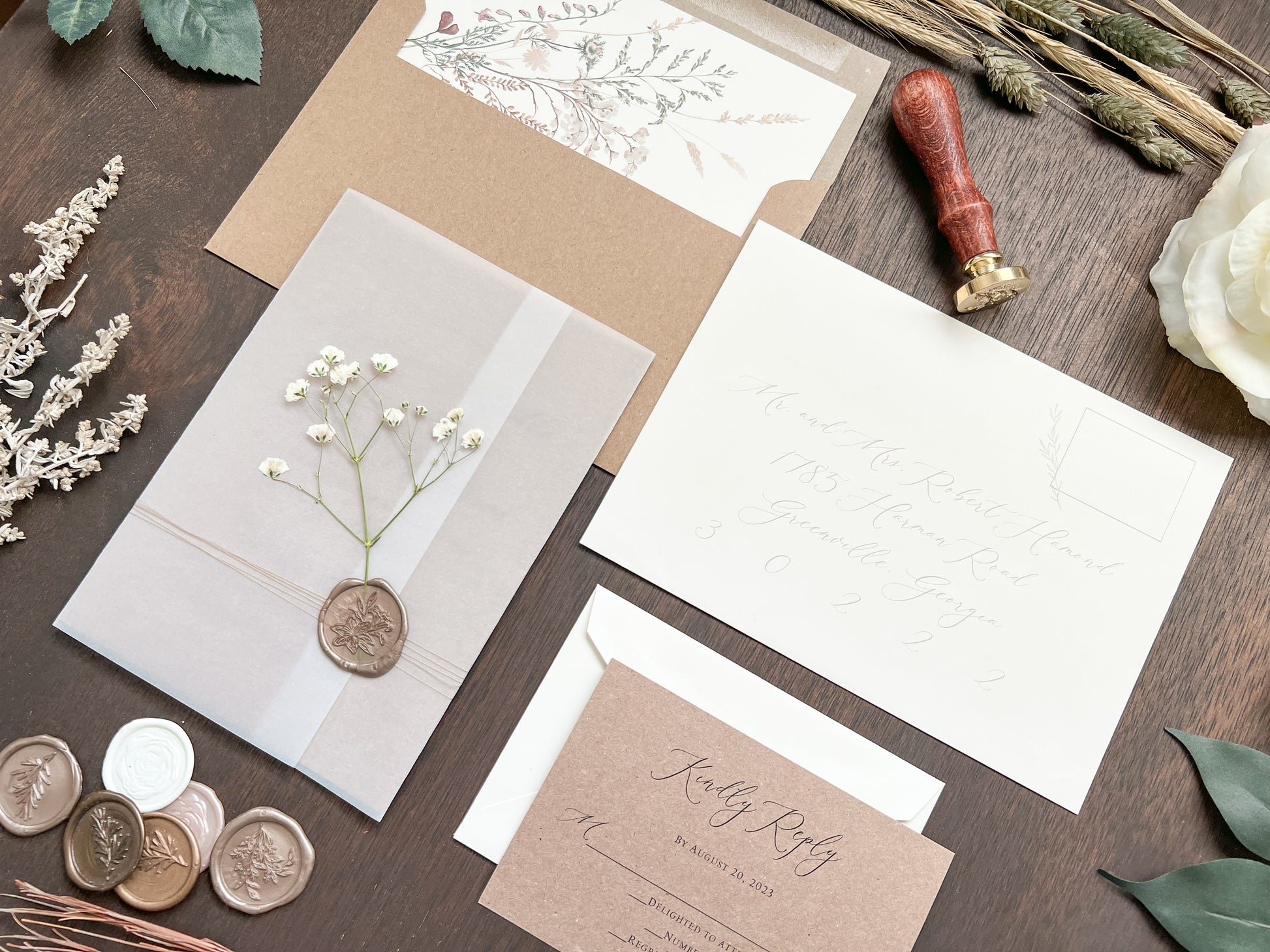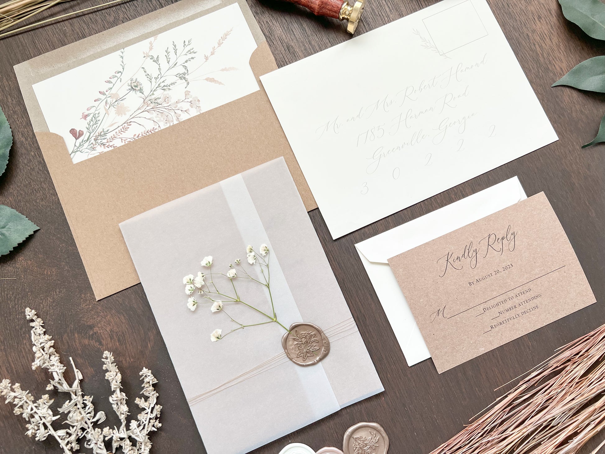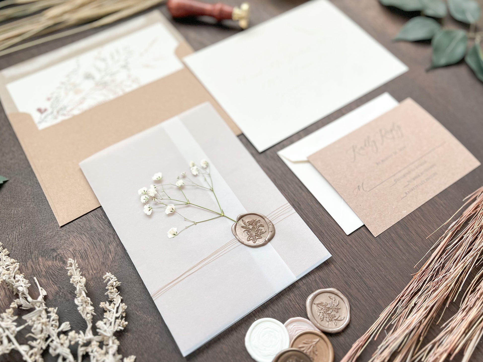 This beautiful rustic wedding invitation is printed on sturdy 100 lb kraft stock and wrapped in a full vellum wrap, delicately tied with khaki thread. It is finished with a botanical almond-colored wax seal and adorned with dried pressed gypsophila (baby’s breath) for a charming, natural touch. Other wax colors available. Please inquire for your color of choice. Shown with upgraded kraft envelopes.