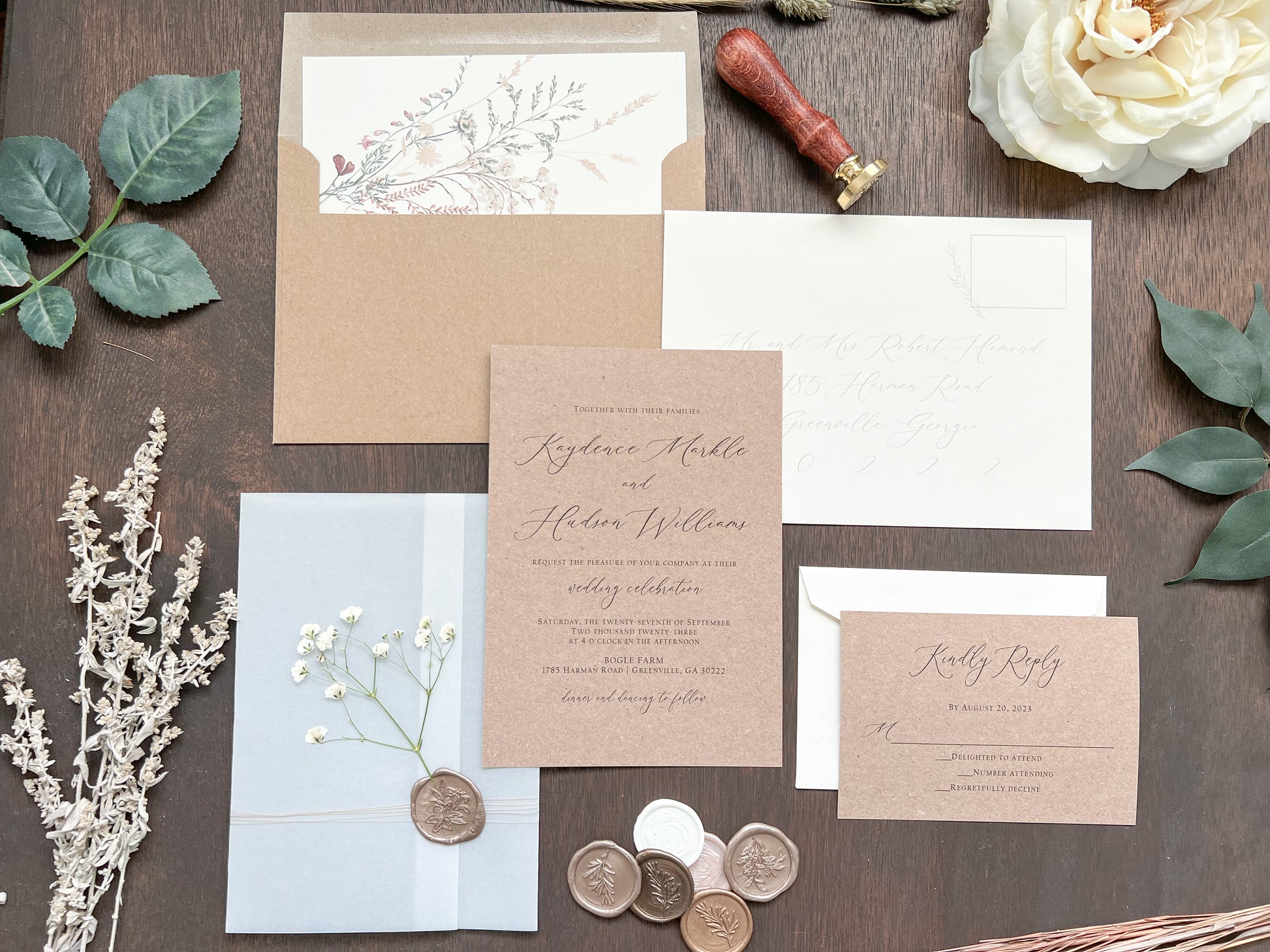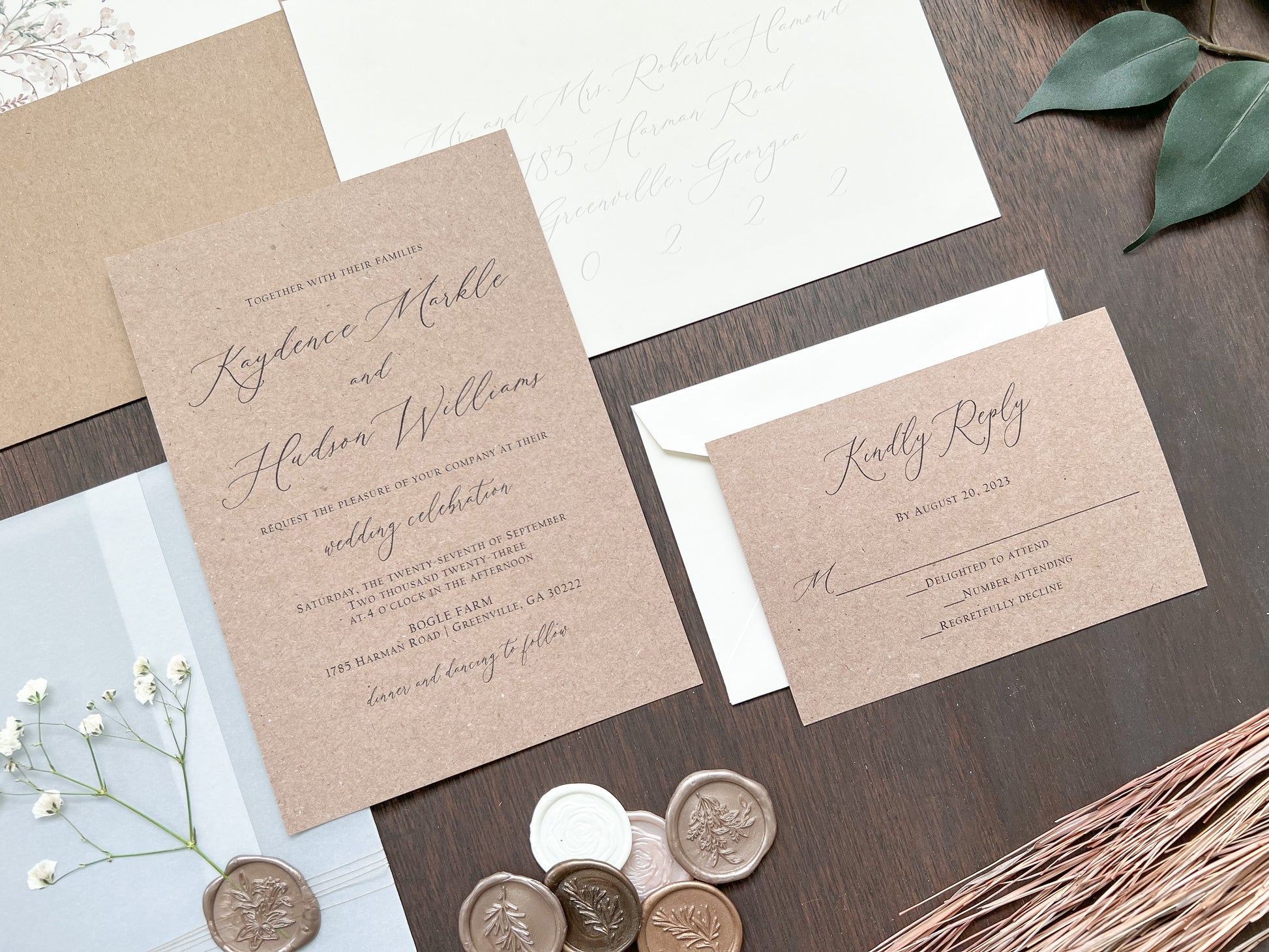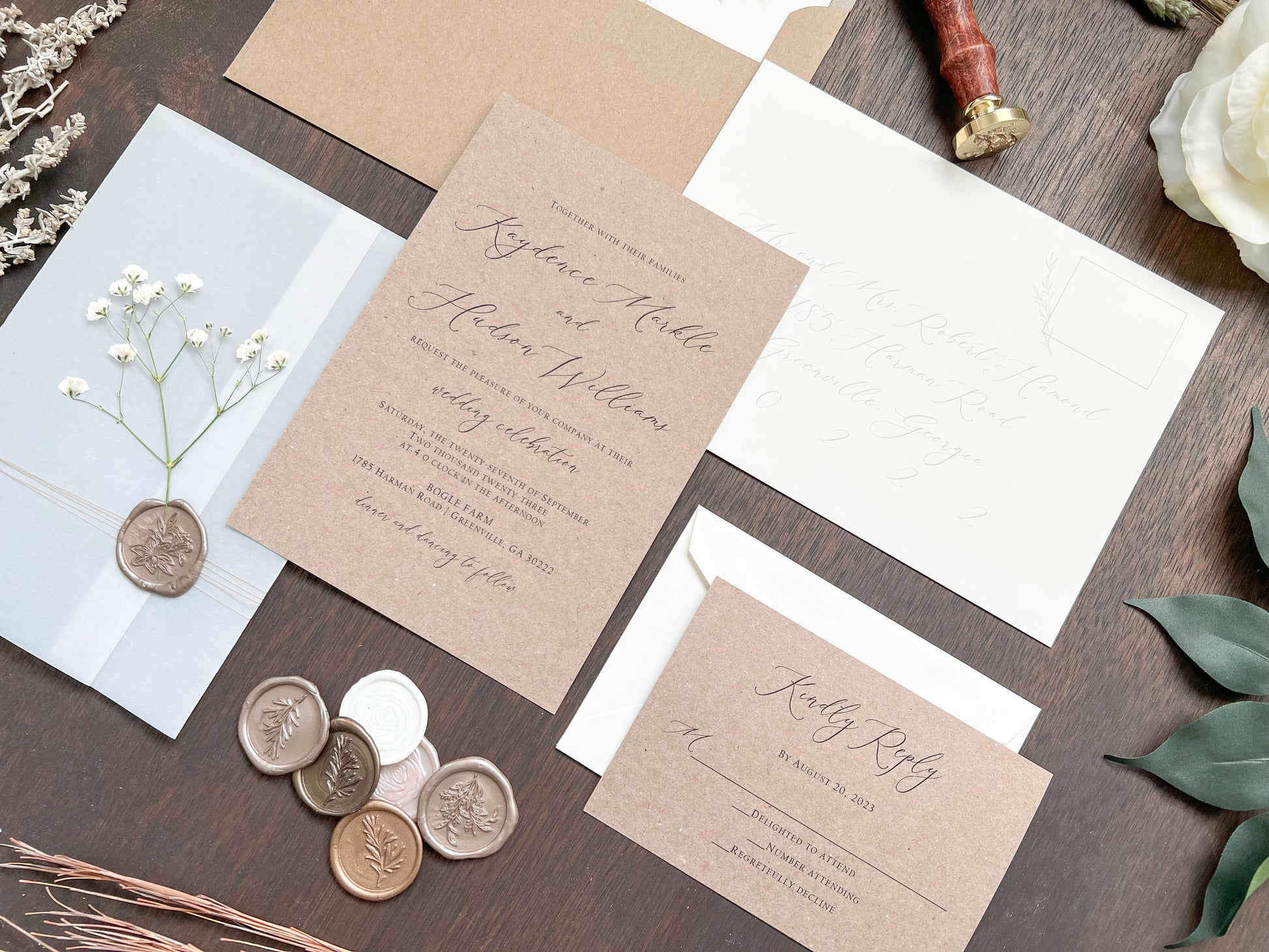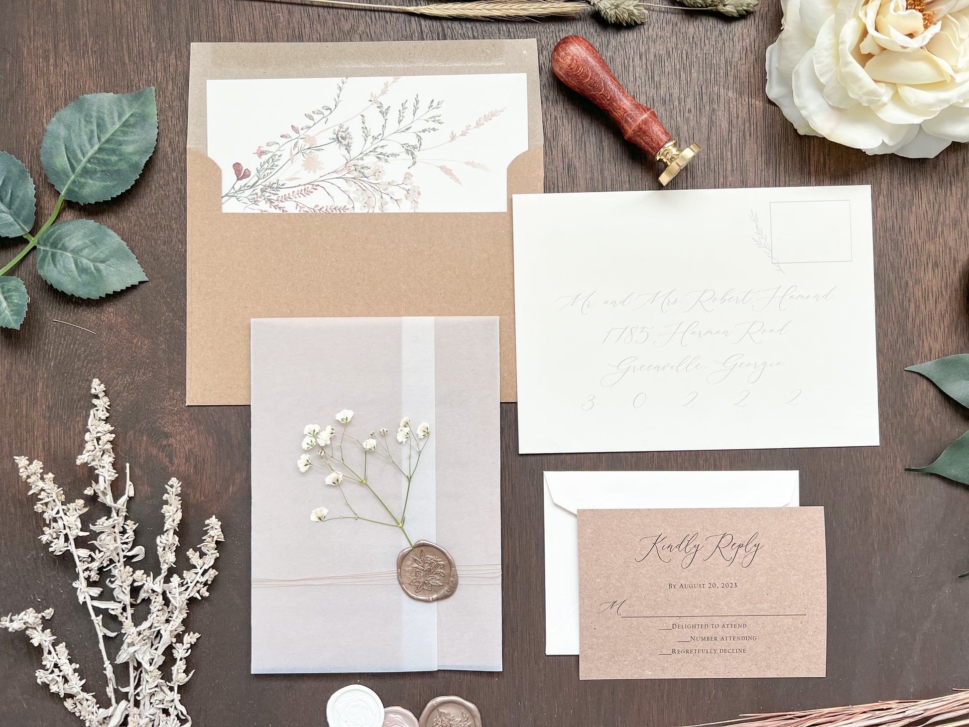 This beautiful rustic wedding invitation is printed on sturdy 100 lb kraft stock and wrapped in a full vellum wrap, delicately tied with khaki thread. It is finished with a botanical almond-colored wax seal and adorned with dried pressed gypsophila (baby’s breath) for a charming, natural touch. Other wax colors available. Please inquire for your color of choice. Shown with upgraded kraft envelopes.