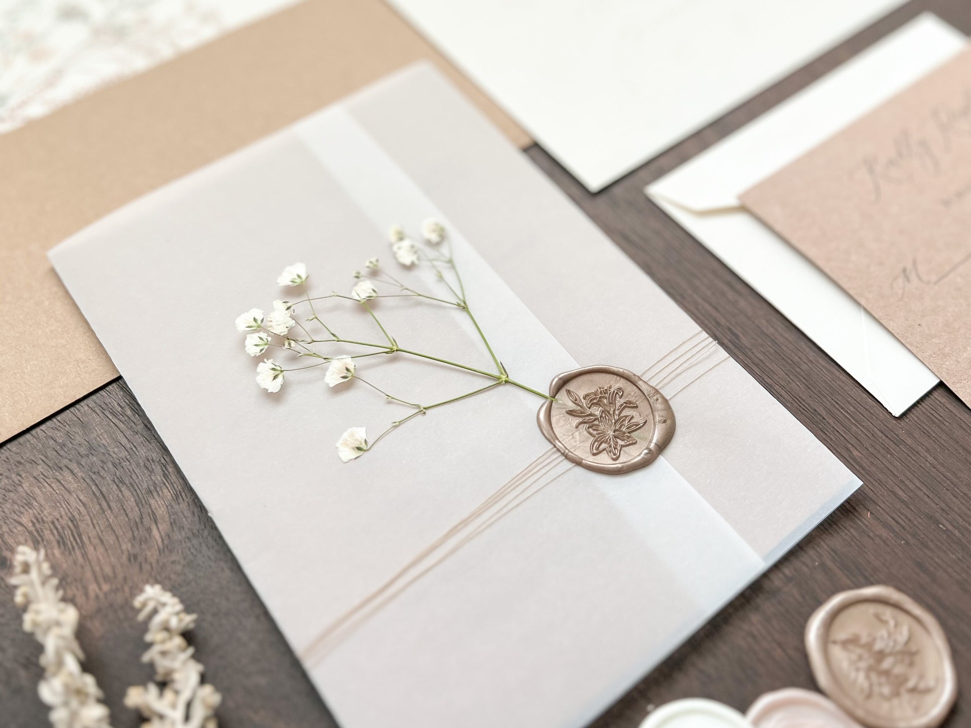 - 5 x 7 invitation wrapped in vellum and thread with wax seal and baby’s breath