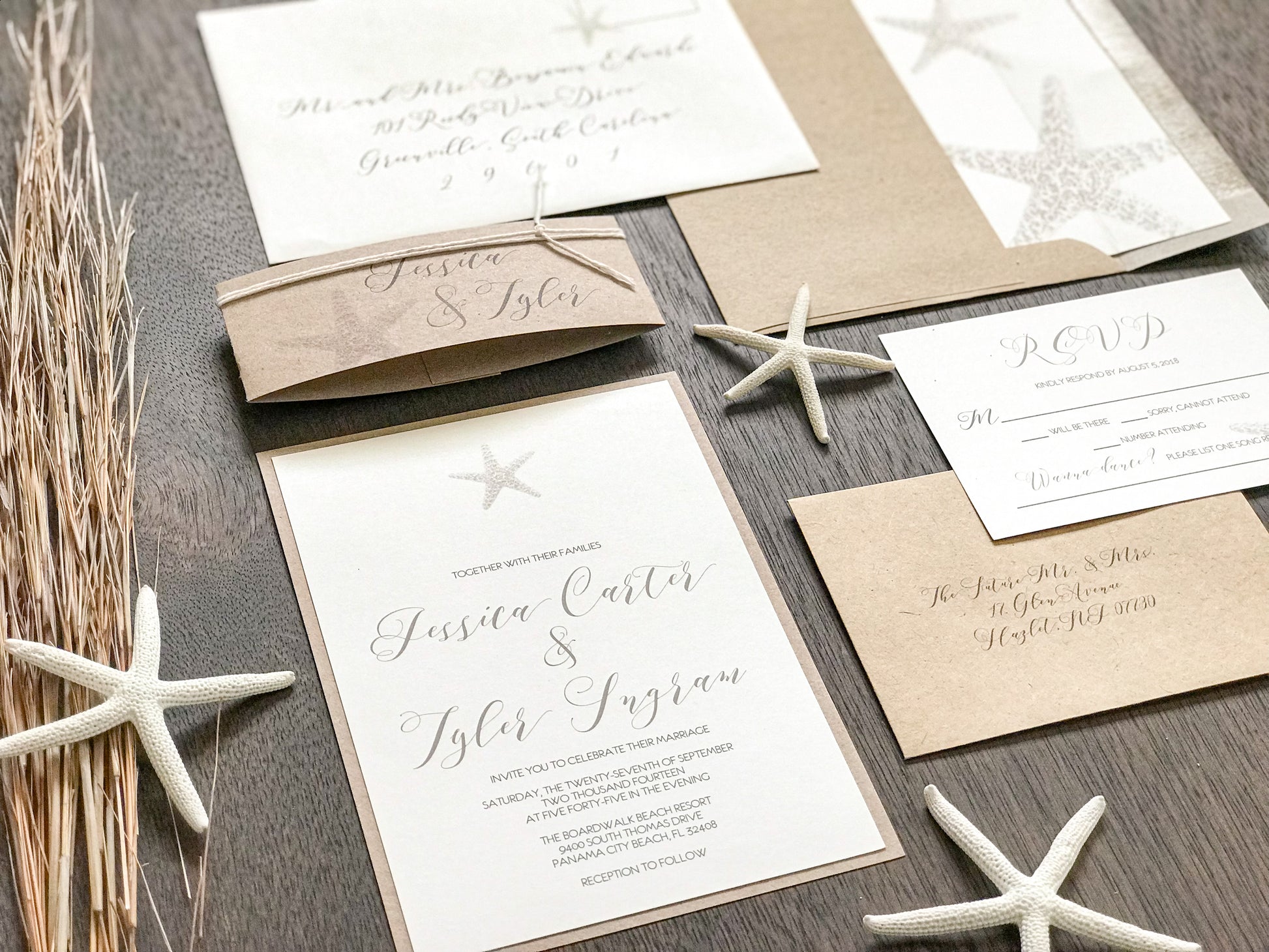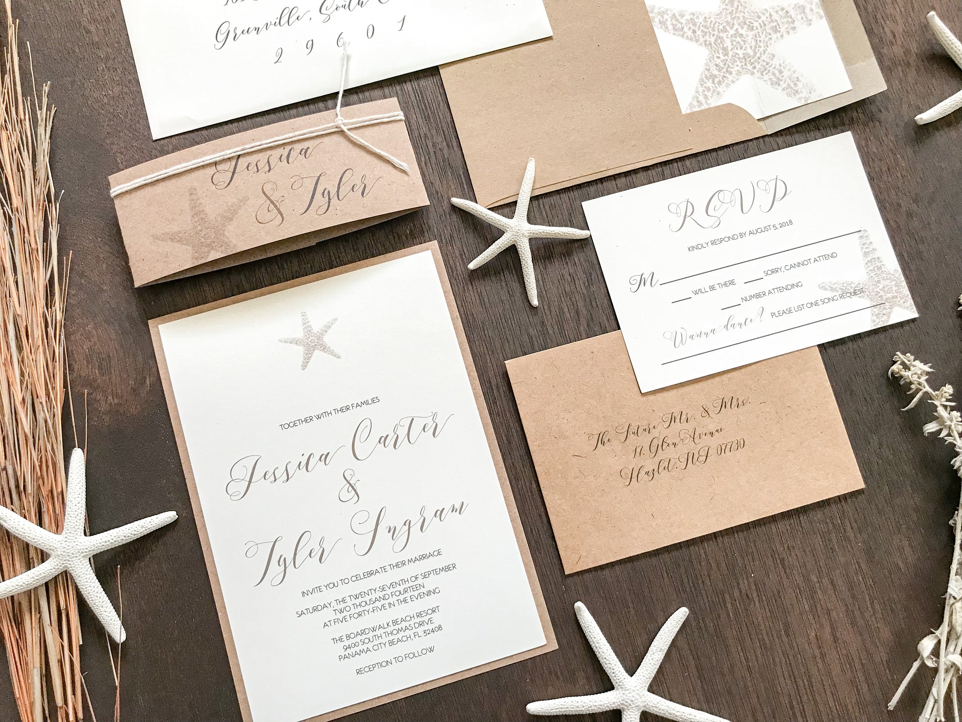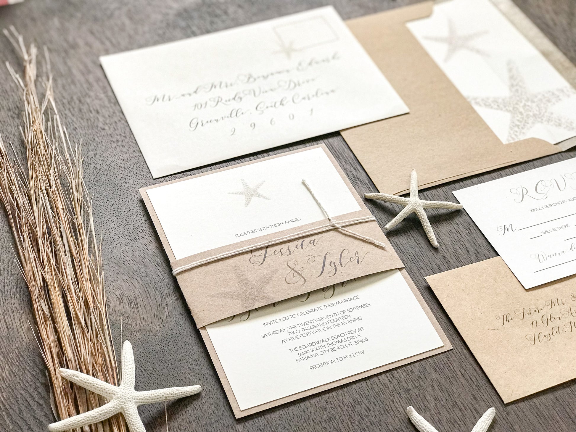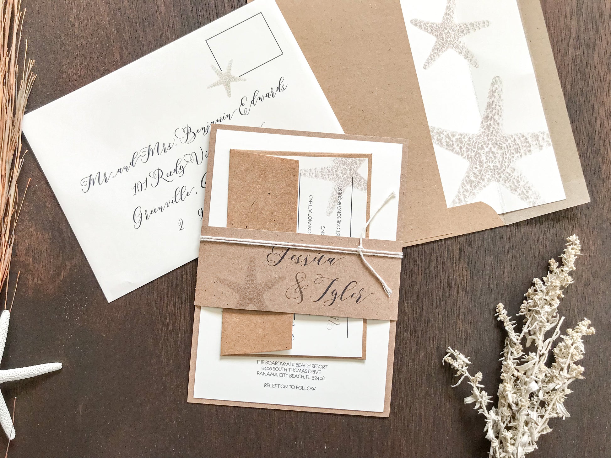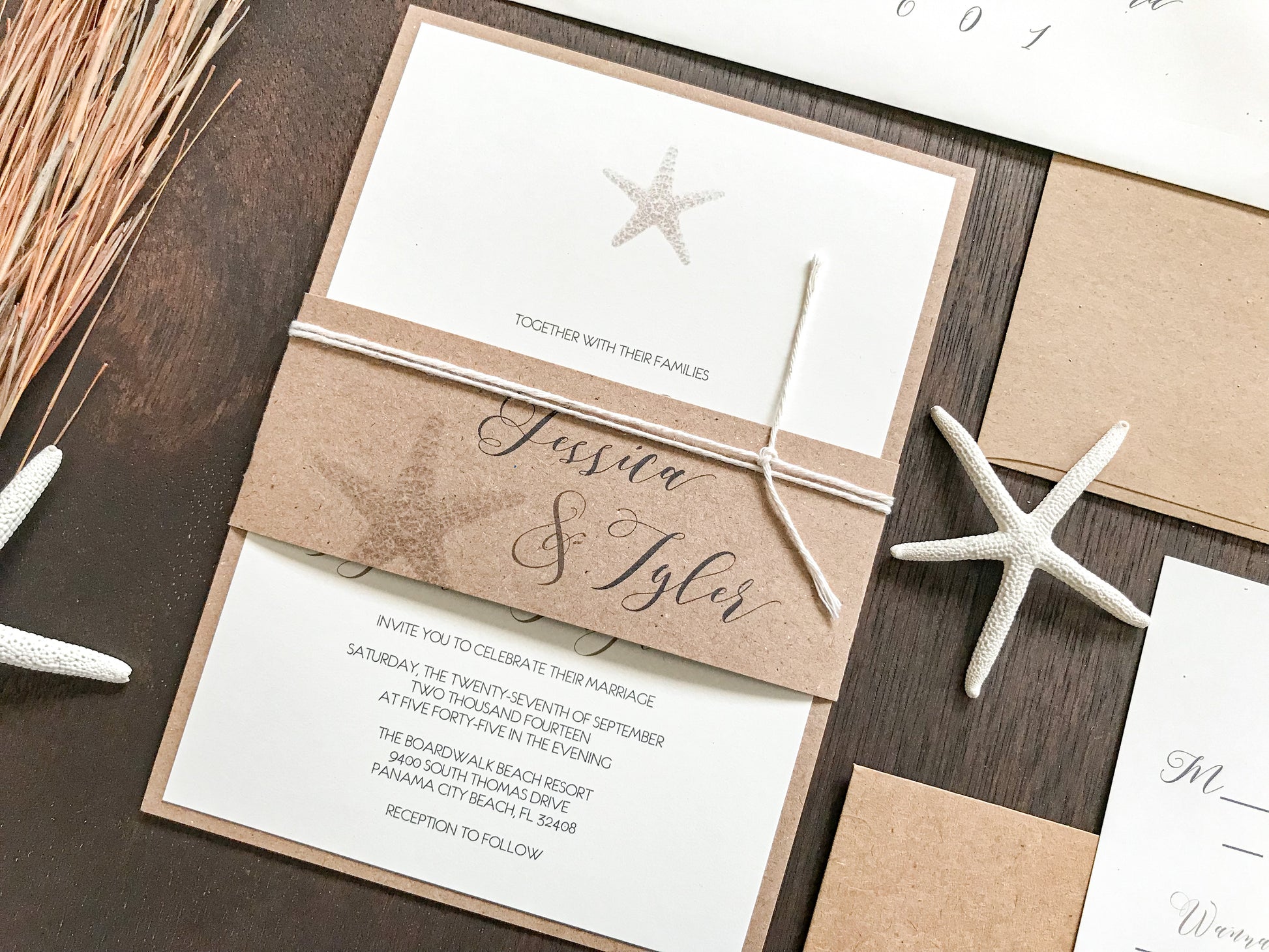 This charming rustic starfish wedding invitation is printed on smooth ivory cover stock and matted to a kraft backer. It is wrapped in a personalized kraft belly band and tied with delicate white cord twine, perfectly capturing a coastal-inspired, natural aesthetic!