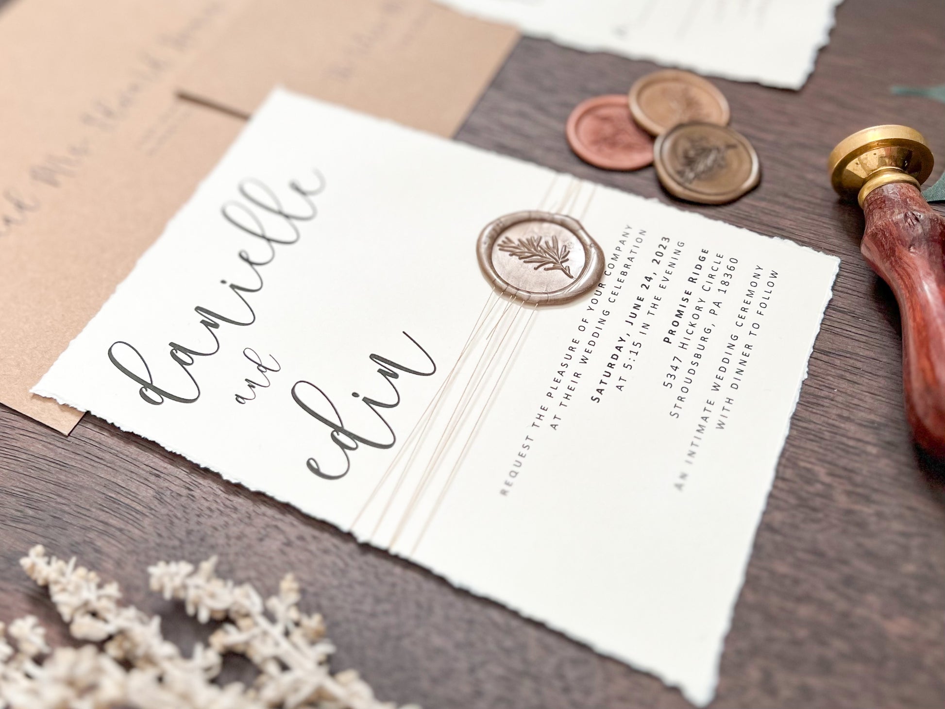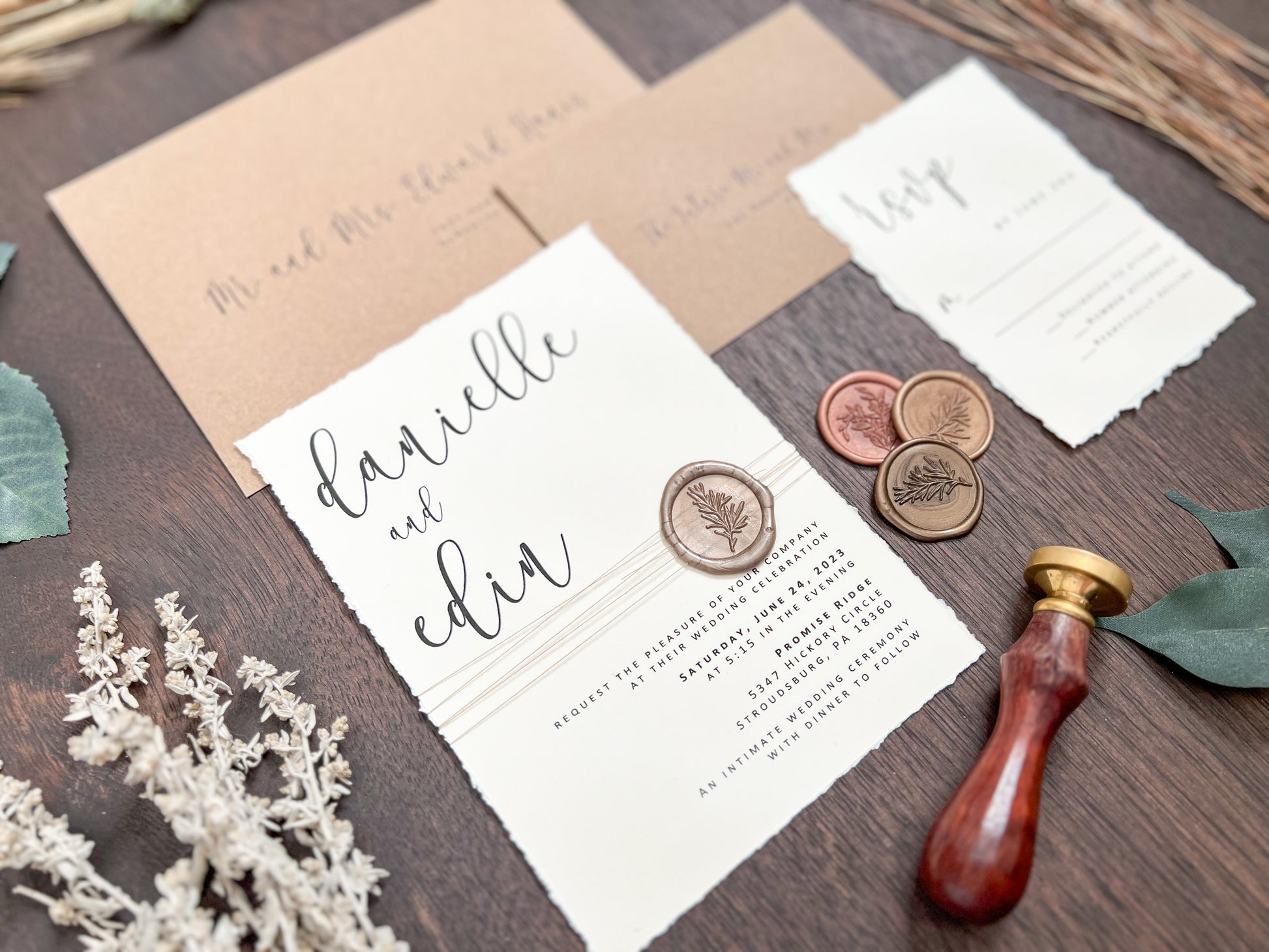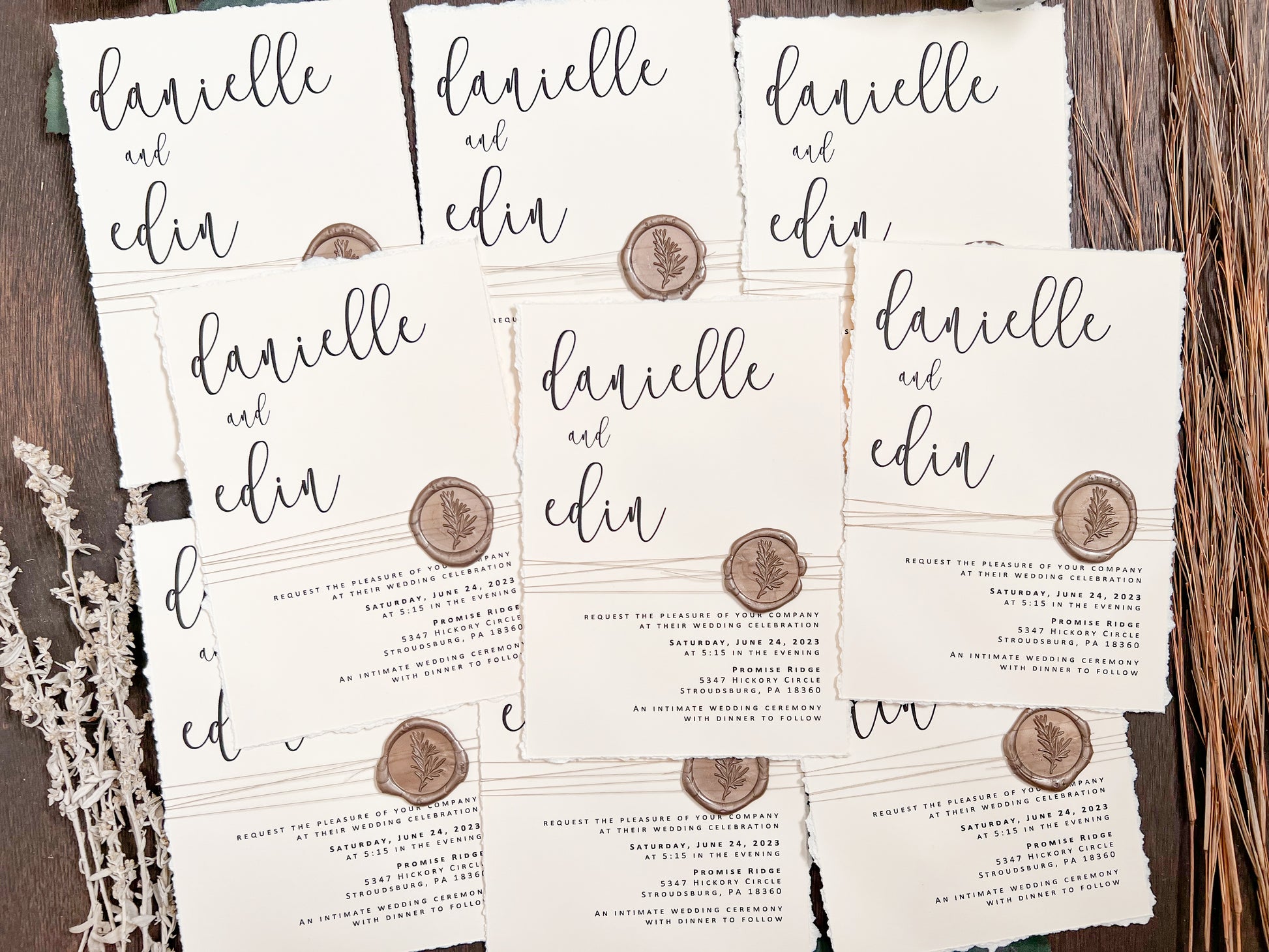 This elegant deckled edge wedding invitation is printed on 100 lb smooth ivory cover stock with hand torn edges. Wrapped in delicate khaki thread and secured with a botanical almond colored wax seal! There are many wax colors available. Please inquire if you are looking for a specific color. Invitation can also be printed on white stock as well. Just add the color change in the notes at checkout.