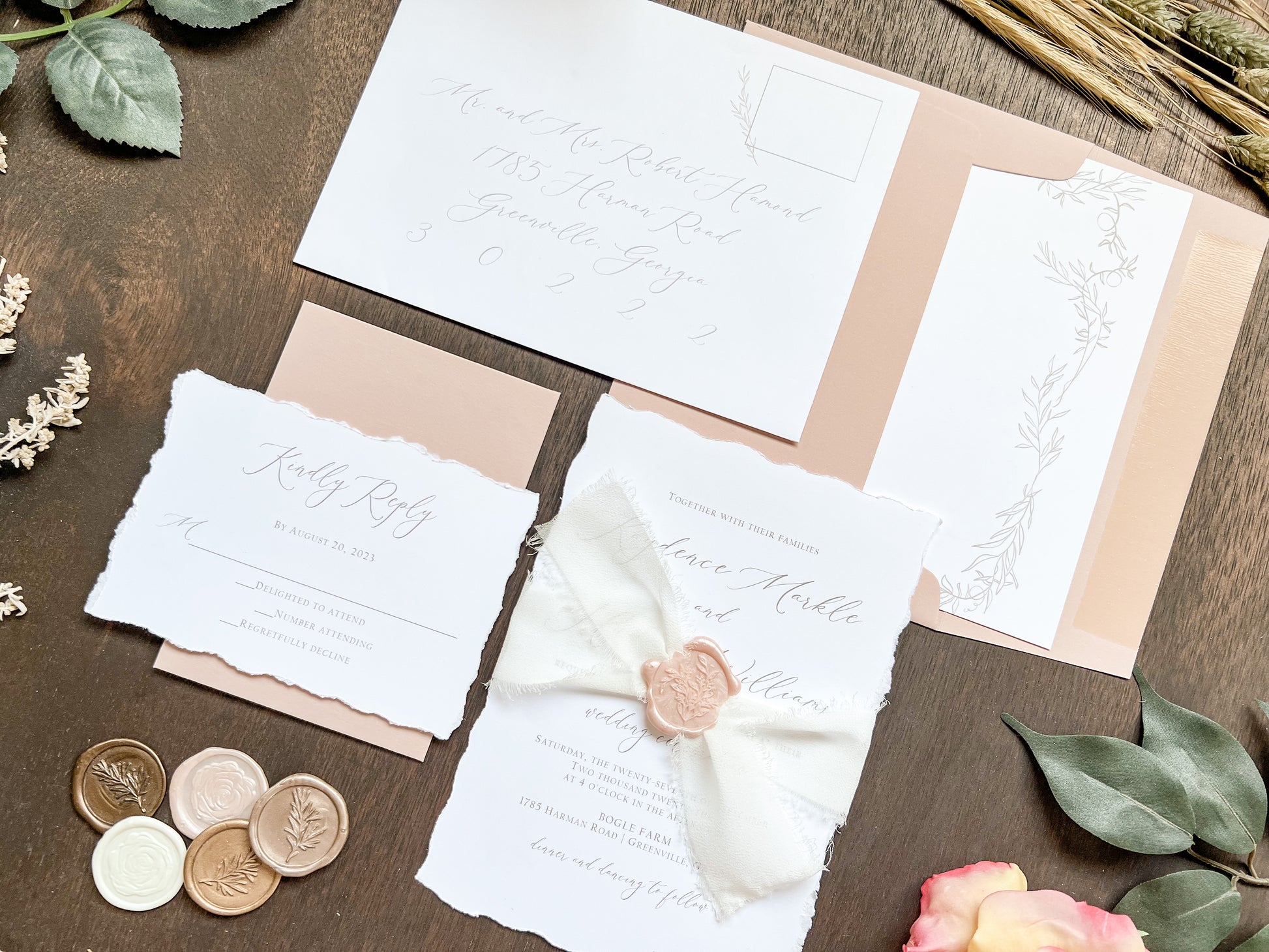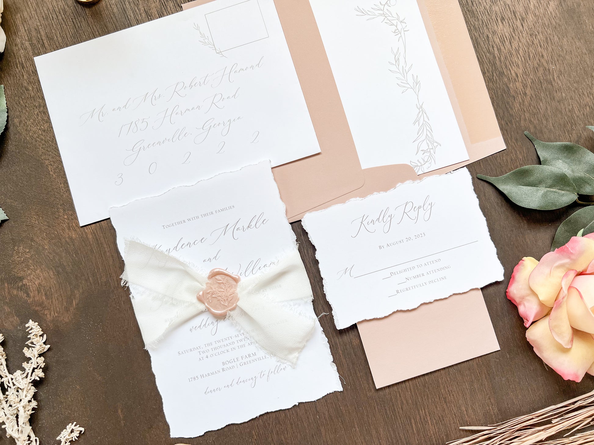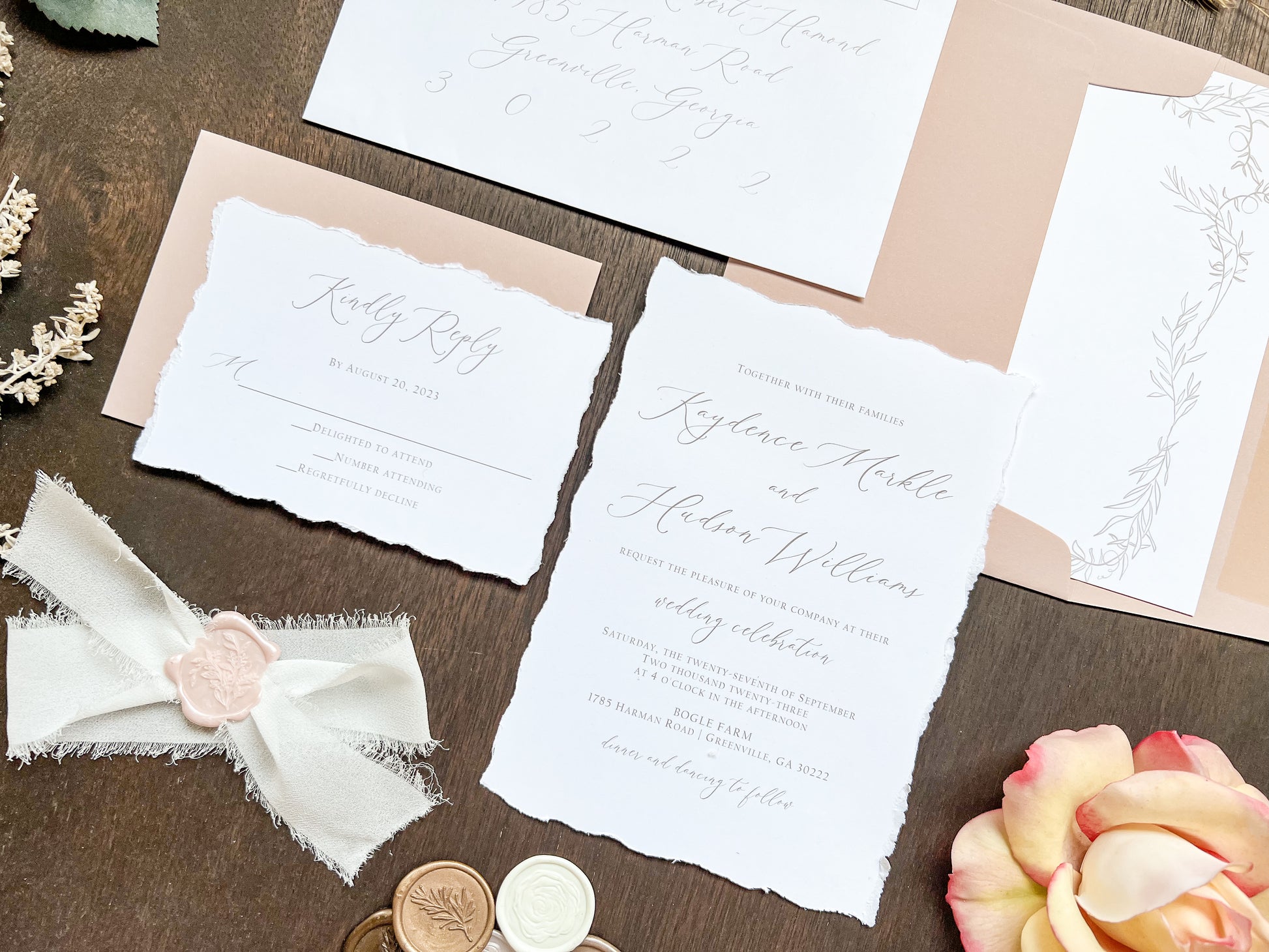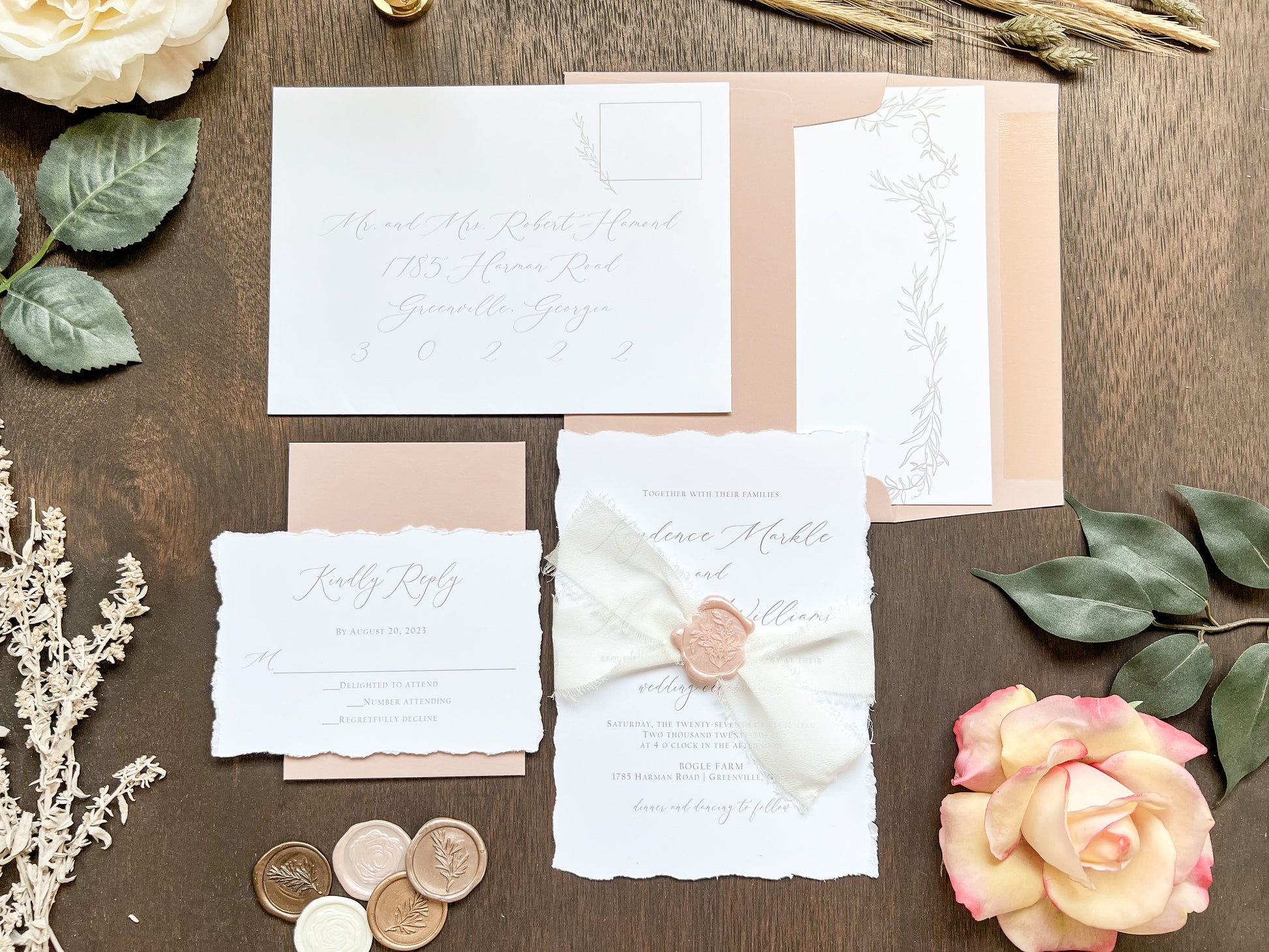 This elegant traditional style wedding invitation is printed on 100lb white cover stock with deckled (hand torn) edging. Invitation is wrapped in a white chiffon ribbon with a blush pink botanical wax seal. Other wax and ribbon colors available. Please inquire for your color of choice. Can also be printed on ivory or beige stock as well. Just add the color change in the notes at checkout. Pictures show upgraded light pink envelopes.